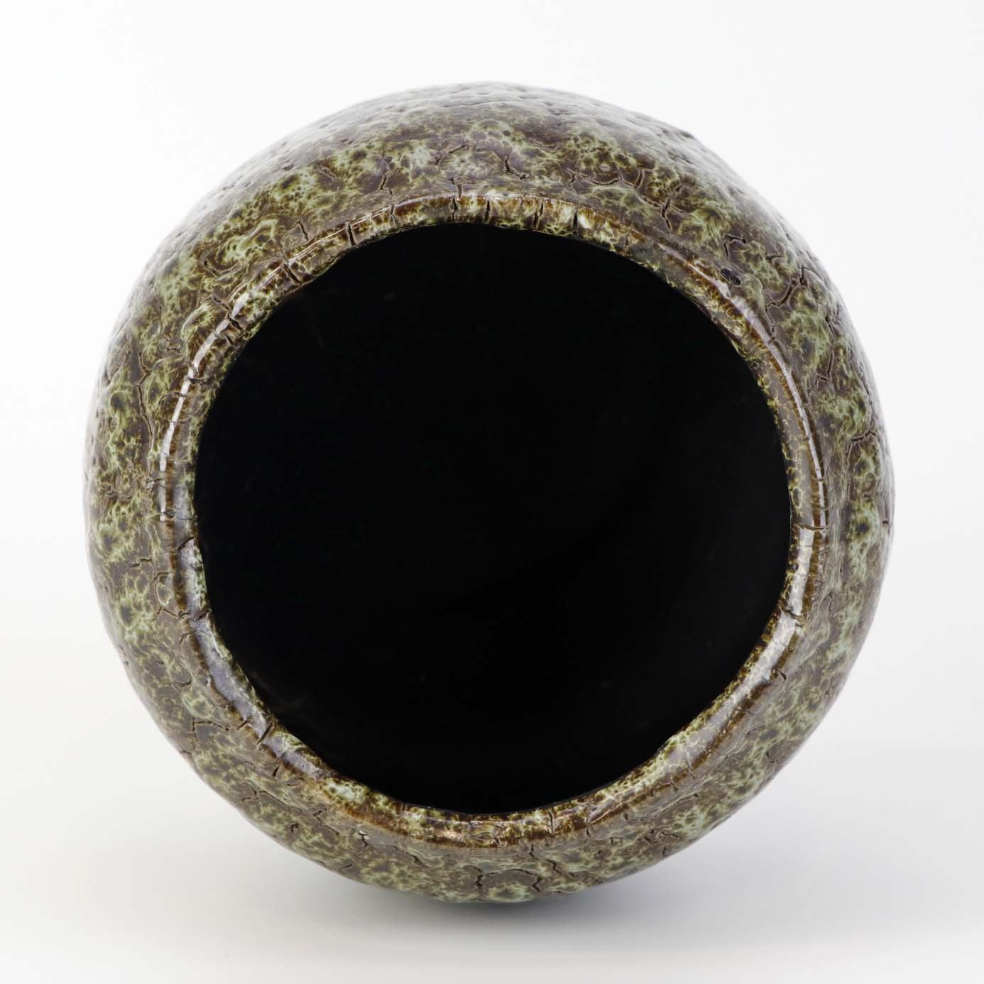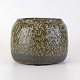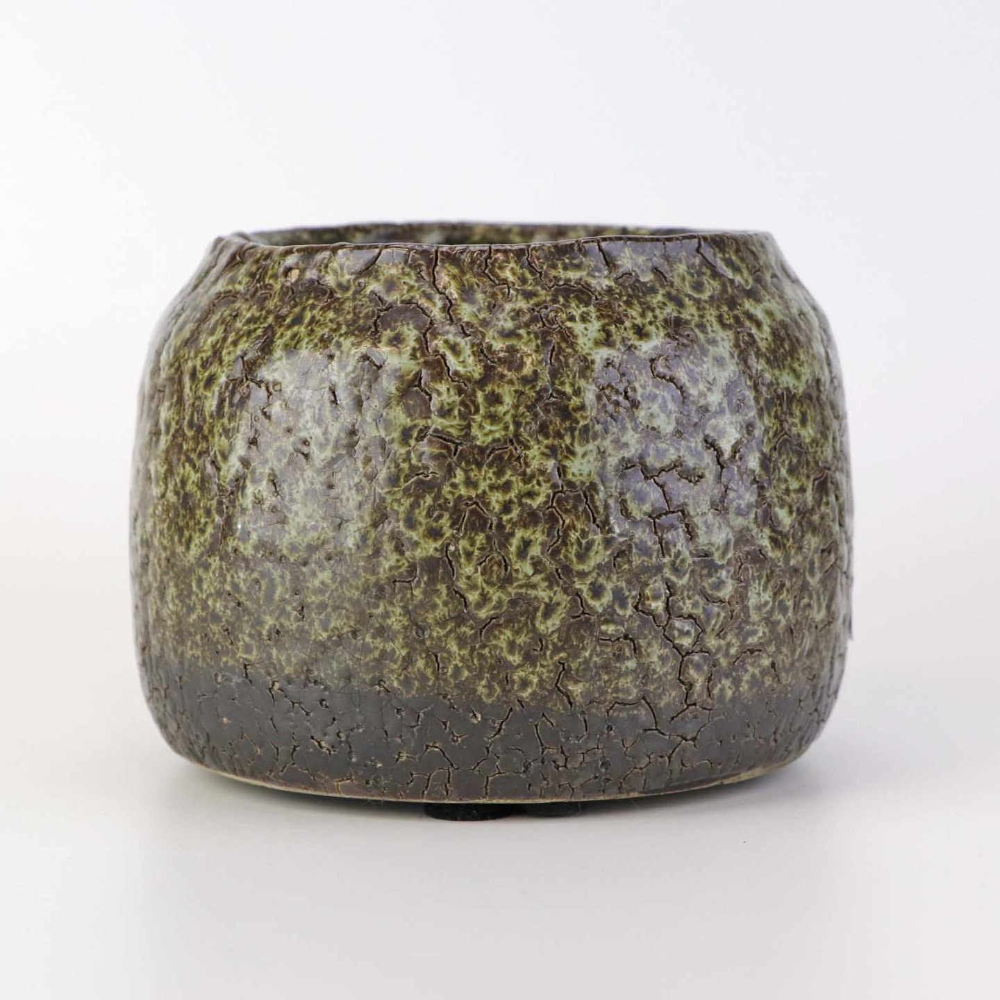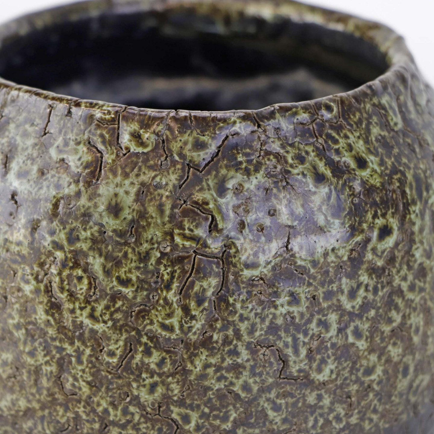Beskrivelse: Skjuler til urtepotte i glaseret keramik med krakkeleret mønster i grønbrune farver.