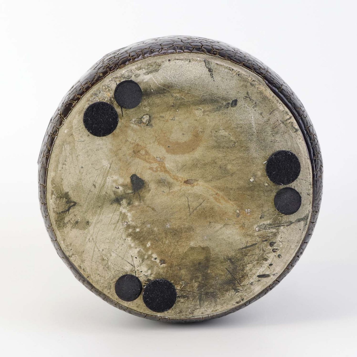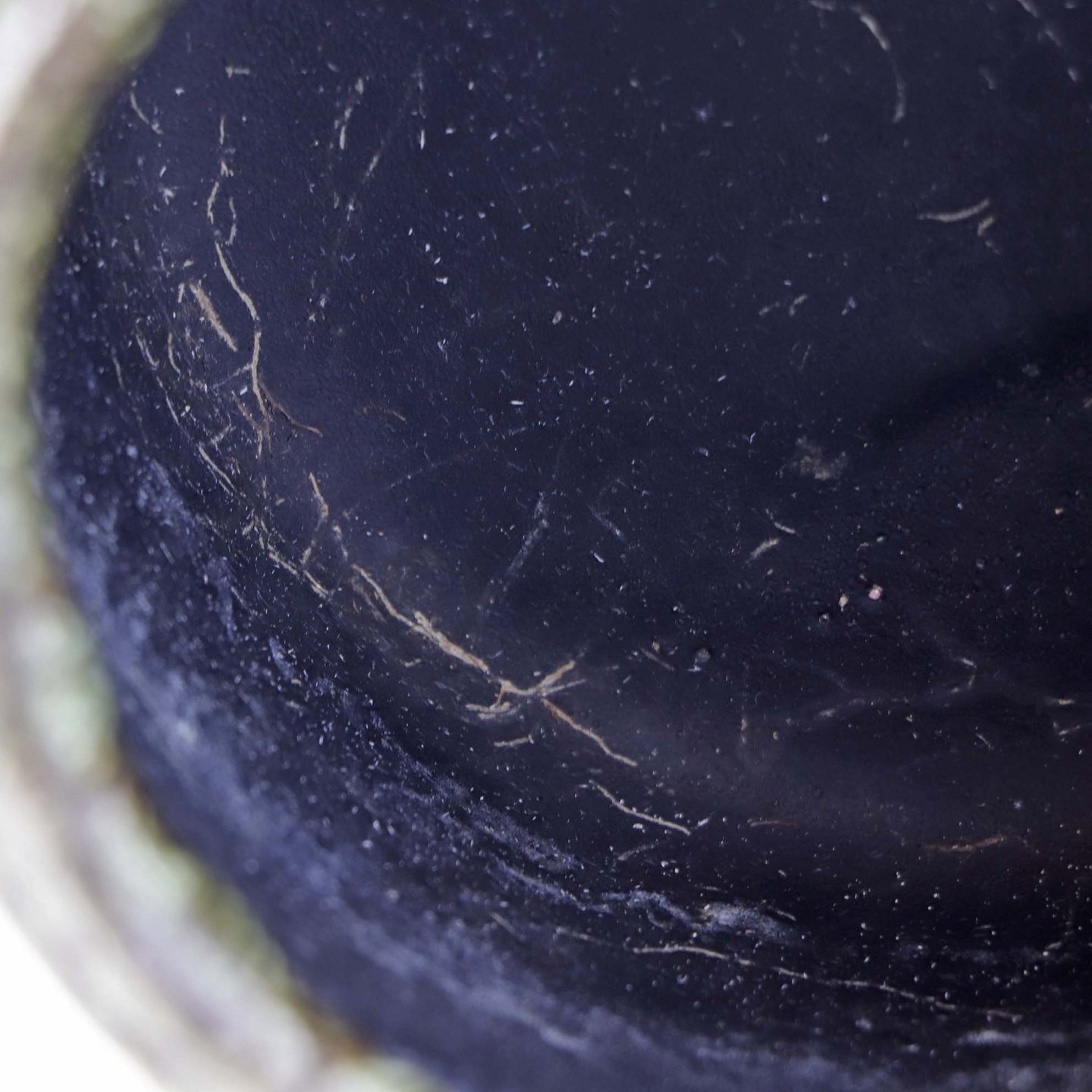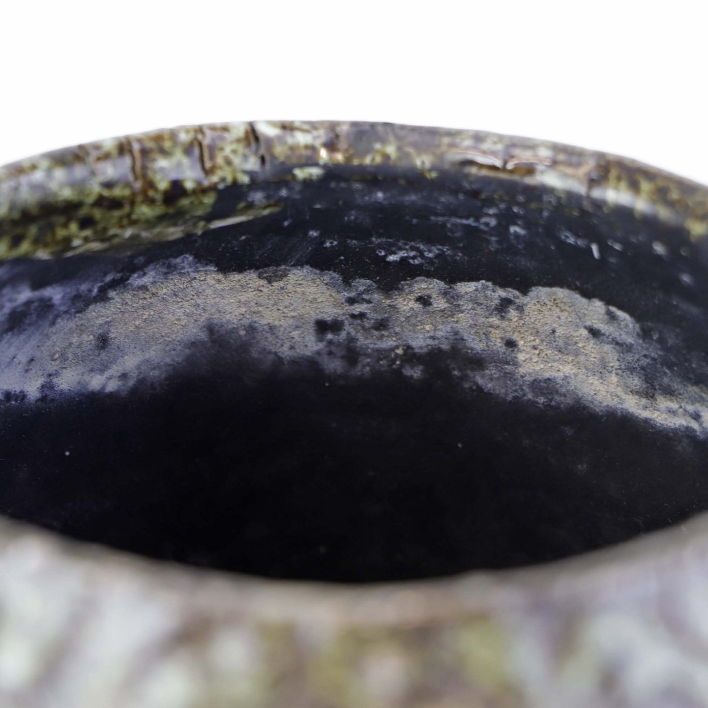 Beskrivelse: Skjuler til urtepotte i glaseret keramik med krakkeleret mønster i grønbrune farver.
