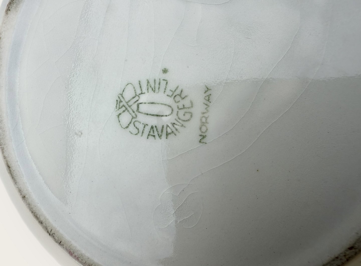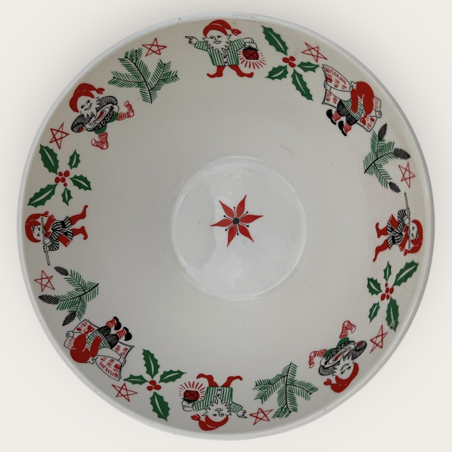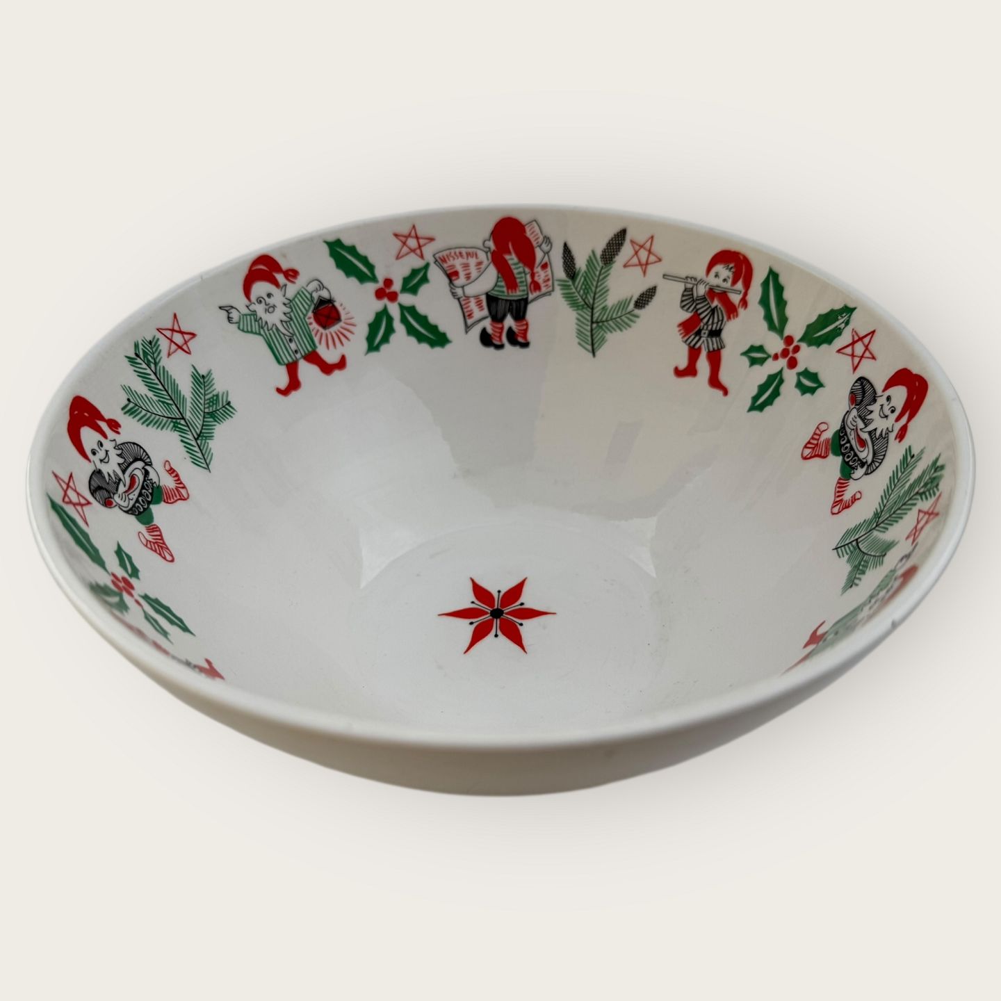 Beskrivelse: Stavanger Flint, Norge, Serverings skål med nisser, 21cm i diameter og 9,5cm høj *Lidt krakeleringer under glasuren ellers pæn stand*