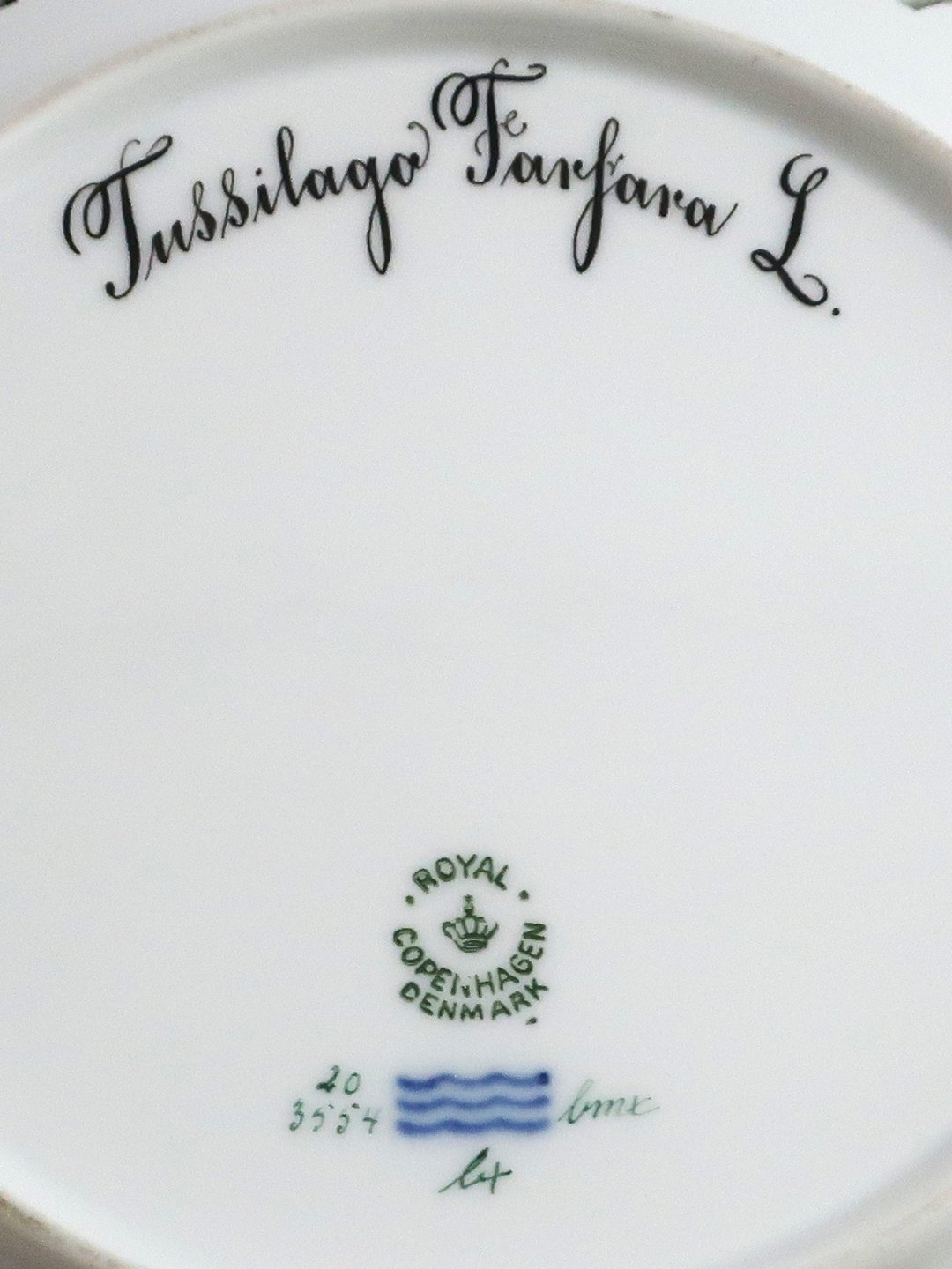 Description: Royal Copenhagen Flora Danica. Lunch plate with open-work border. Design # 3554. Diameter 23 cm. (1 quality). Tussilago farfara L