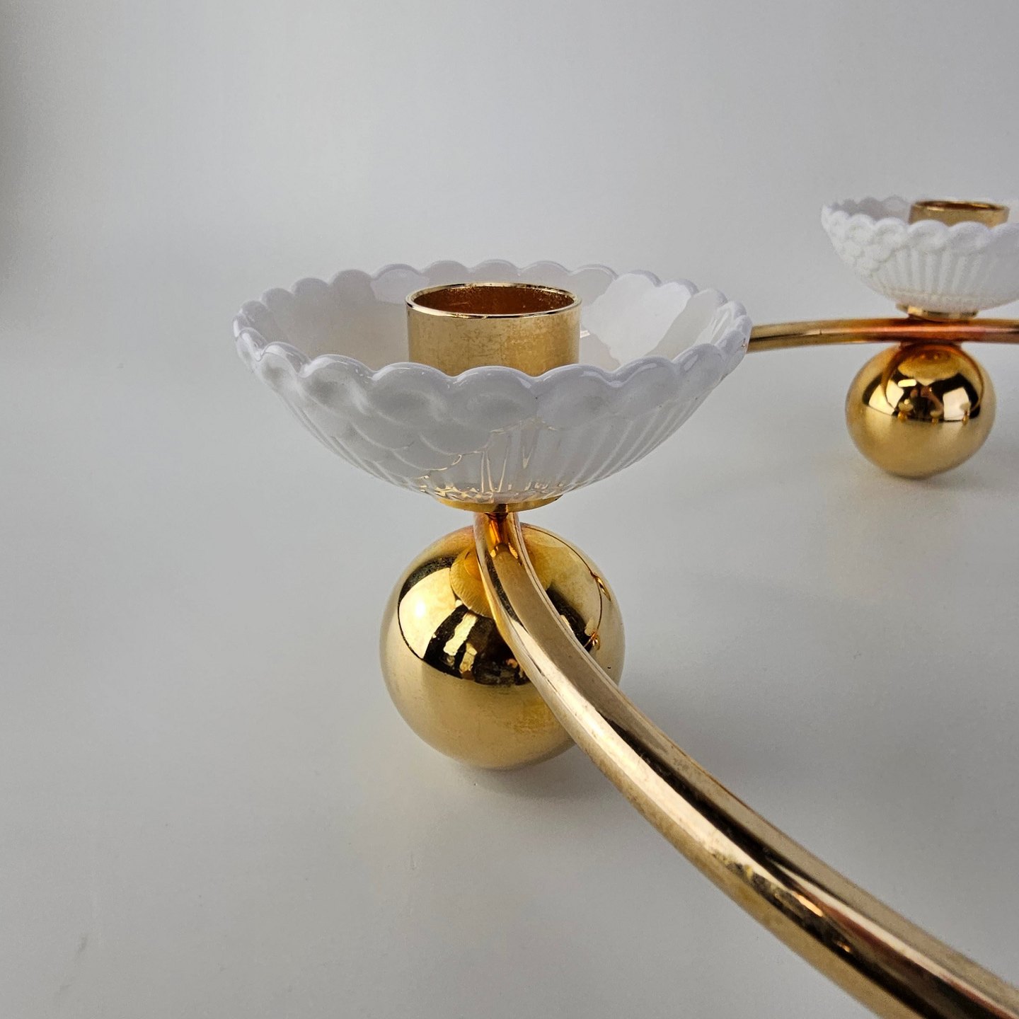 Beskrivelse: Rund lysestage i forgyldt messing med plads til fire lys i små hvide skåle af kongeligt porcelæn. Stagen er fra serien Creating Moments og kommer i original kasse