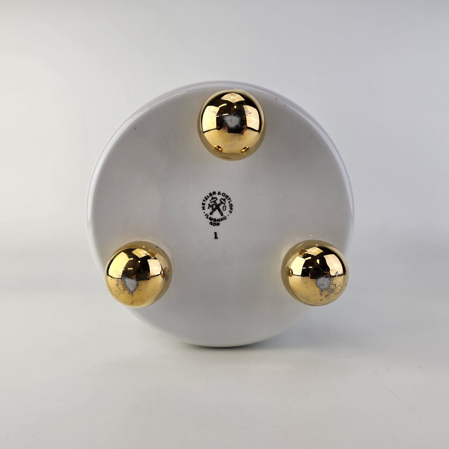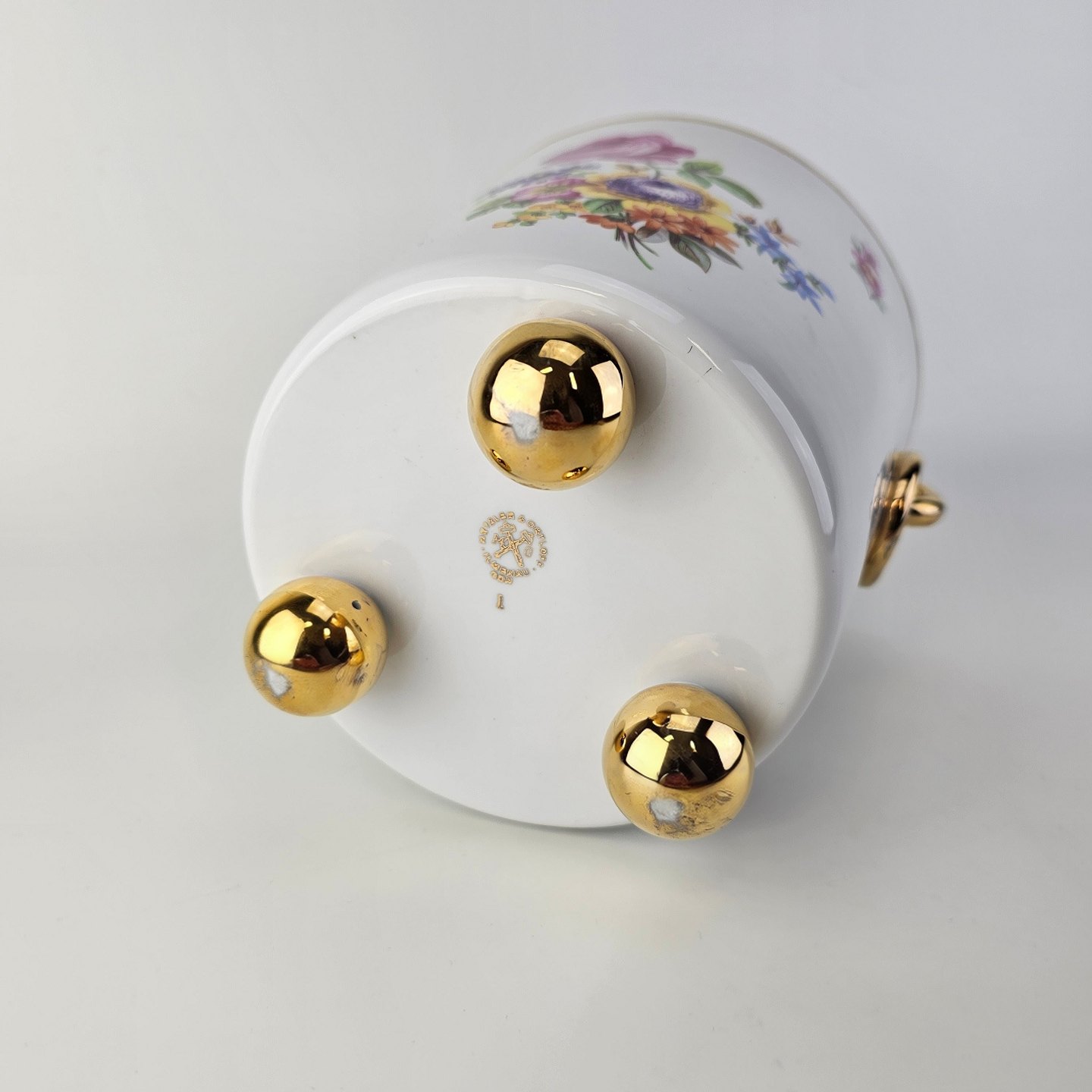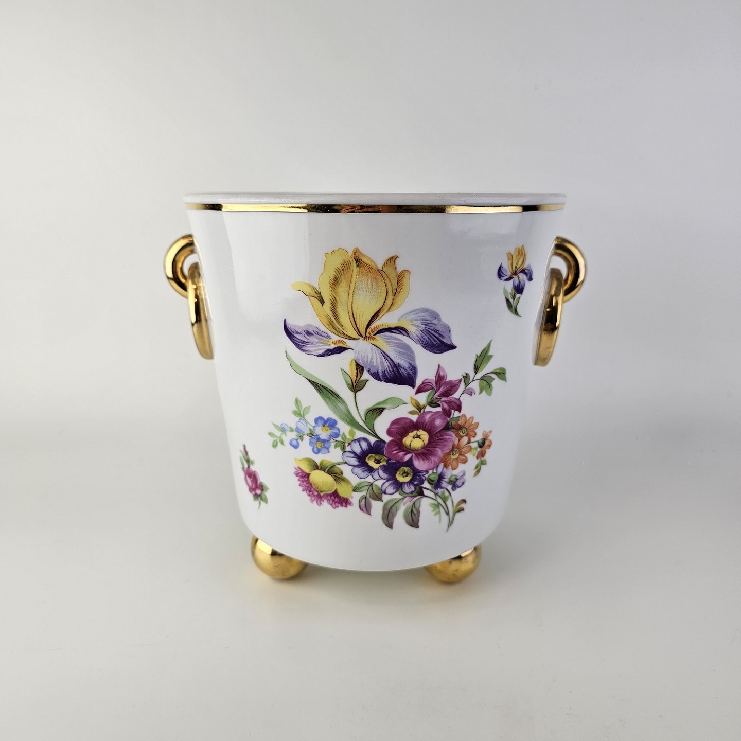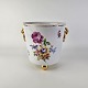Beskrivelse: Urtepotteskjuler i porcelæn med farverigt blomstermotiv med tre guldbelagt kuglefødder og to guldbelagt hanke,