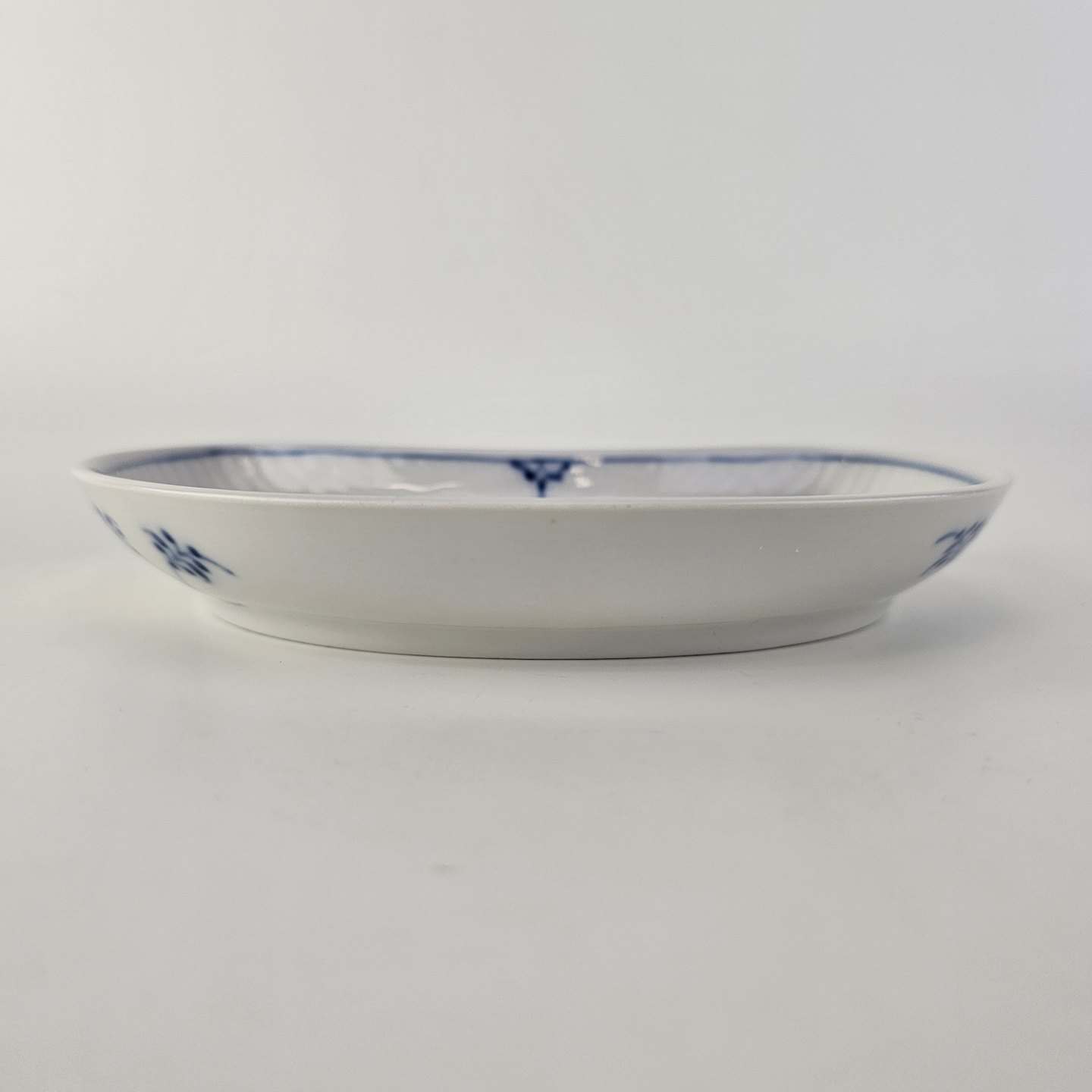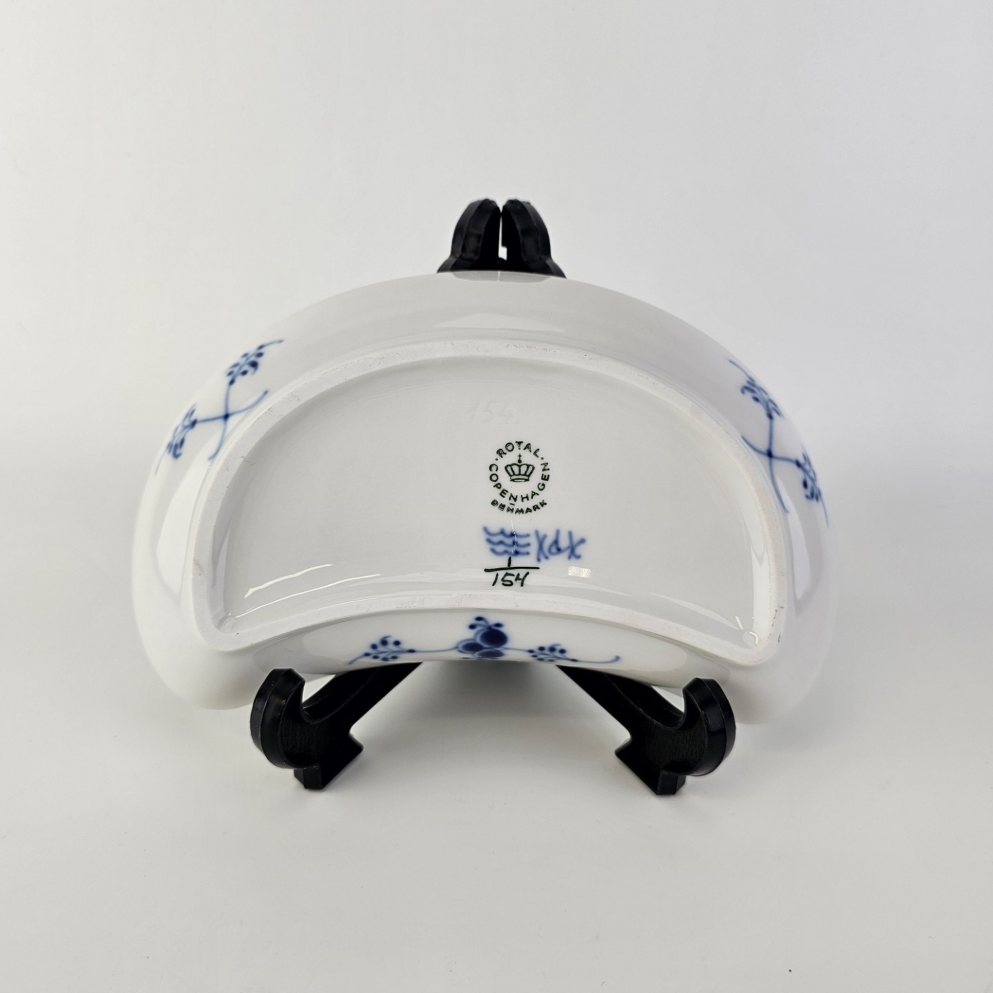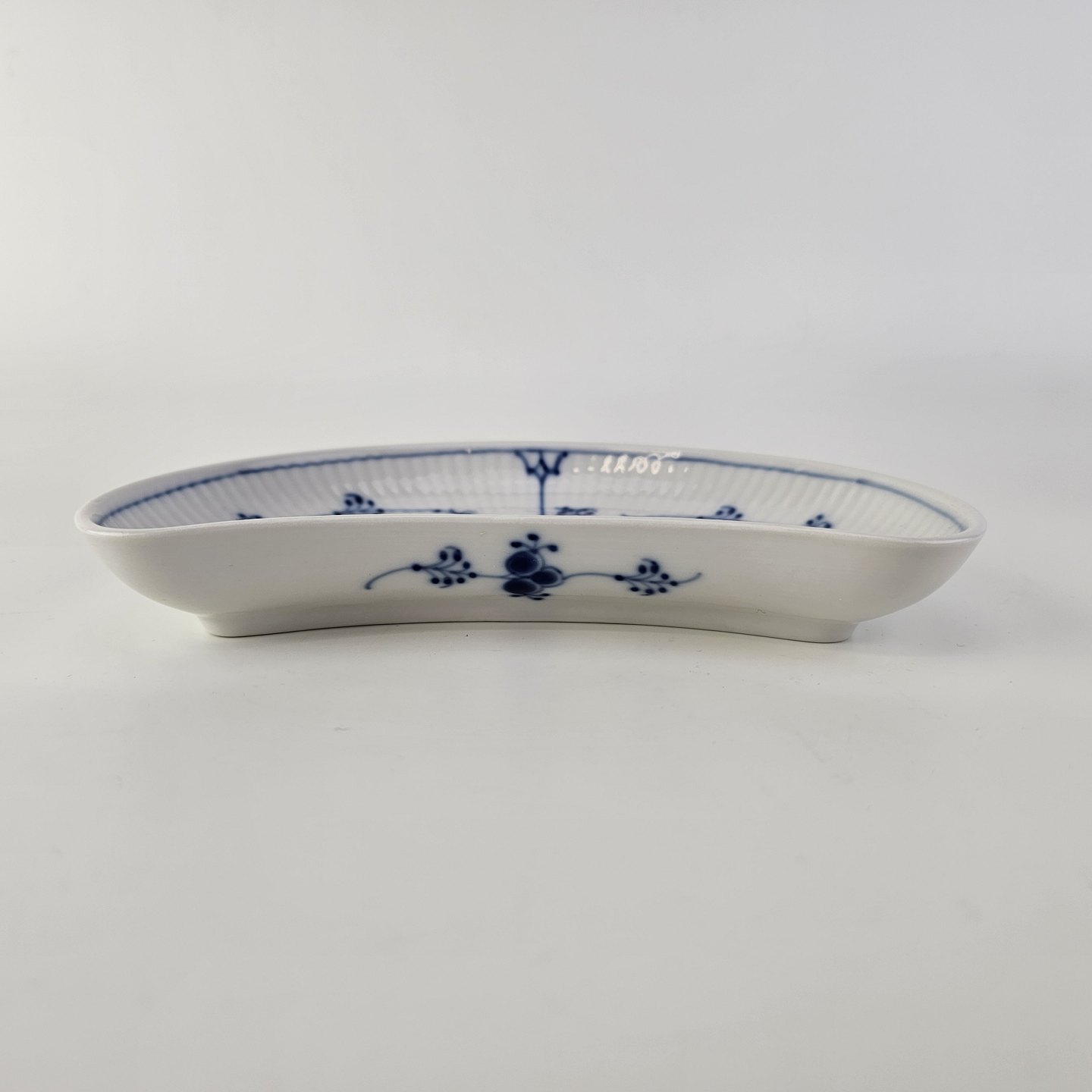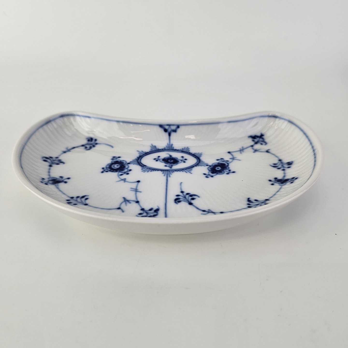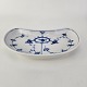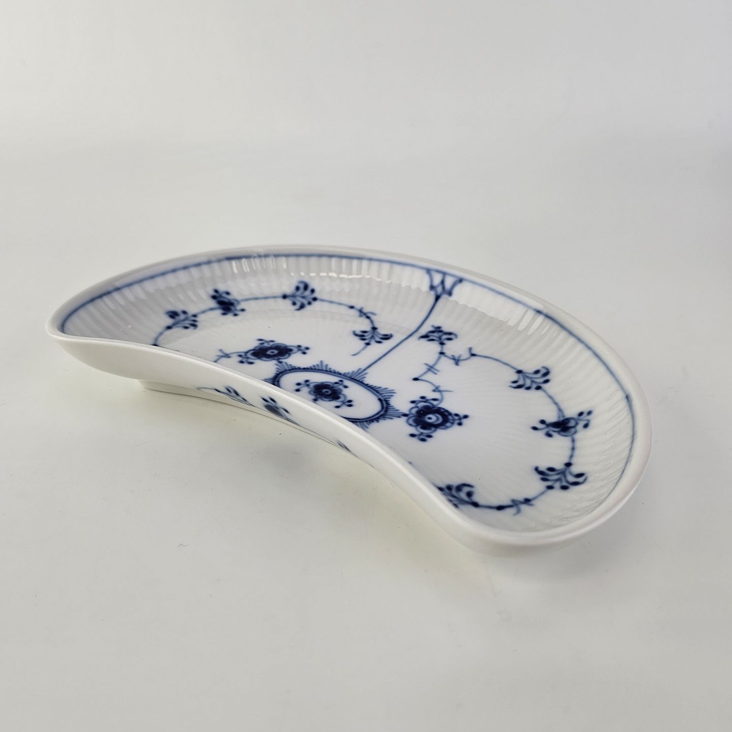 Beskrivelse: Halvmåneformet fad i kongeligt porcelæn fra stellet Musselmalet Halvblonde