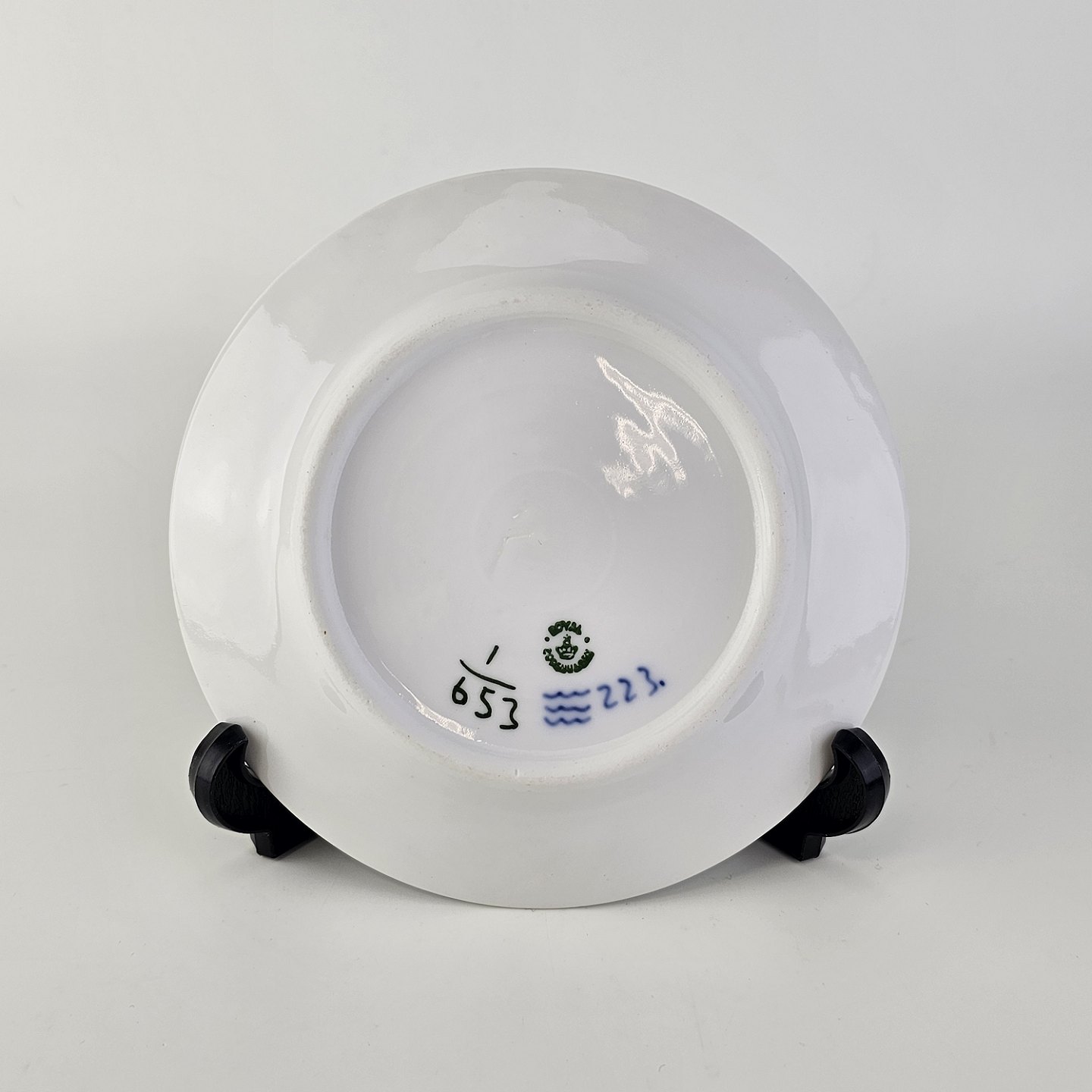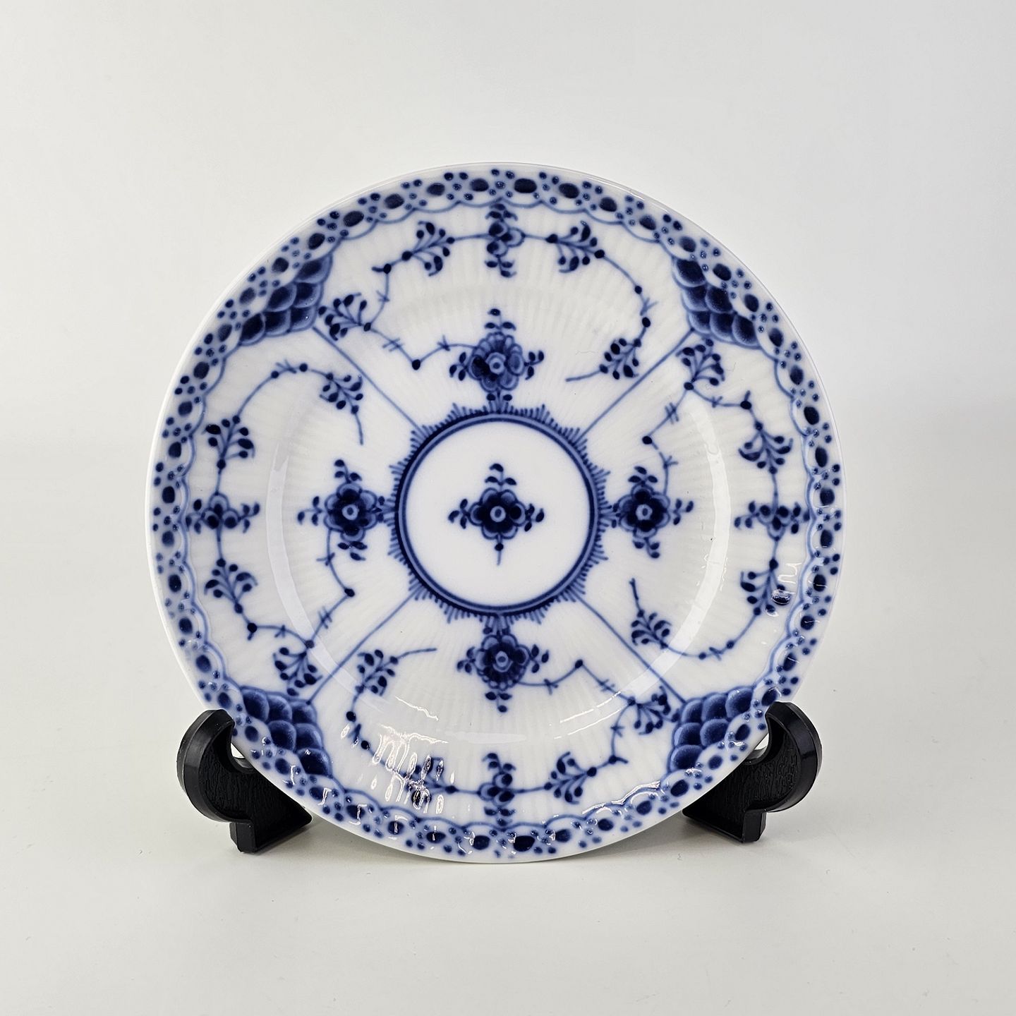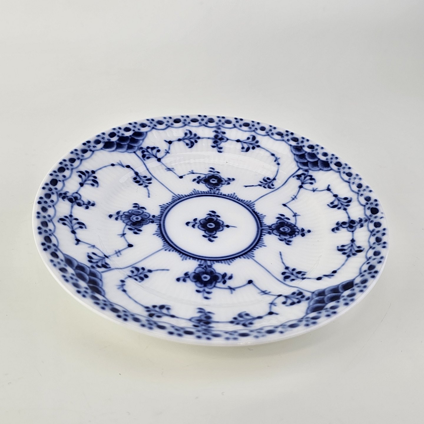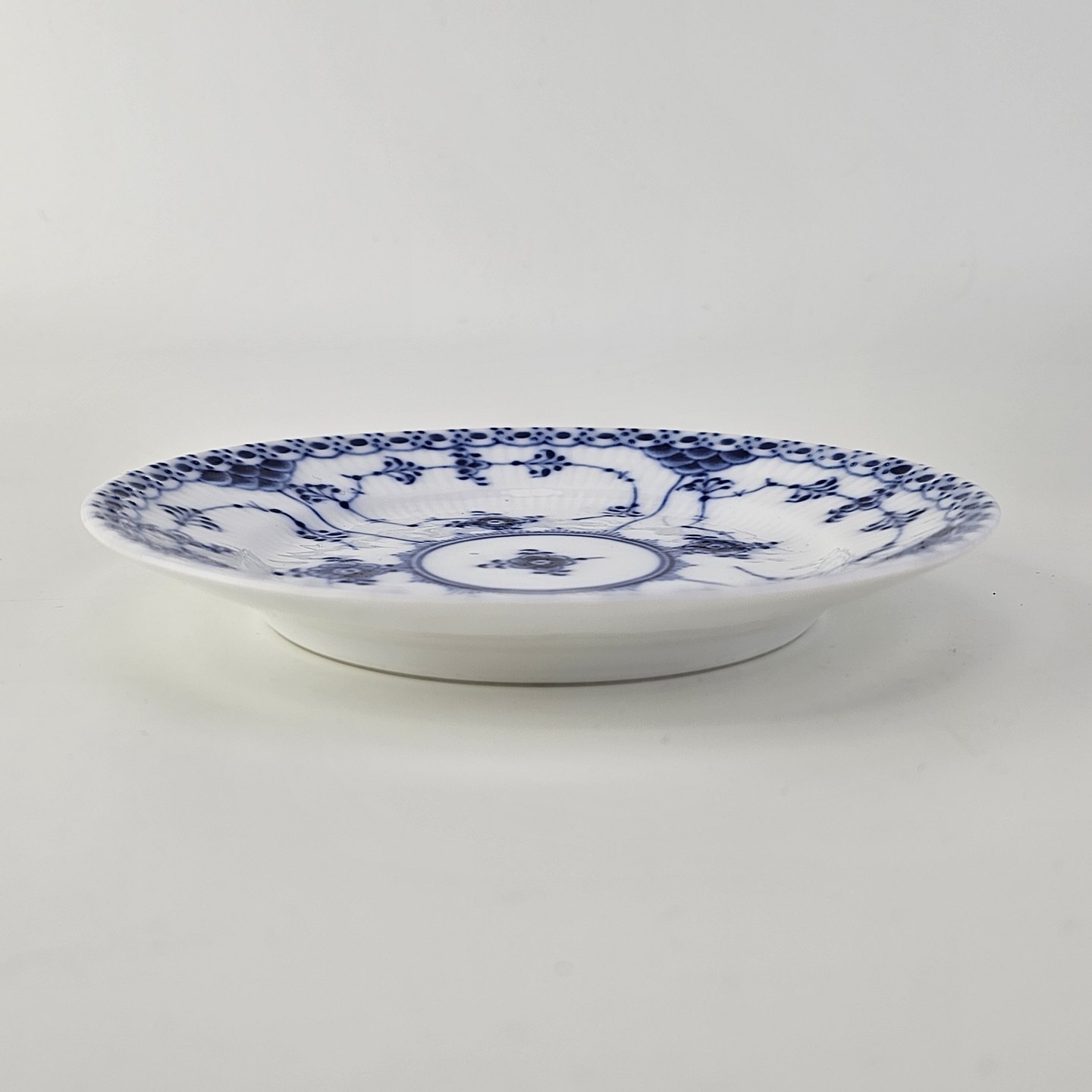 Beskrivelse: Flad kagetallerken i kongeligt porcelæn fra stellet Musselmalet Halvblonde