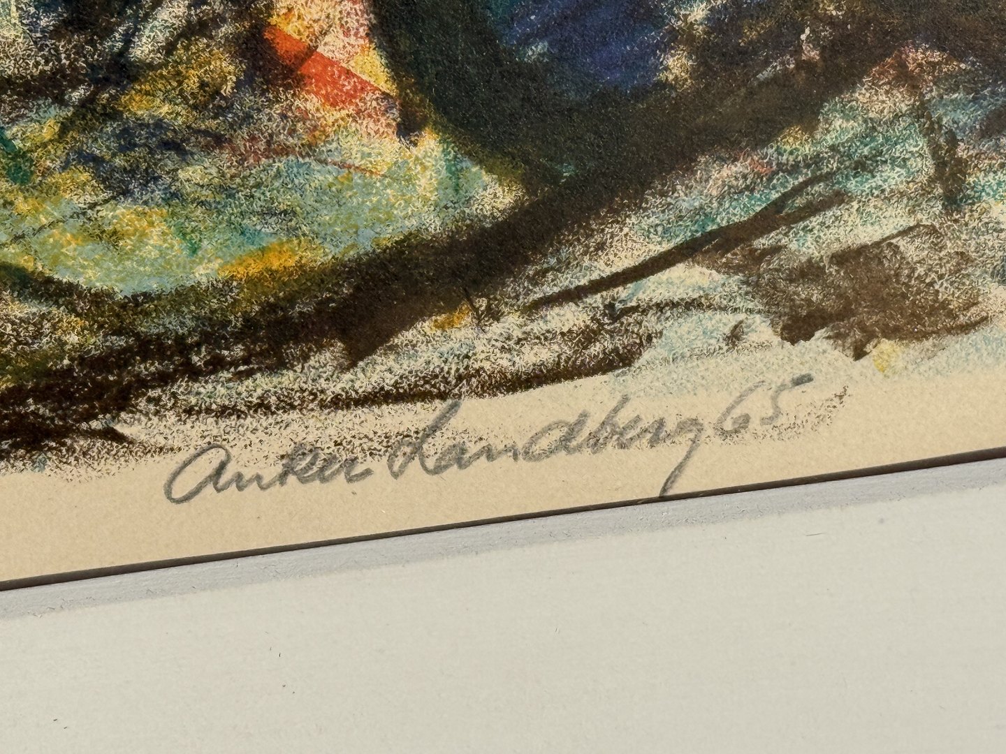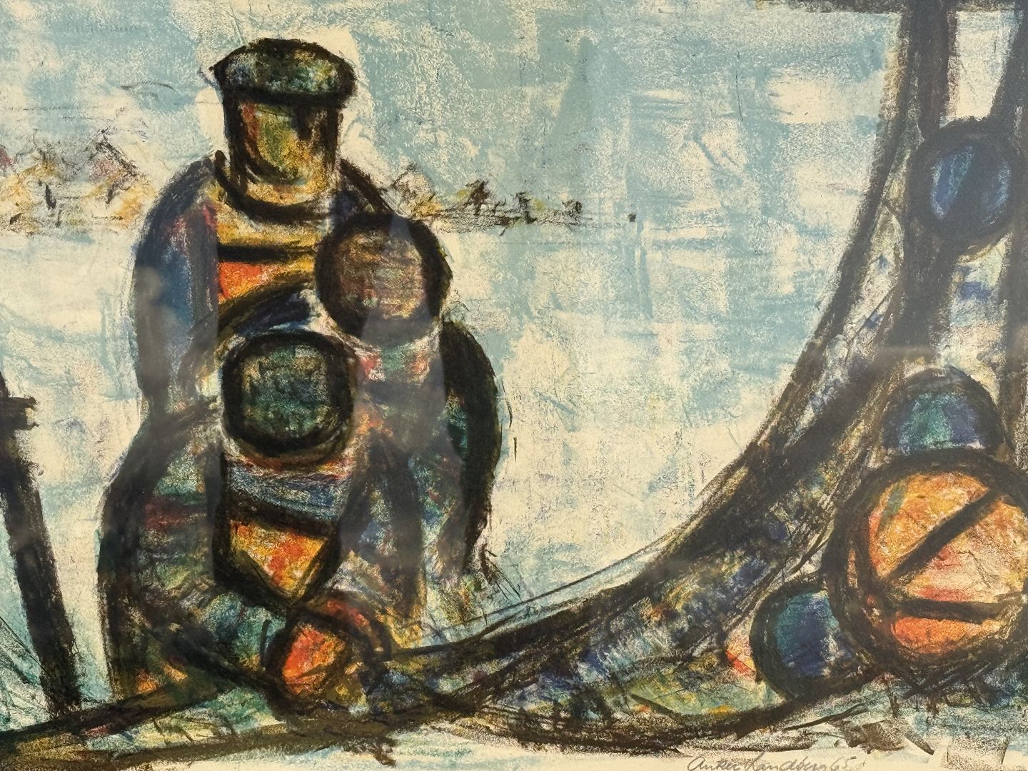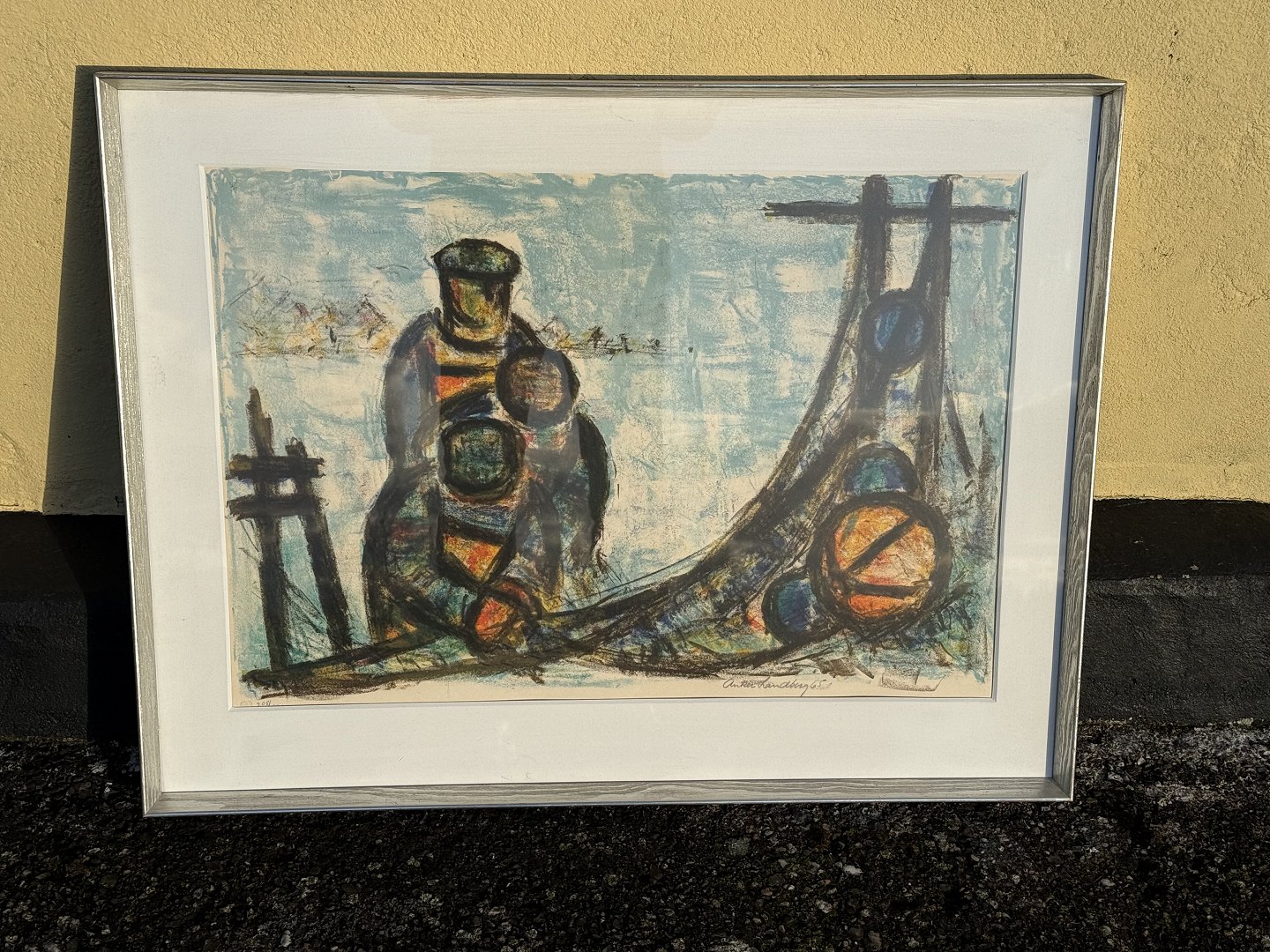 Beskrivelse: Anker Landberg, Litografi i ramme, Fiskere ordner garn, signeret Anker Landberg 65, Mål: 67x46cm, Mål med ramme: 82x63cm *fin stand*