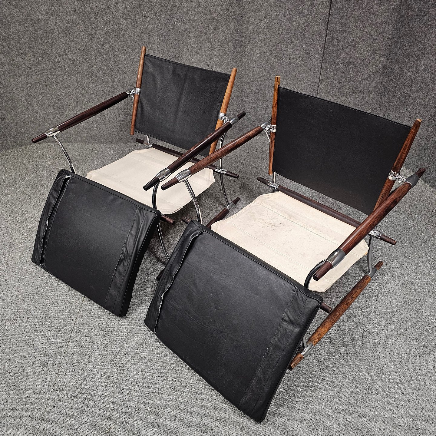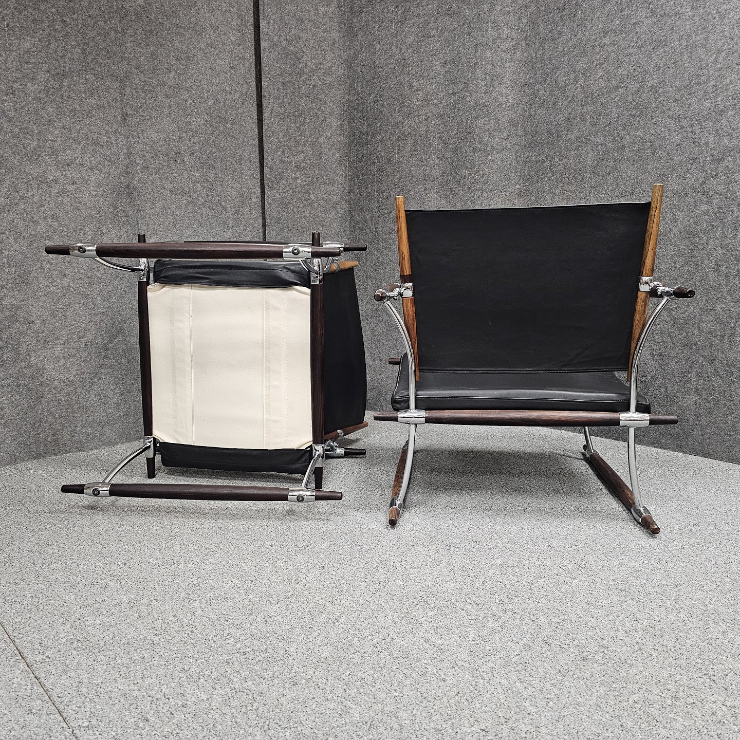 Beskrivelse: Sæt af to stokkestole med stel i palisander og forkromet stål og sæde af sort læder.