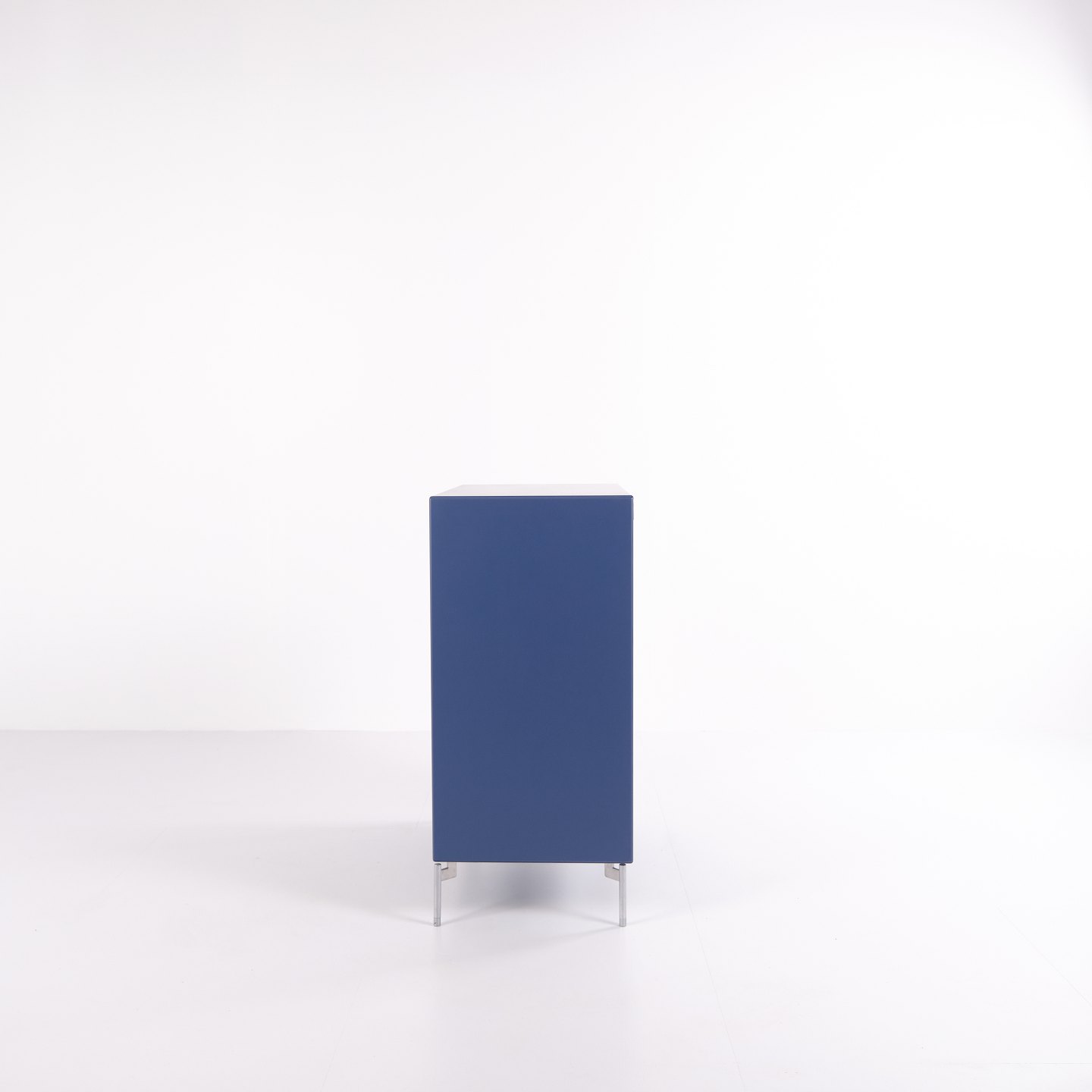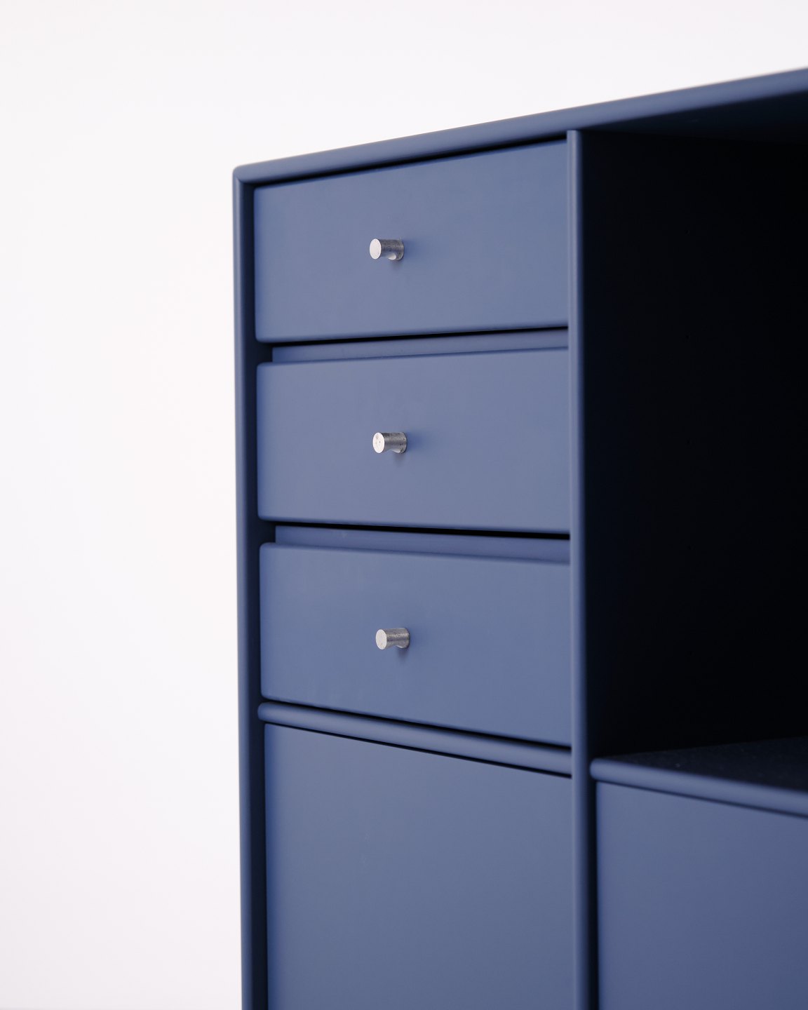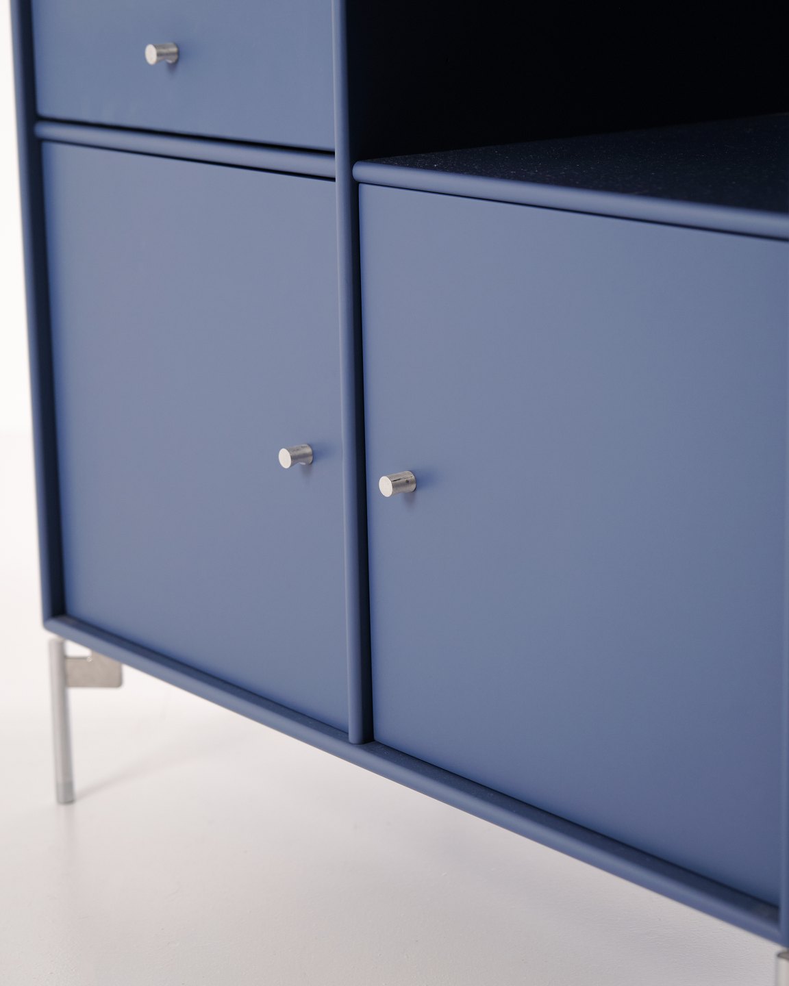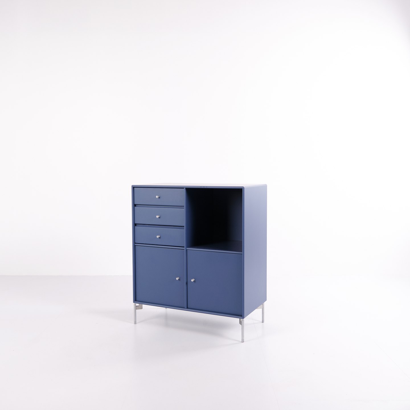 Beskrivelse: Montana kommode i blå med krom ben. Modulet er indrettet med tre skuffer og to låger, hvilket giver god og fleksibel opbevaringsplads. Klassisk Montana-design med enkel struktur og høj funktionalitet.