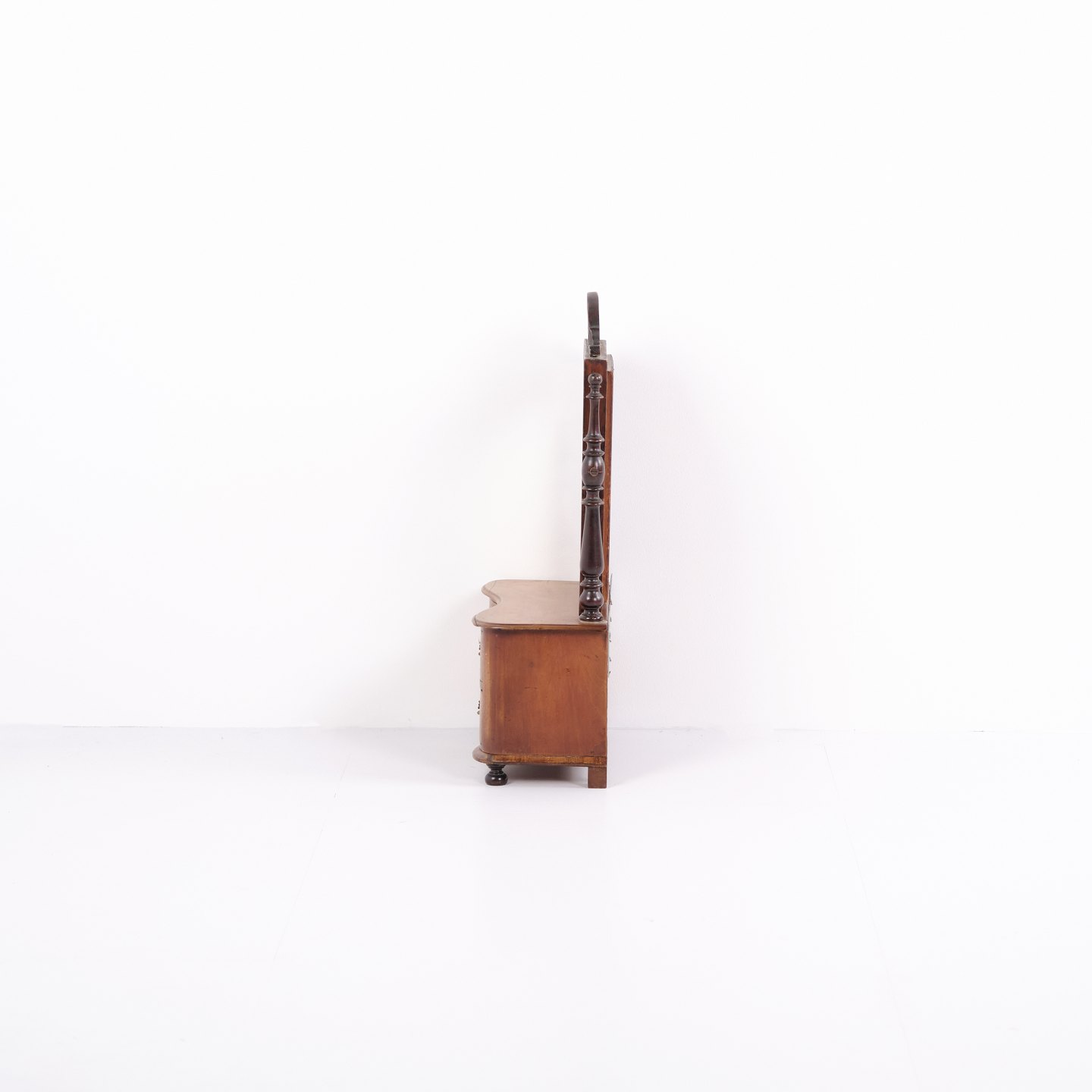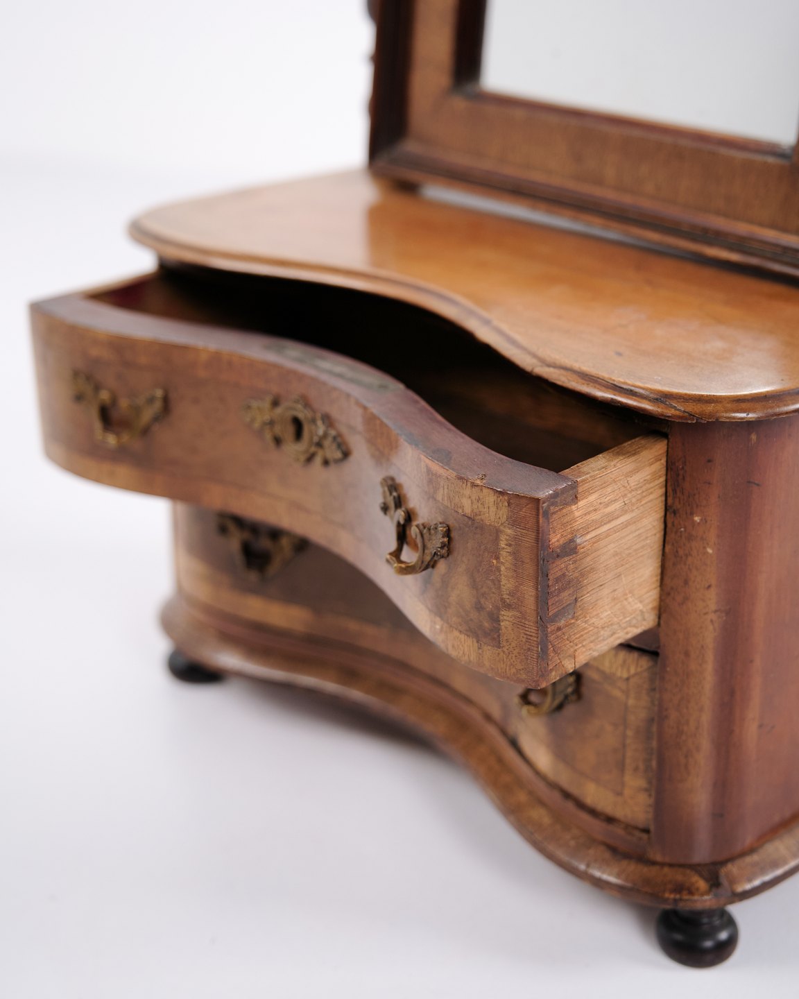 Beskrivelse: Lille barnemøbel fra ca. 1860, udført i mahogni med spejl og to skuffer. Et dekorativt og sjældent antikt møbel med fine detaljer, velegnet som samlerobjekt eller til klassisk indretning.
