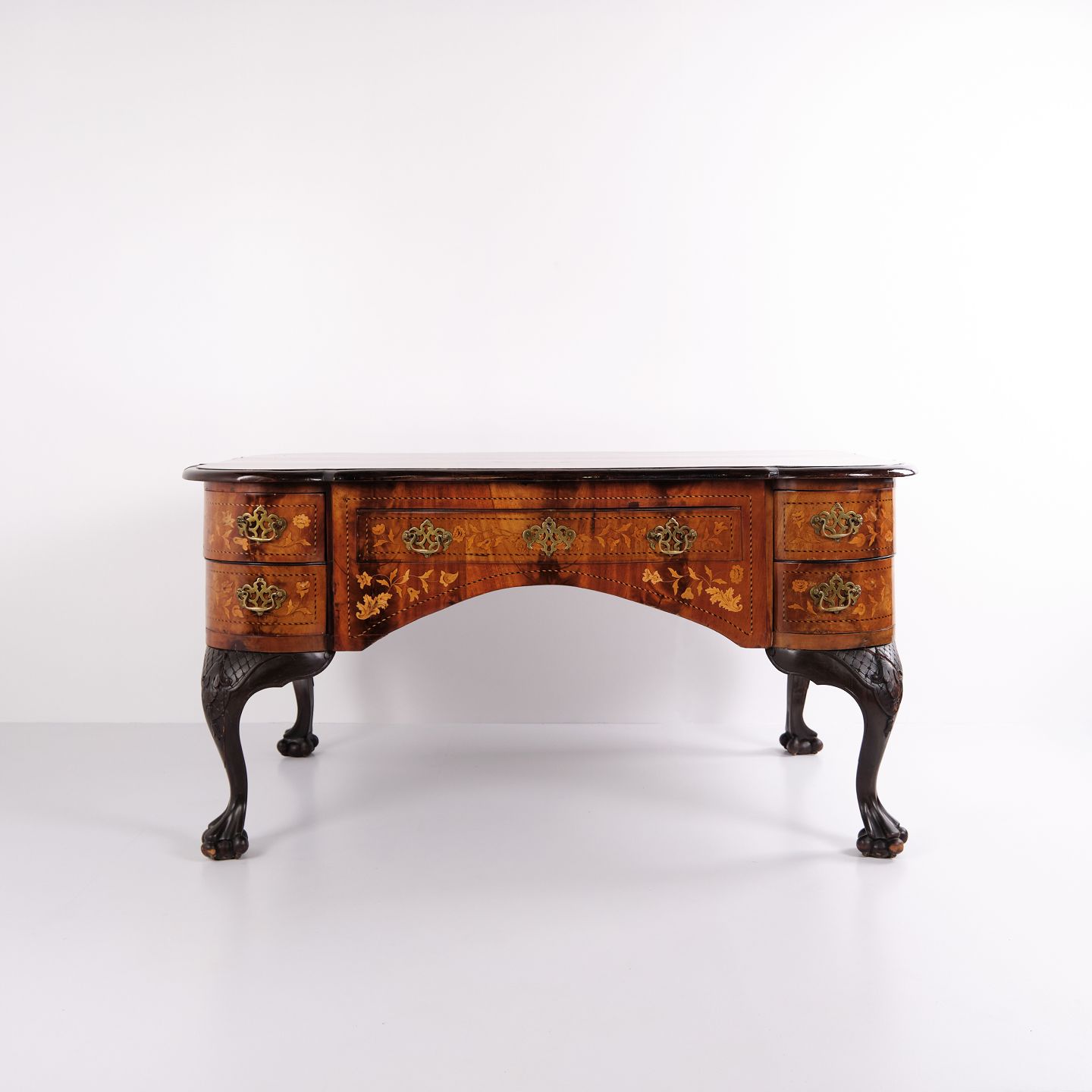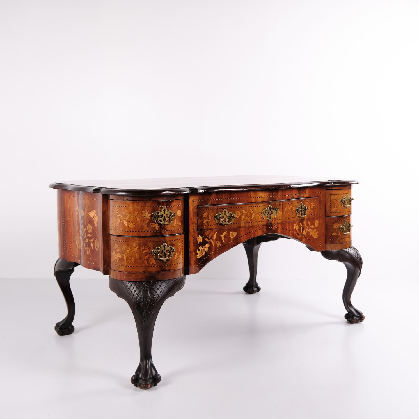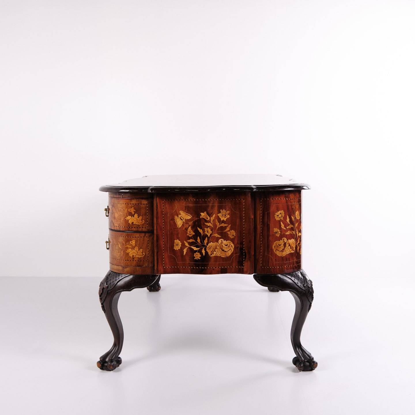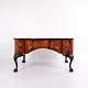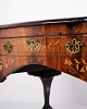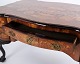 Beskrivelse: Skrivebord fra ca. 1860, udført i nøddetræ med detaljeret frugttræ-intarsia på både top og sider. Bordet er håndpoleret med shellak, hvilket giver en dyb glød og fremhæver det fine håndværk. Et elegant antikt møbel med rige dekorationer og solide materialer.