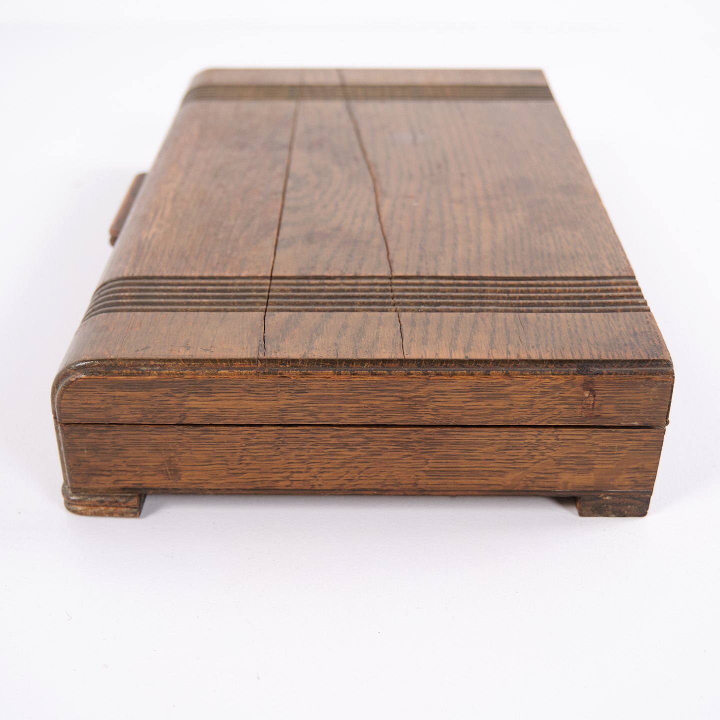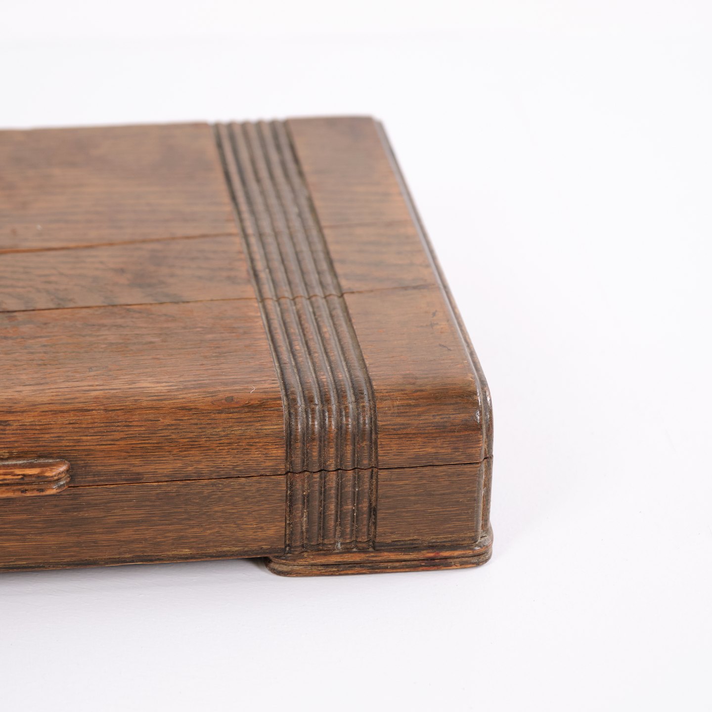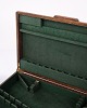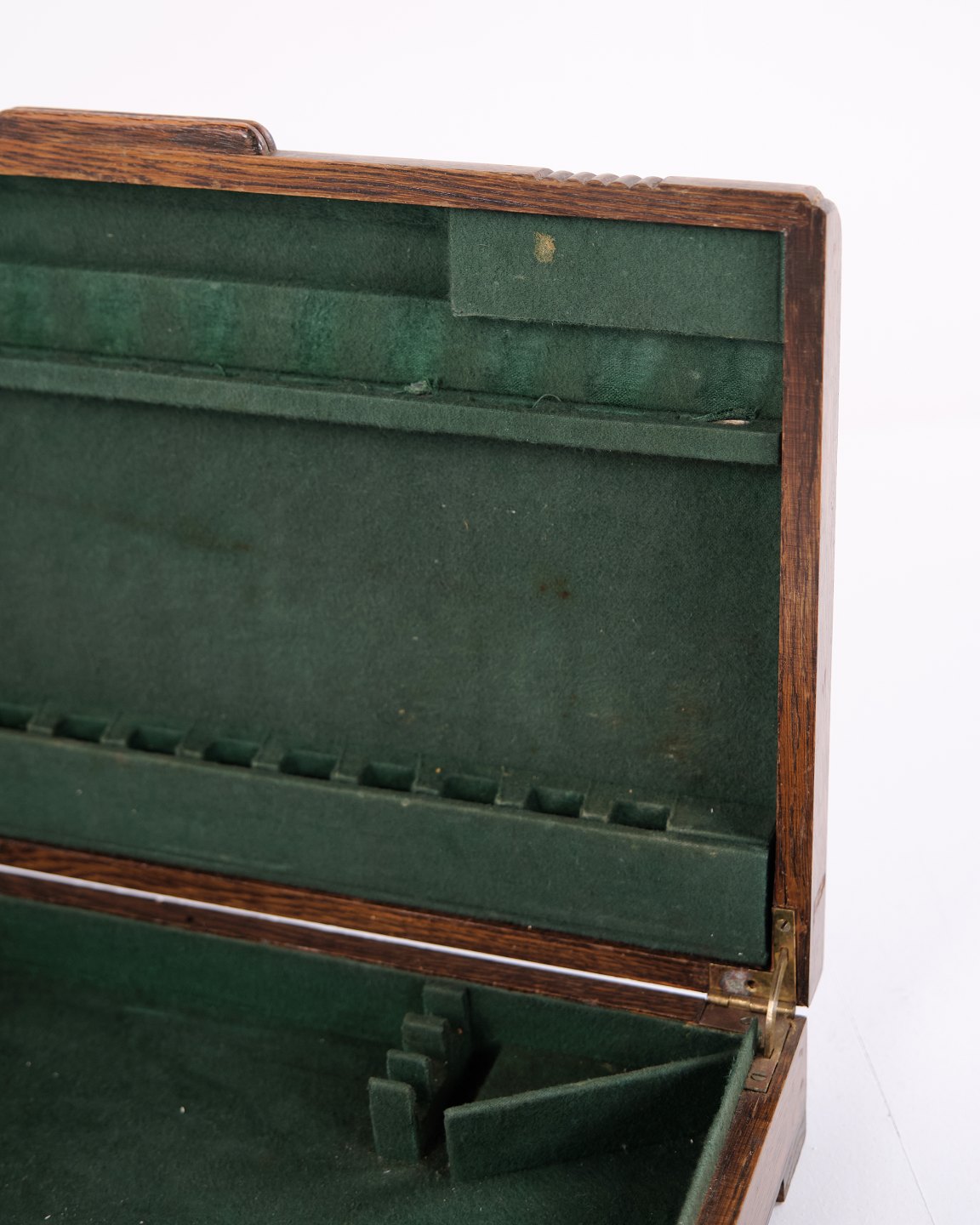 Beskrivelse: Antik bestikkasse i egetræ med grøn indmad og messingbeslag. Klassisk opbevaringskasse til bestik, sølv og småting. Solidt håndværk.