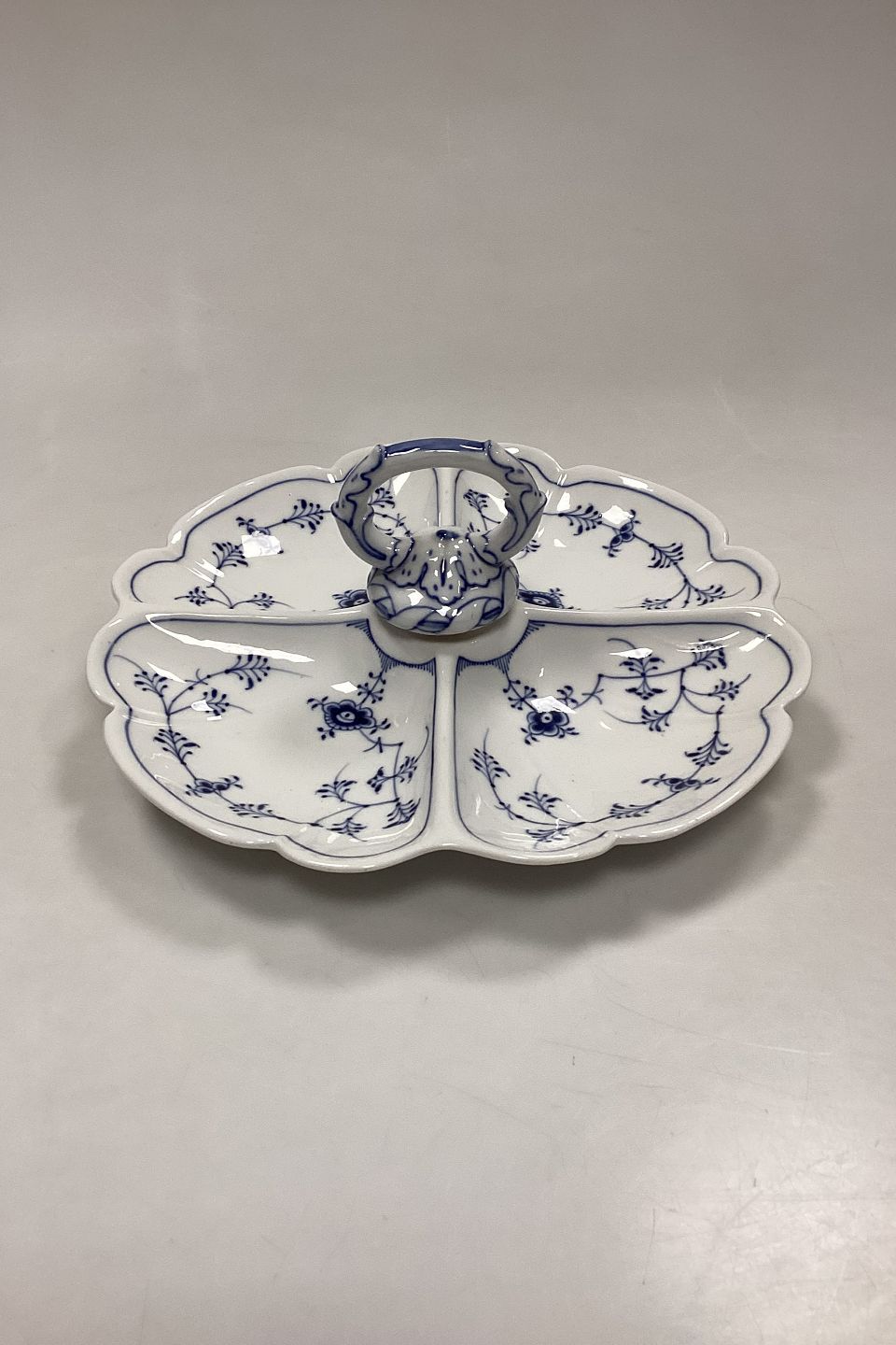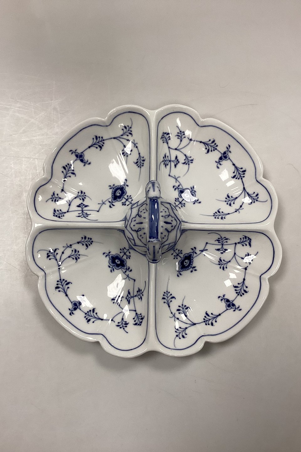 Beskrivelse: Royal Copenhagen Musselmalet Riflet Kabaretfad No. 396. Fire ruminddelinger og hank. 1. Sortering.