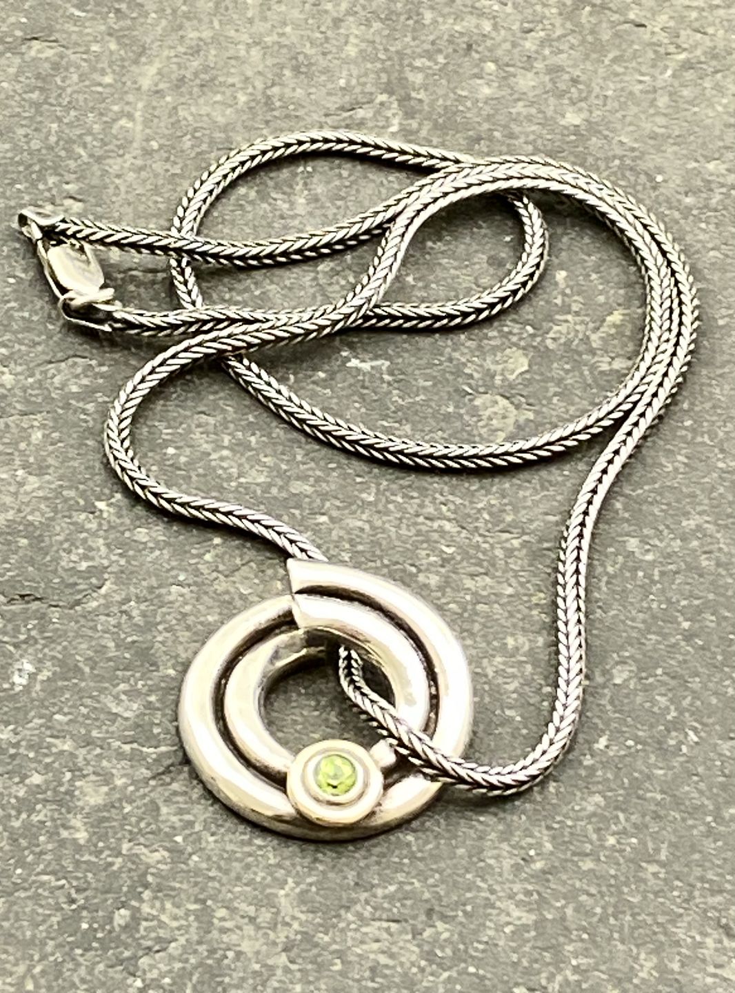 : Sterling sølv vedhæng D.2,5 cm. med sø grøn halvædelsten og 45 cm. sterling sølv kæde emne nr. 626583