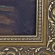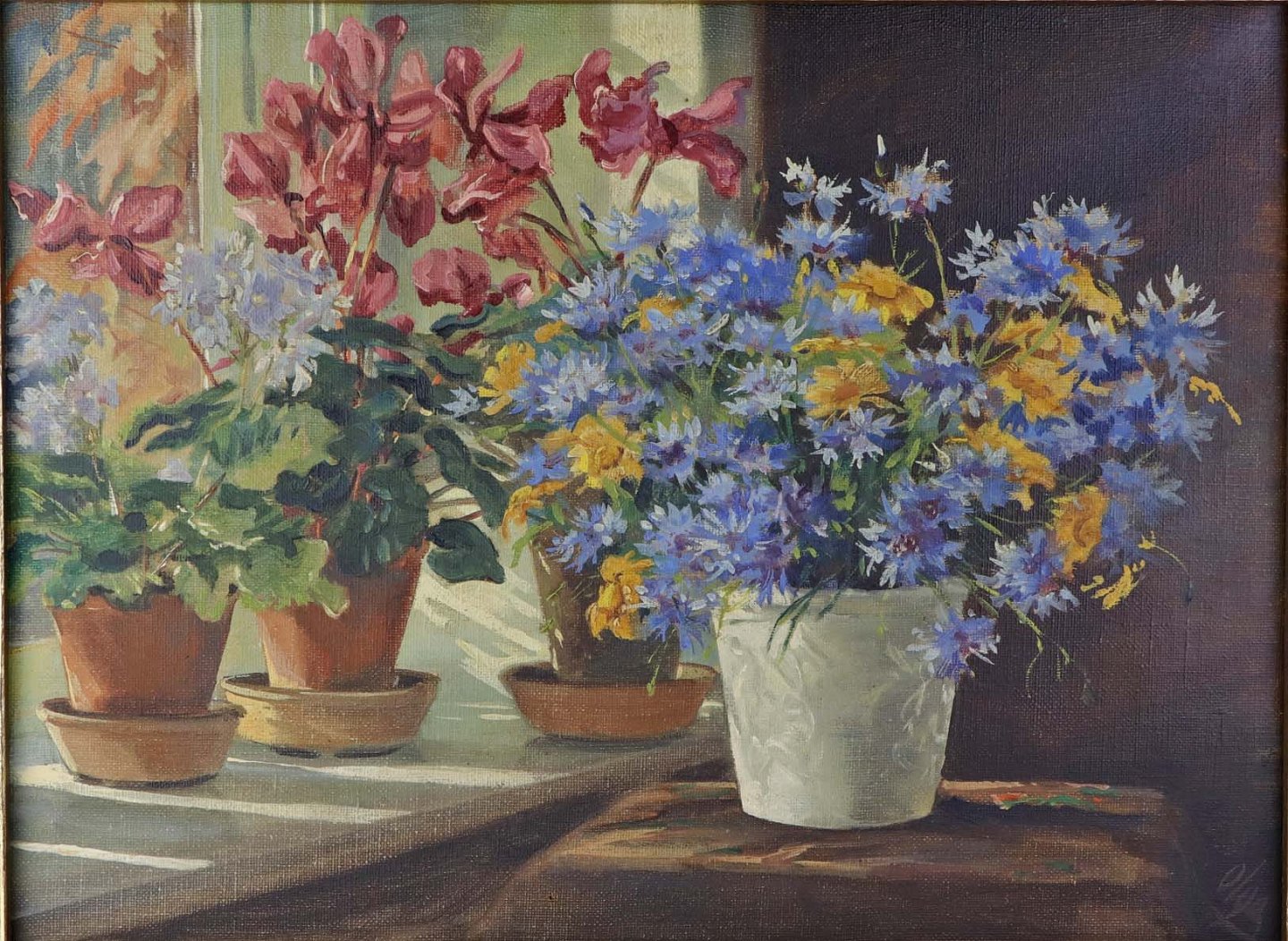 Beskrivelse: Oliemaleri på lærred i guldmalet træramme med stilleben motiv af blomster i vindueskarm.