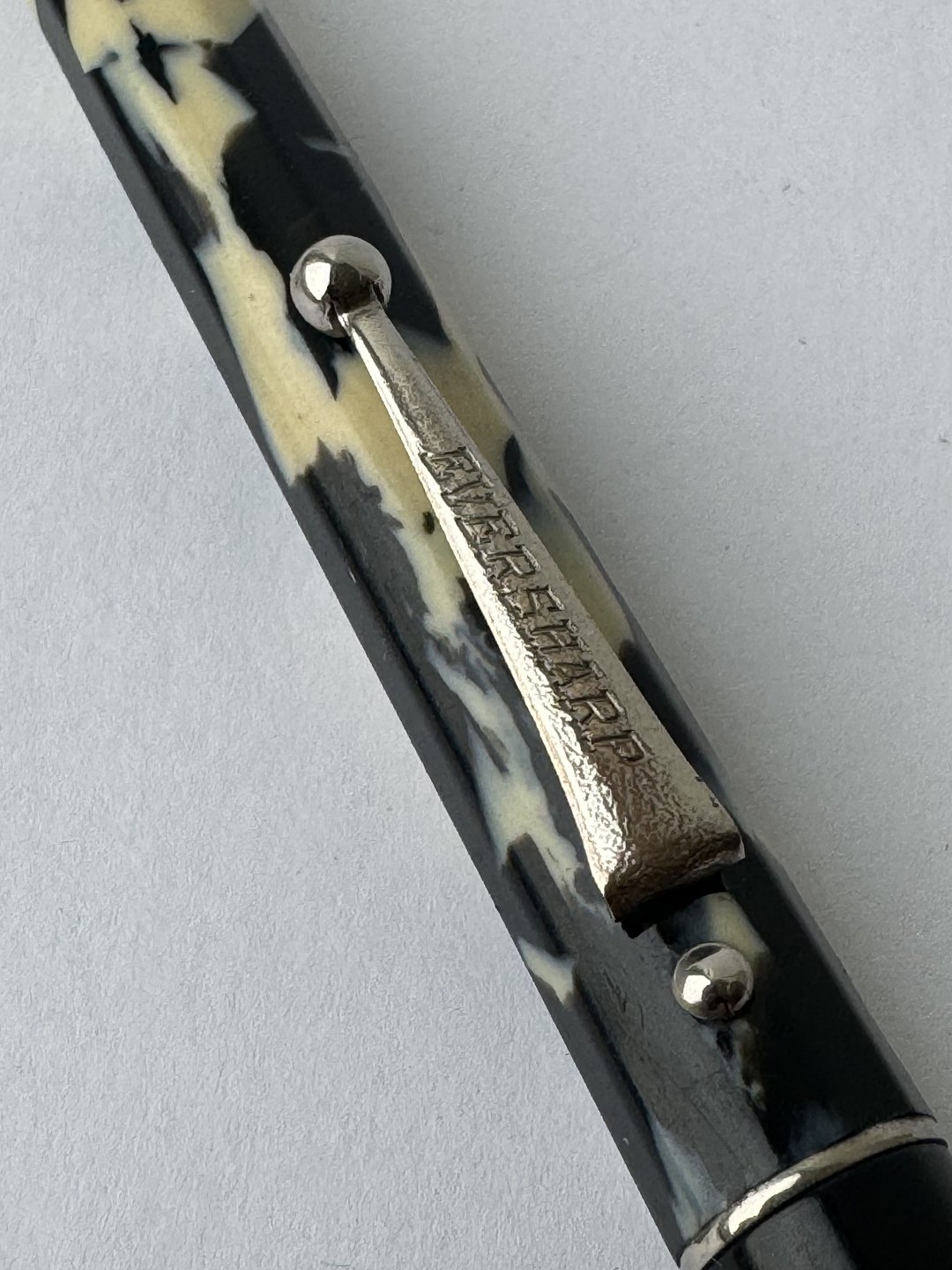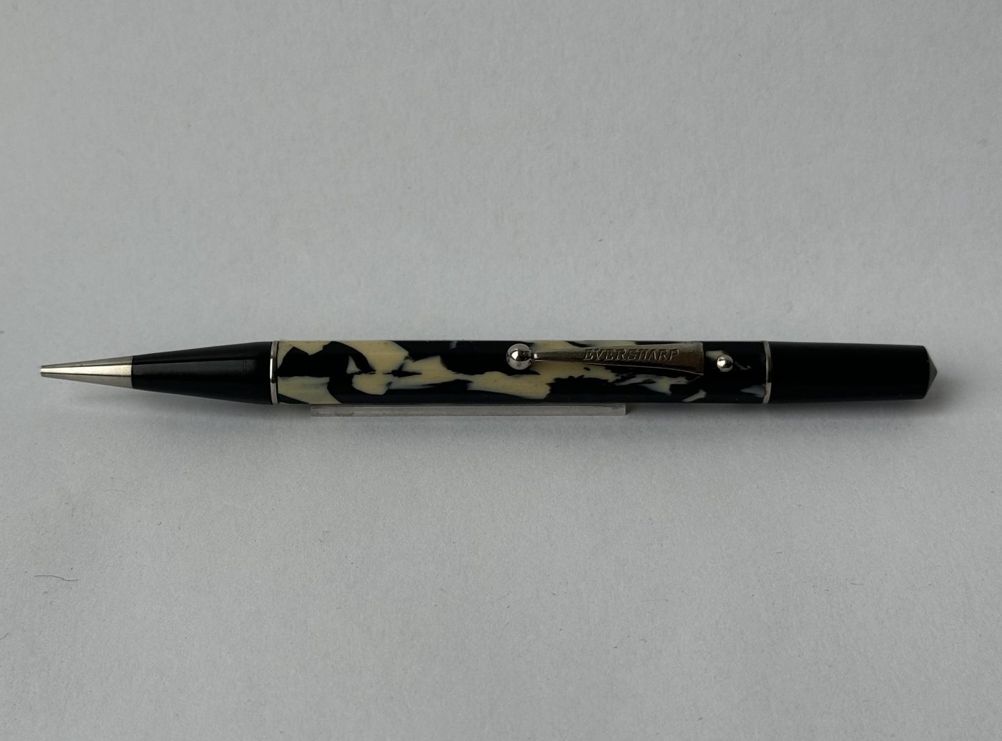 Beskrivelse: 10-kantet creme og sort marmoreret Eversharp skrueblyant / stiftblyant / pencil Fra før 1940. Fremstår i fantastisk god og nærmest ubrugt stand. På clip’en fabriksnavn EVERSHARP På siden af pennen indprentet MADE IN USA. Sen røde blystift kan skrues frem og tilbage. L. 14,2 cm