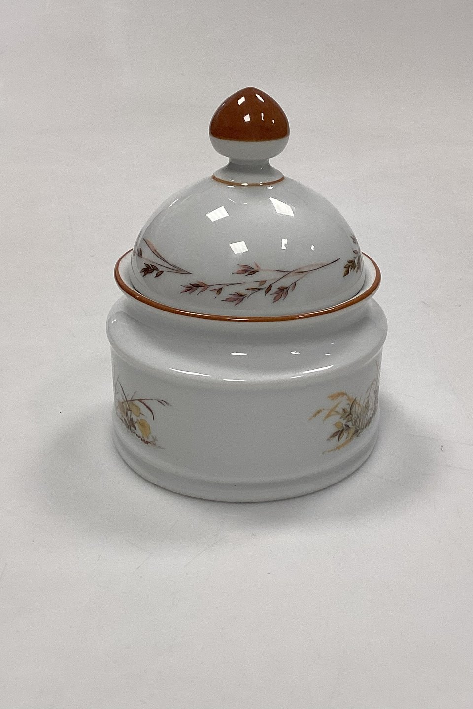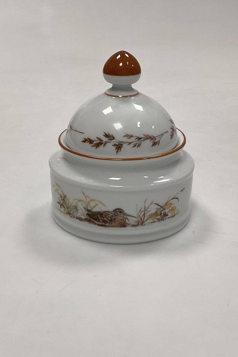 Description: Mads Stage Sugar Bowl with Lid - Woodcock. Latin: Scolopax Rusticola. Produced for Imerco Denmark