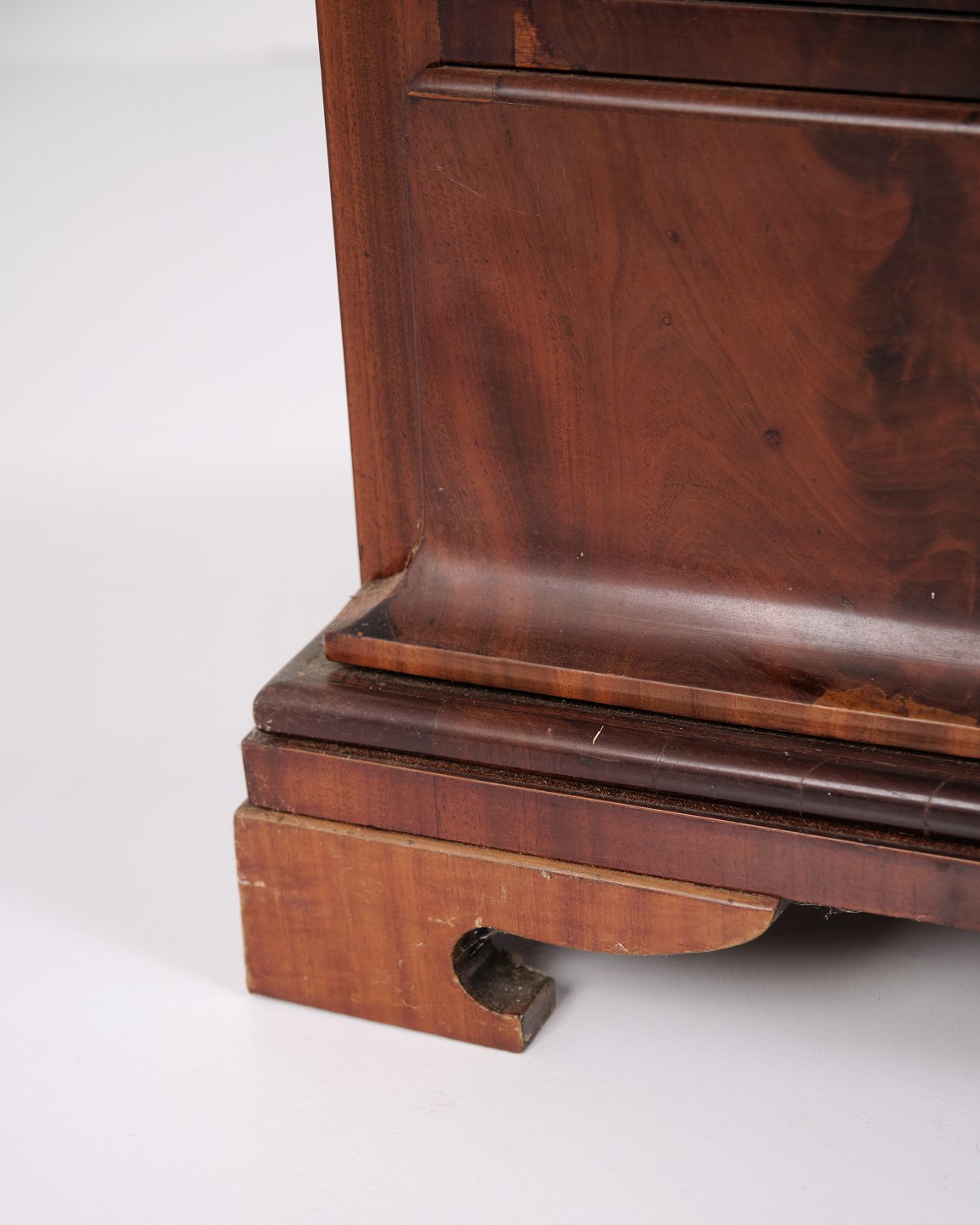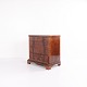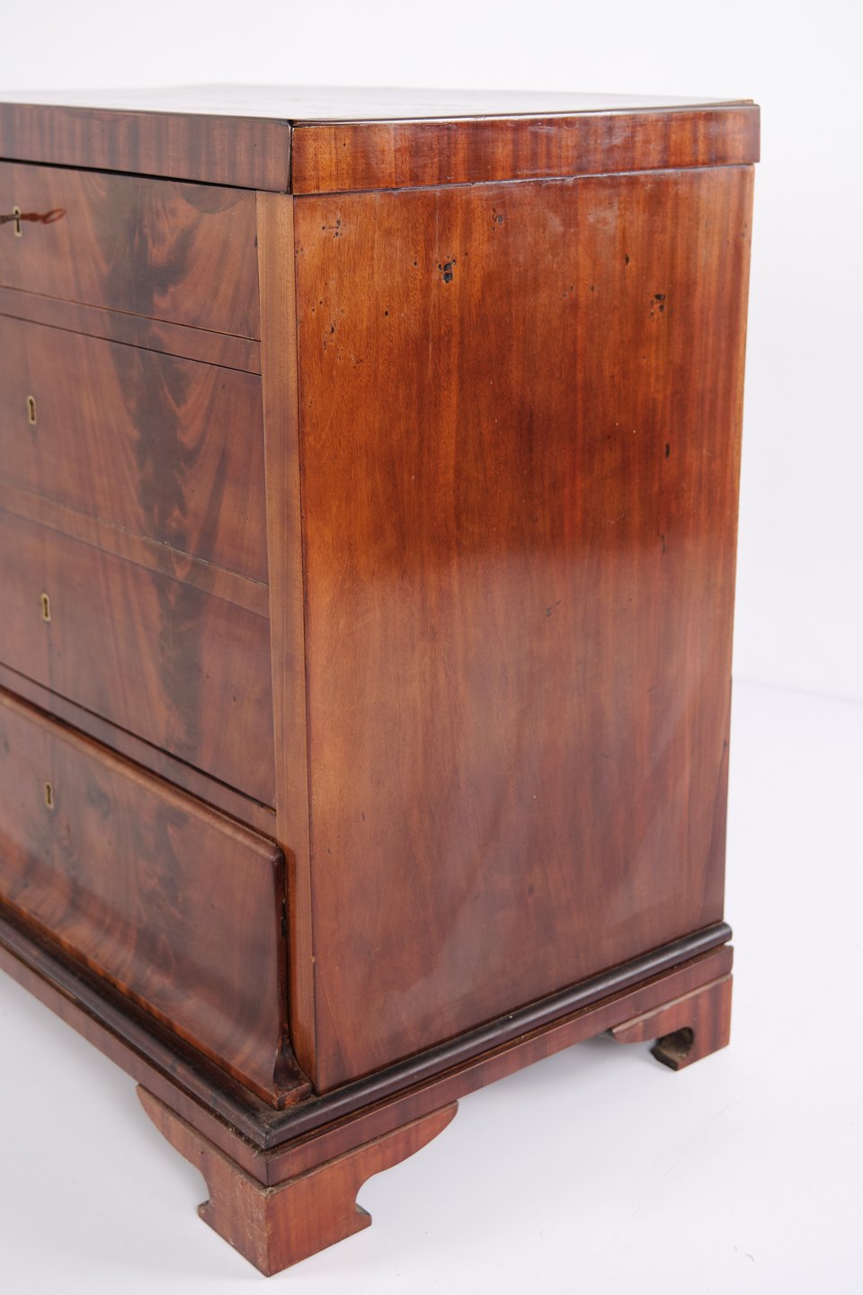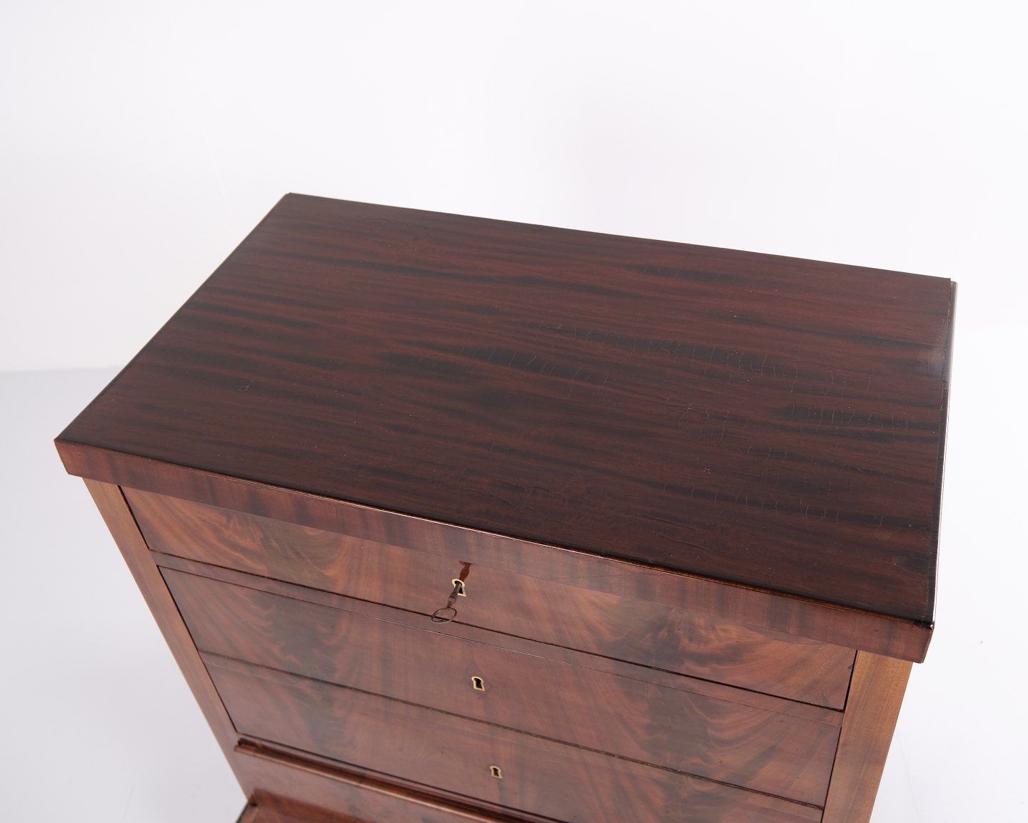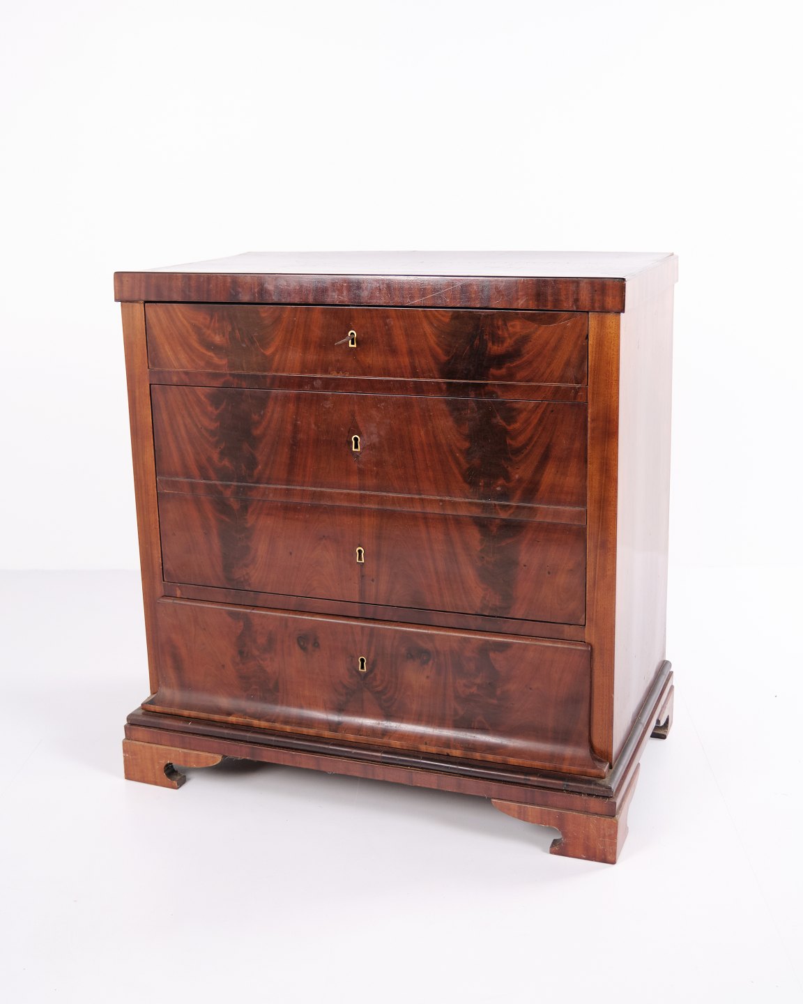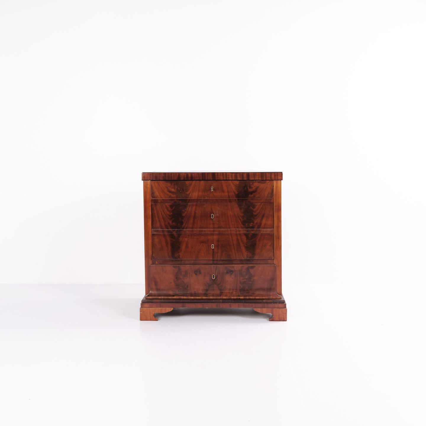 Beskrivelse: Sen Empire kommode fra 1840’erne, udført i flammet mahogni med fire skuffer på sokkel. Overfladen er nænsomt fransk håndpoleret, hvilket fremhæver træets dybe glød og struktur. Et smukt og klassisk antikmøbel fra perioden.