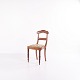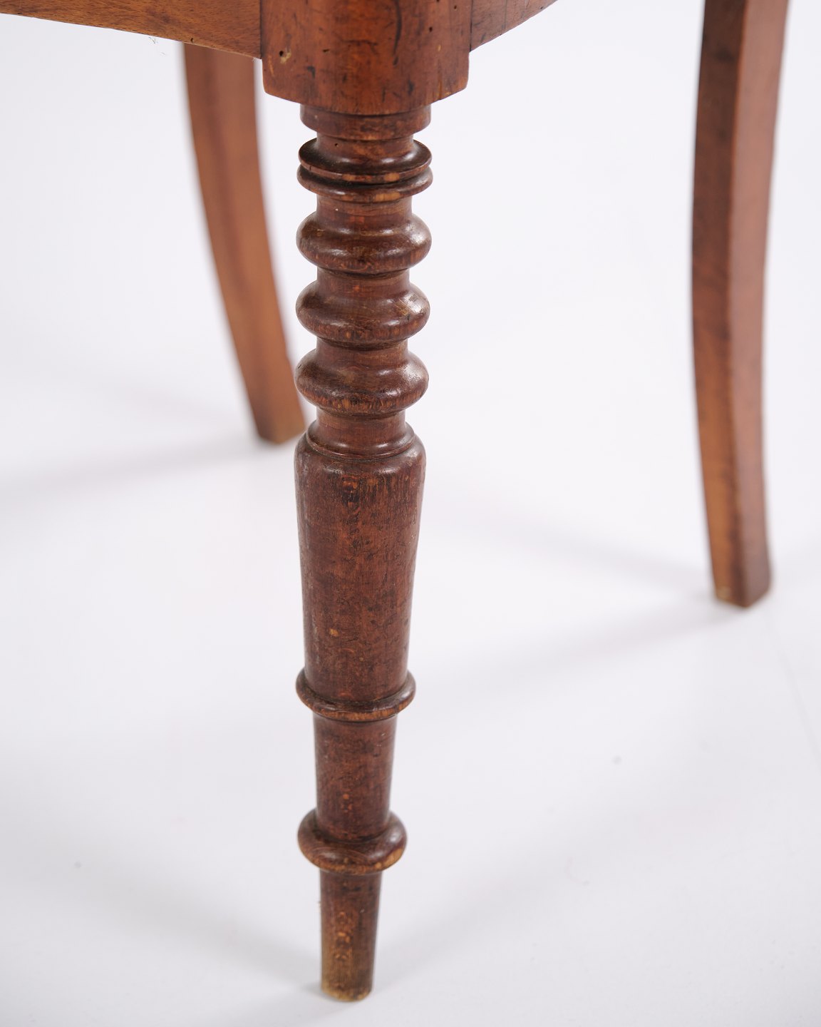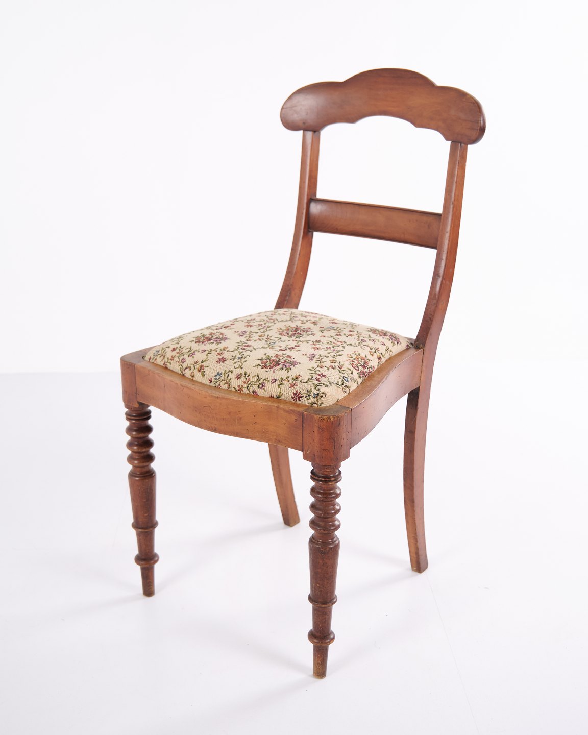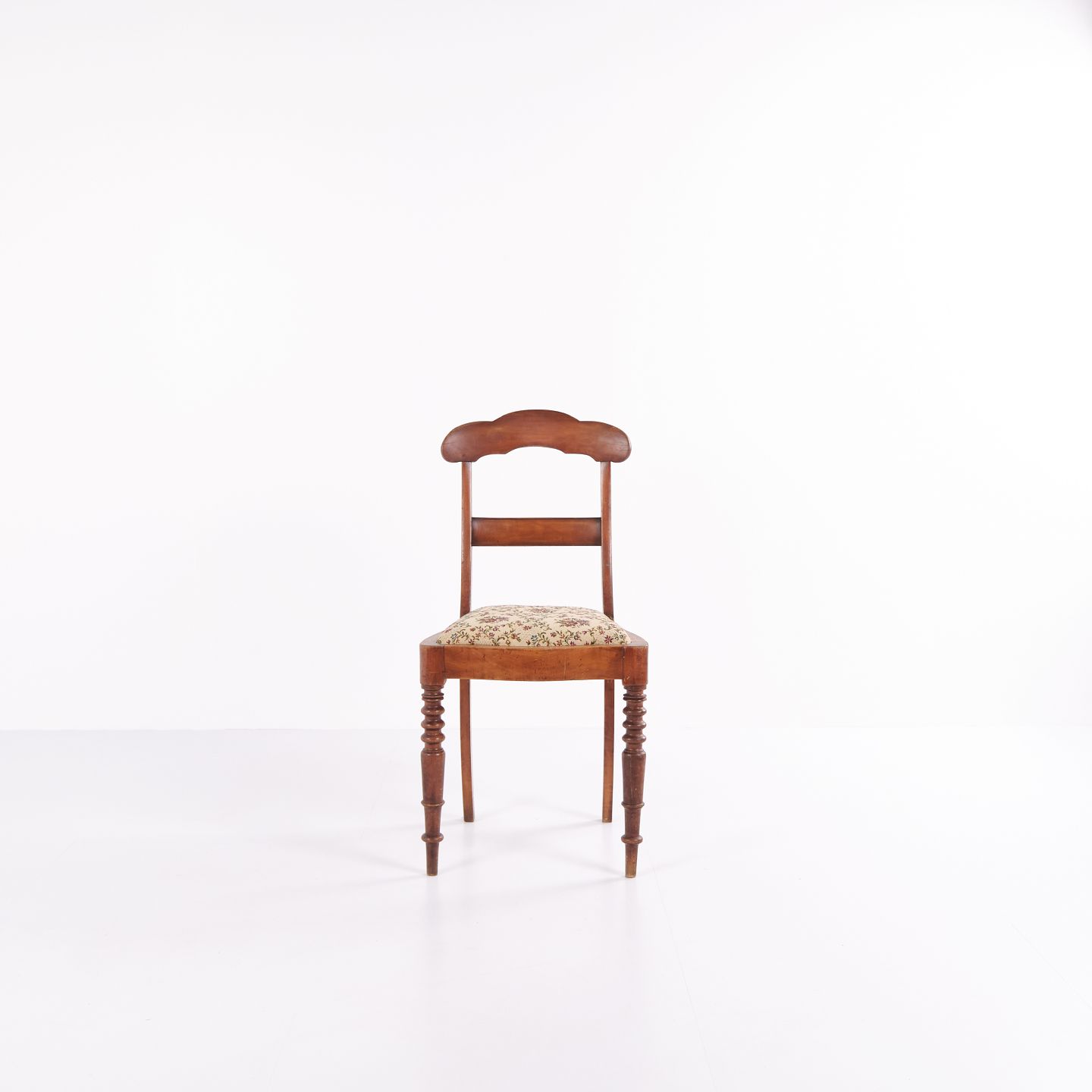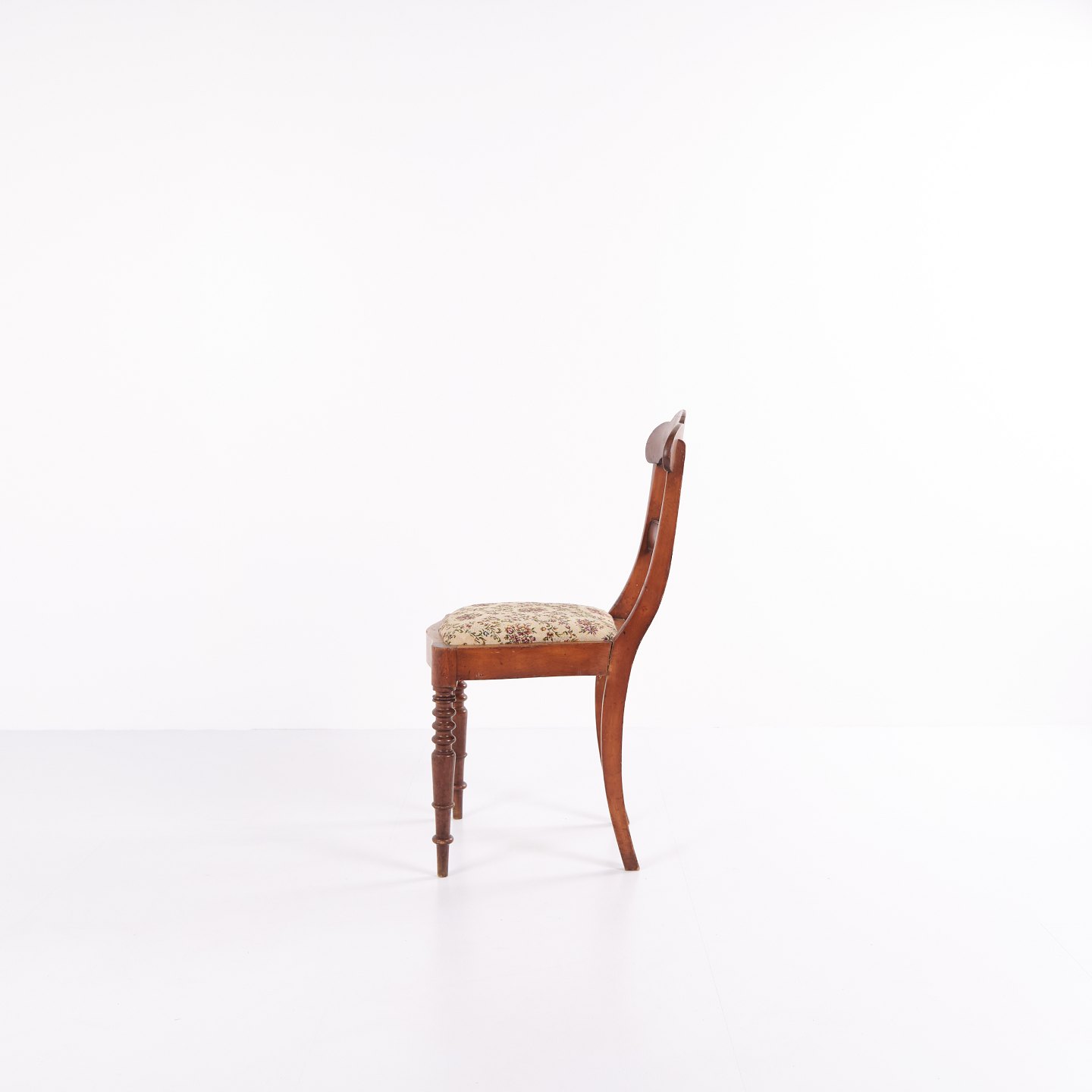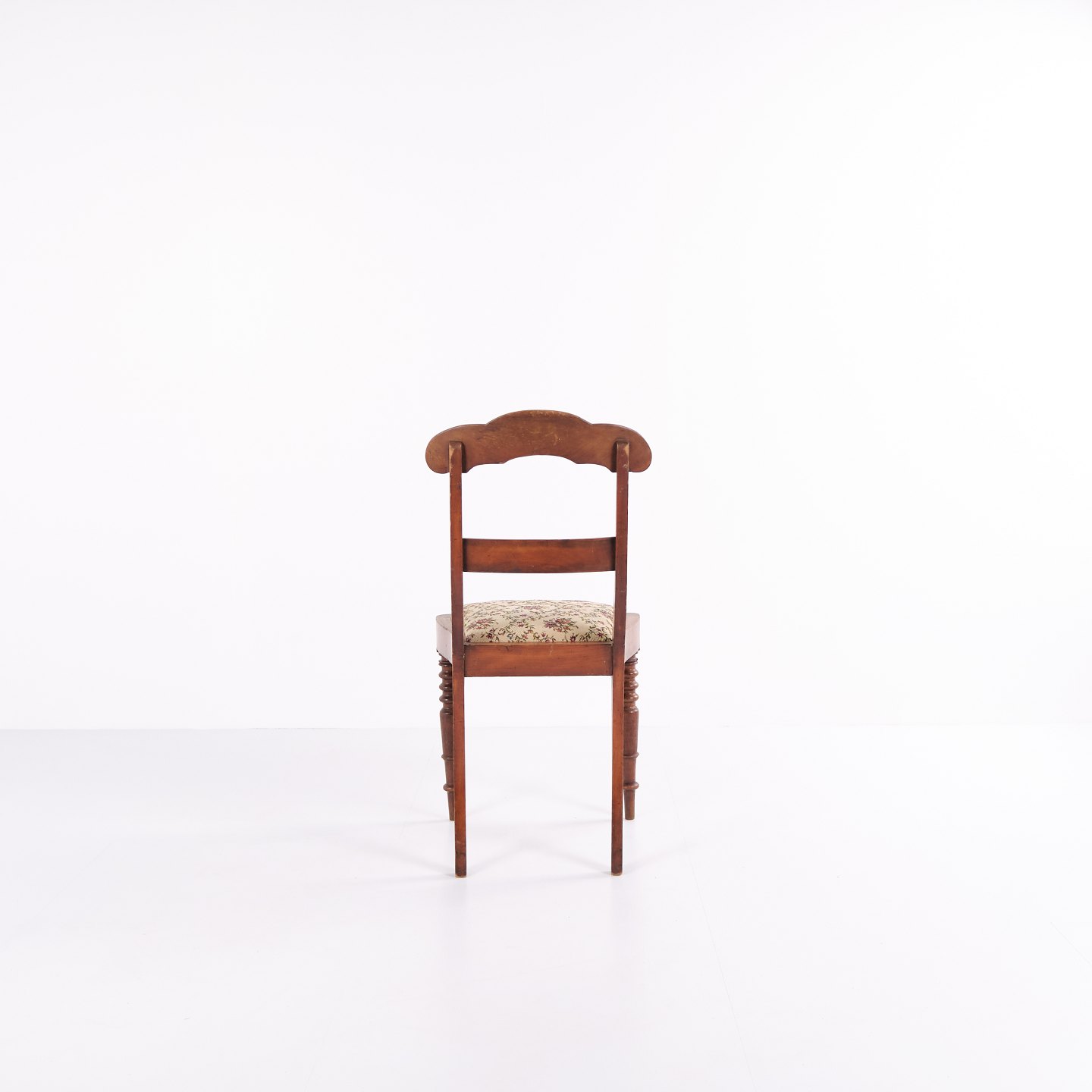 Beskrivelse: Spisebords- eller entréstol i sen Empire stil, udført i mahogni og polstret med blomstret stof. Klassisk design med tidstypiske linjer og let buet ryg. En dekorativ stol, der egner sig til både spiseområde og entré.