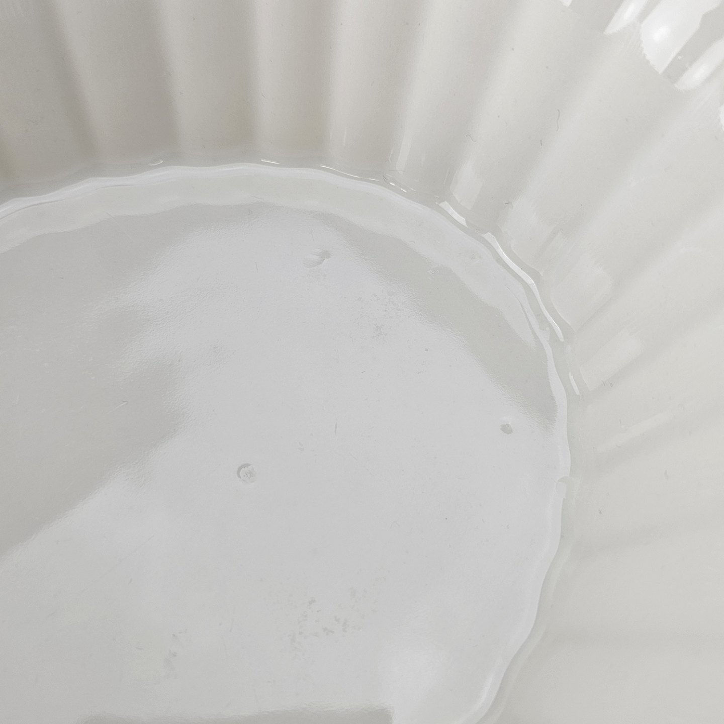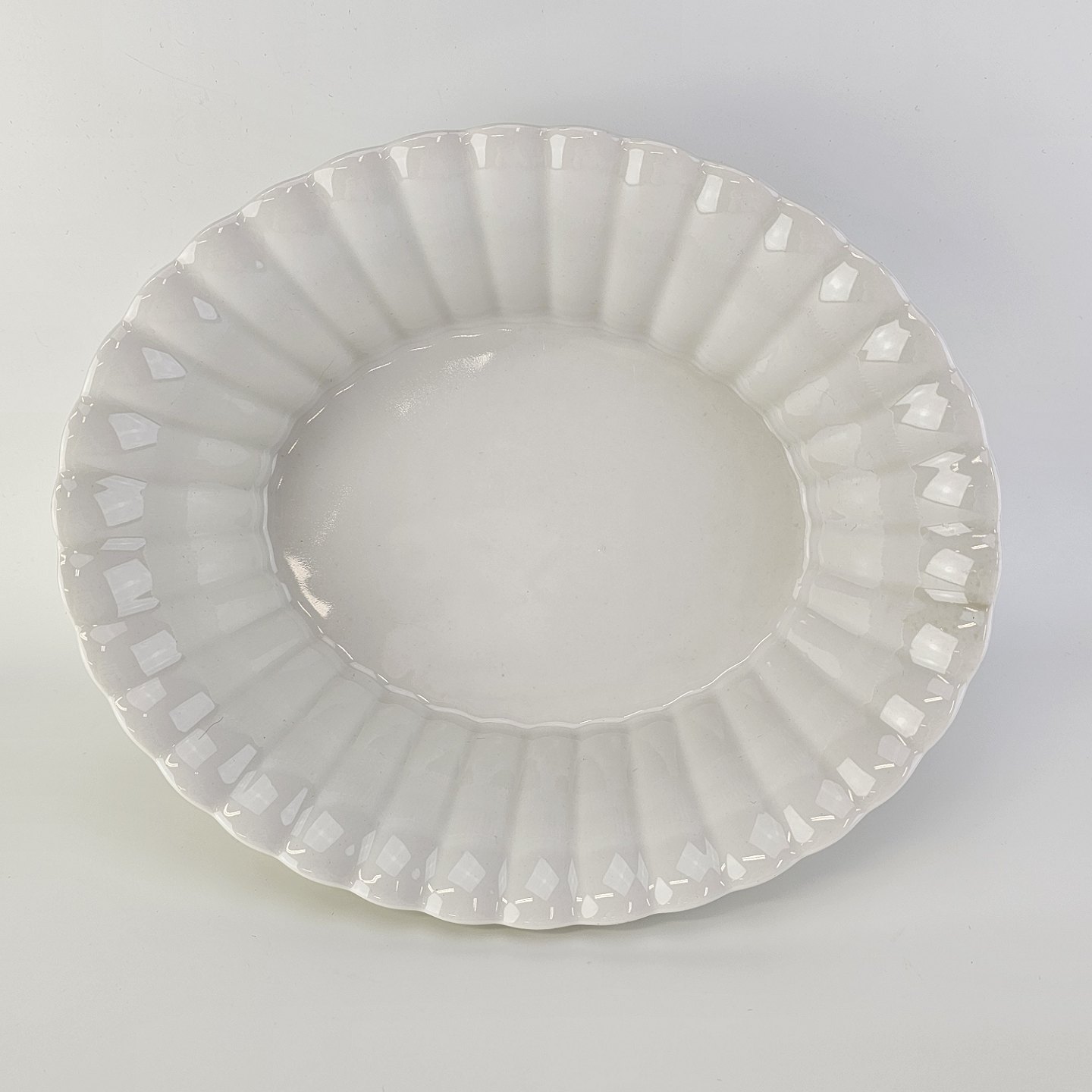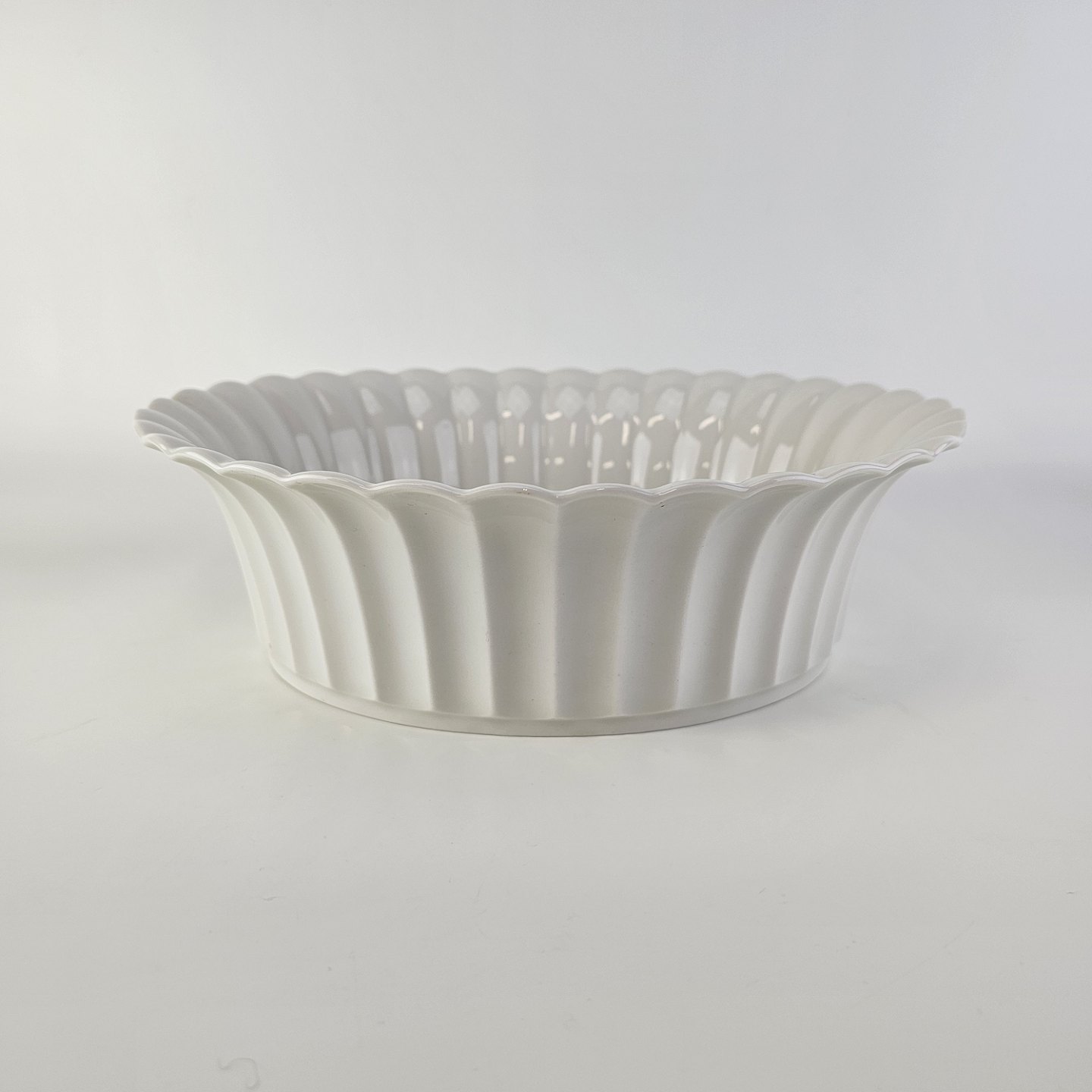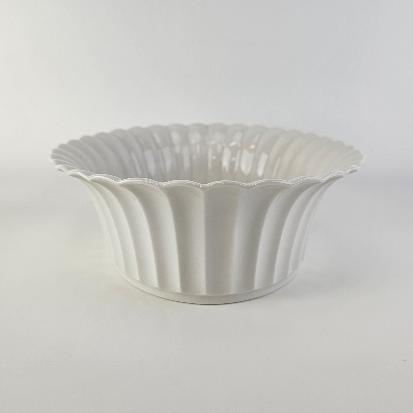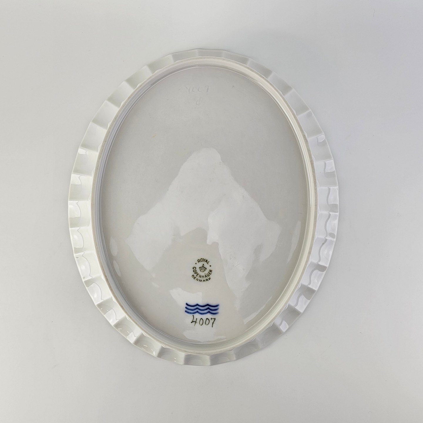 Beskrivelse: Oval skål med bølget sider til kant i kongeligt hvidt porcelæn