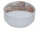 Beskrivelse: Bing & Grøndahl, rund bonbonniere med julenisse der bærer æbleskiver.
