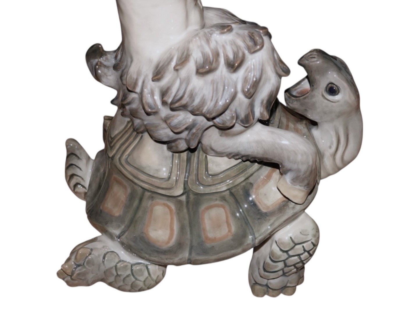 Beskrivelse: Meget sjælden kæmpe Royal Copenhagen figur, pan (faun) der kæmper med en skildpadde. På det første billede er der en "almindelig" pan figur for at illustrere størrelsesforskellen.