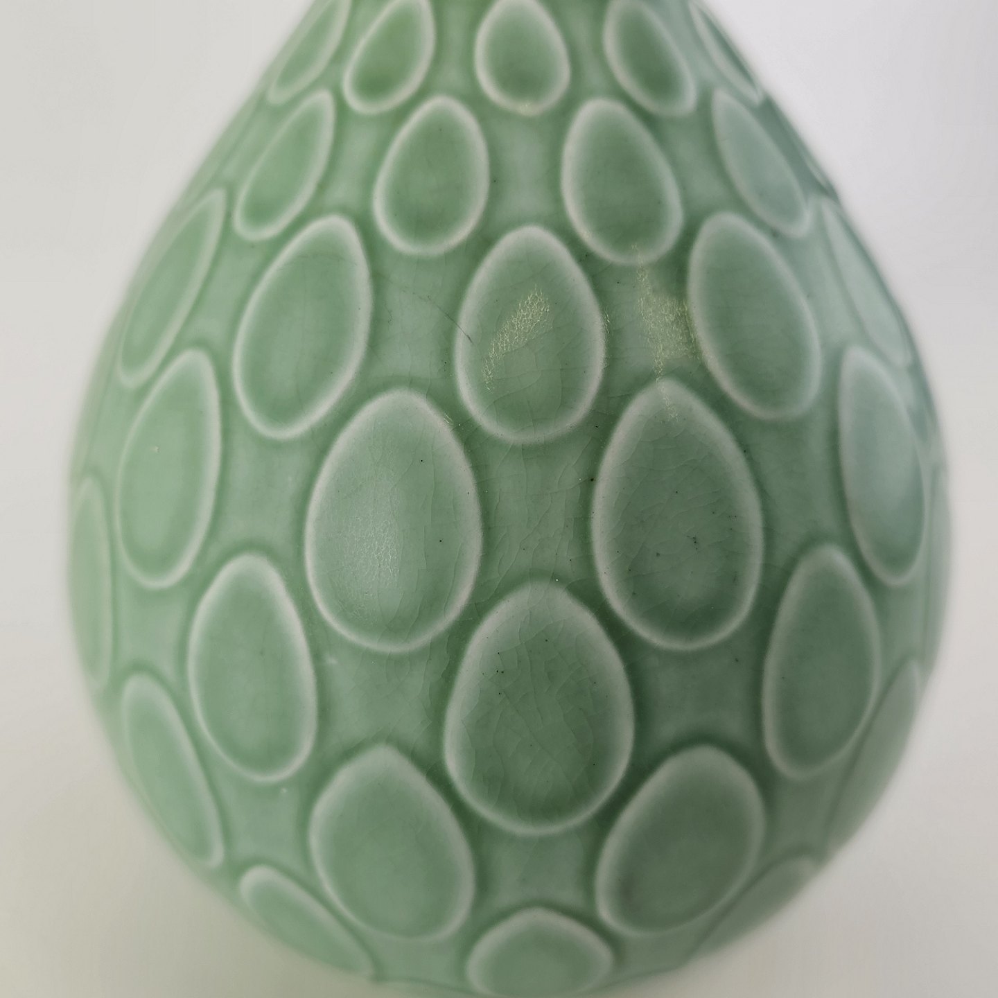 Beskrivelse: Vase i mintgrøn fajance med dråbemønster