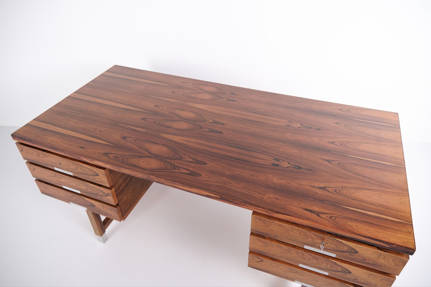 Description: Midcentury desk model EP401 from Eigil Petersens Møbelfabrik, produced in the 1960s. Made in rosewood with six drawers and an open rear bookshelf divided into three sections, making the desk fully freestanding. Features aluminium handles and leg tips. Presented in very fine condition and recently fully polished. The model is often mistaken for designs by Kai Kristiansen.