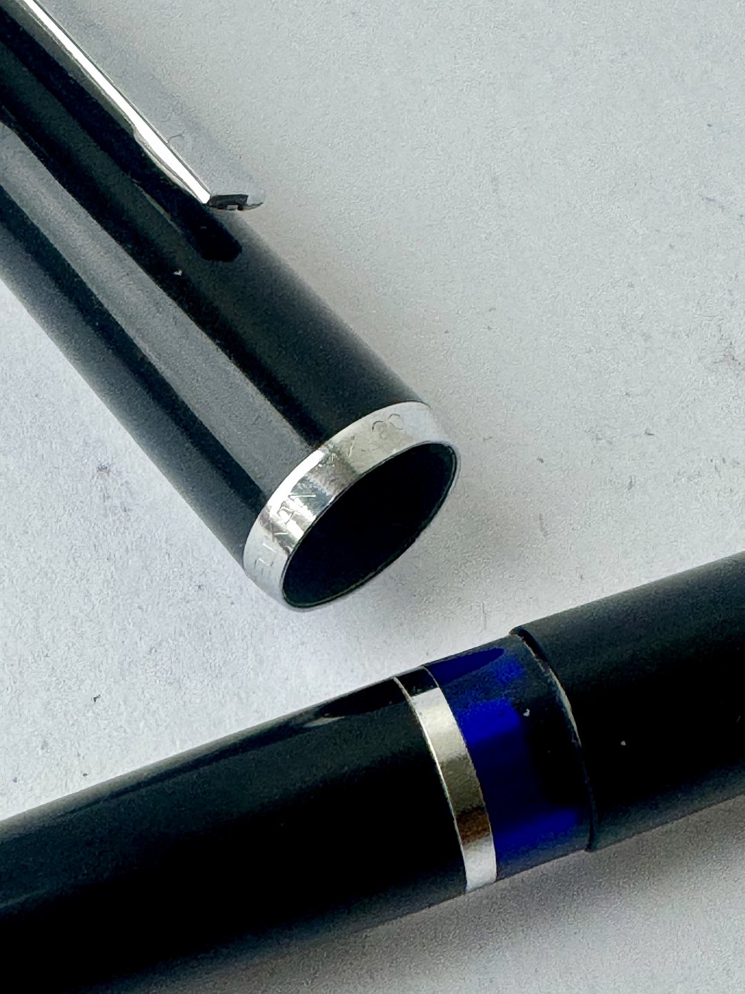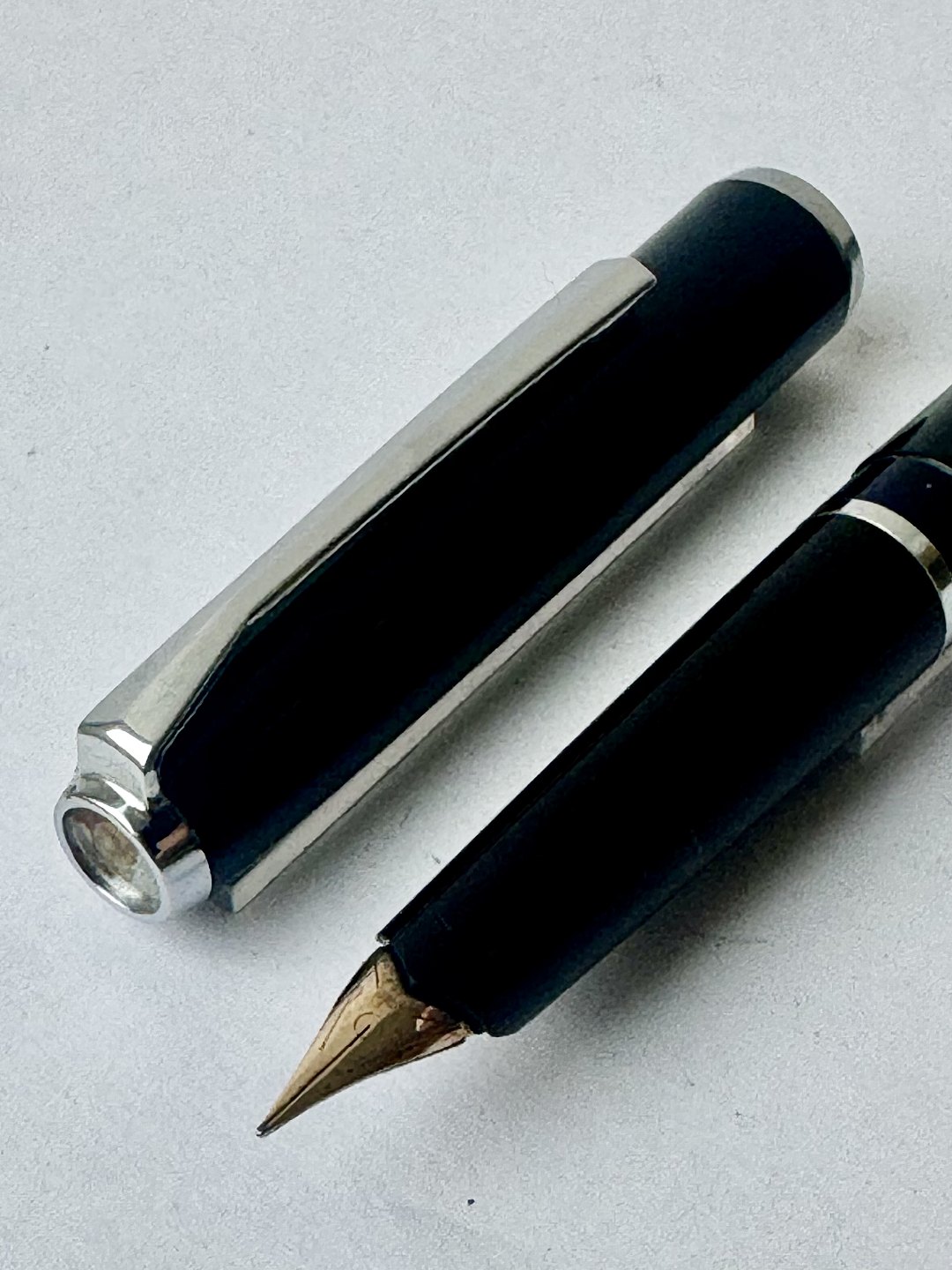 Beskrivelse: Ældre sort Pelikan Silvexa 20 fyldepen med forkromet dele. Fremstillet i Tyskland i midten af 1960’erne. Der skal indsættes ny refill før end den igen er skrivedygtig. Længde: 13,4 cm