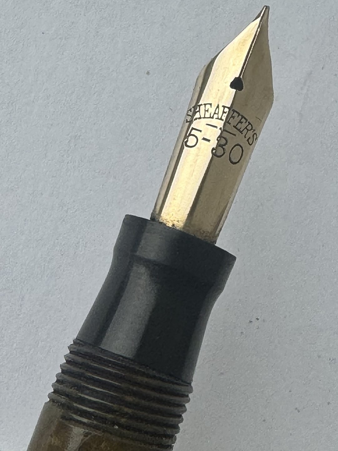 Beskrivelse: Kort Sheaffer’s fyldepen med lever filler. Monteret lille øsken øverst på hætten. Før end fyldepennen igen fungerer skal der indsættes en ny gummisæk, så blæk kan påfyldes. Fremstår ellers i fin stand med alle originale Sheaffer’s dele. Length: 11,8 cm