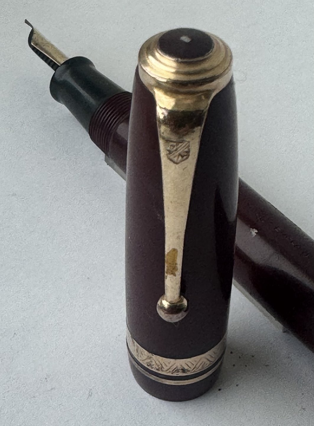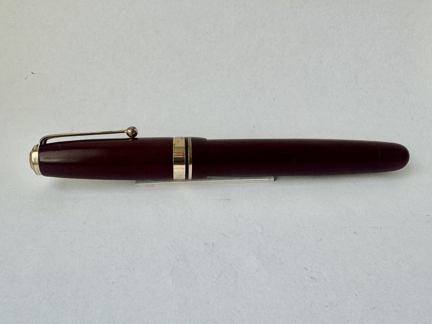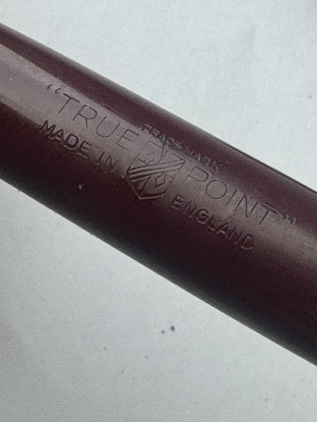 Beskrivelse: Kraftig Bordeaux “True Point” fountain pen. Push button filler. Fremstillet i England omkring 1950. Fremstår i god stand uden skader eller reparationer. Der skal indsættes en ny gummisæk før end fyldepennen igen skal optage blæk og skrive igen. Dette koster ekstra kr. 200, at få udført. Længde: 13,4 cm