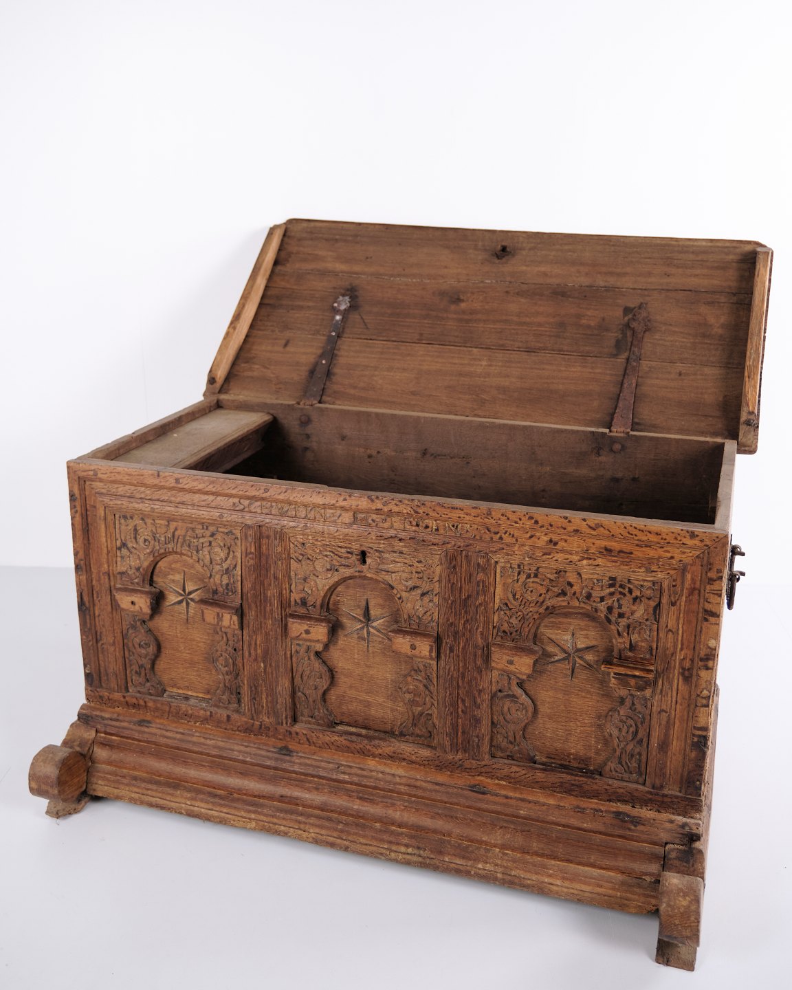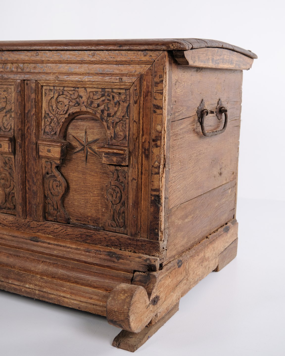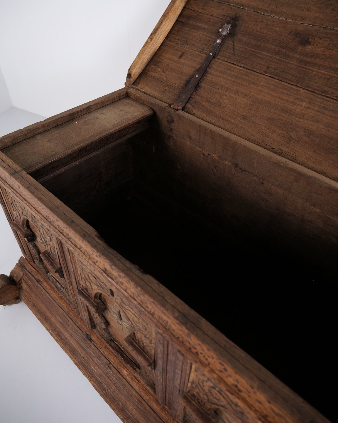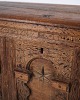 Beskrivelse: Kiste fra ca. 1860’erne, udført i egetræ med håndskårne detaljer og intarsia. Et dekorativt og solidt antikt møbel med karakteristiske udsmykninger fra perioden. Velegnet til opbevaring og som dekorativt interiør.