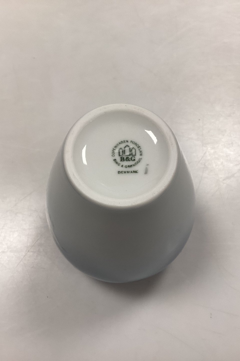 Beskrivelse: Bing og Grøndahl Måge Vase No. 681 eller 202. 3 små fejl/prikker i glasuren. Måler 12,5 cm / 4.92 in.