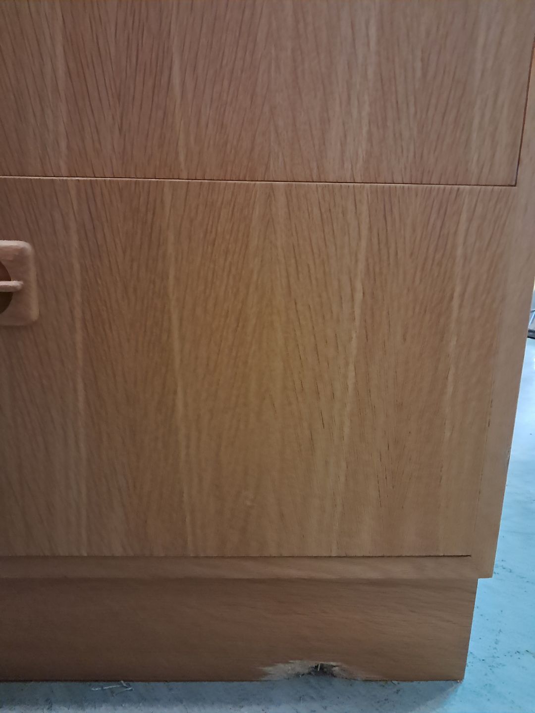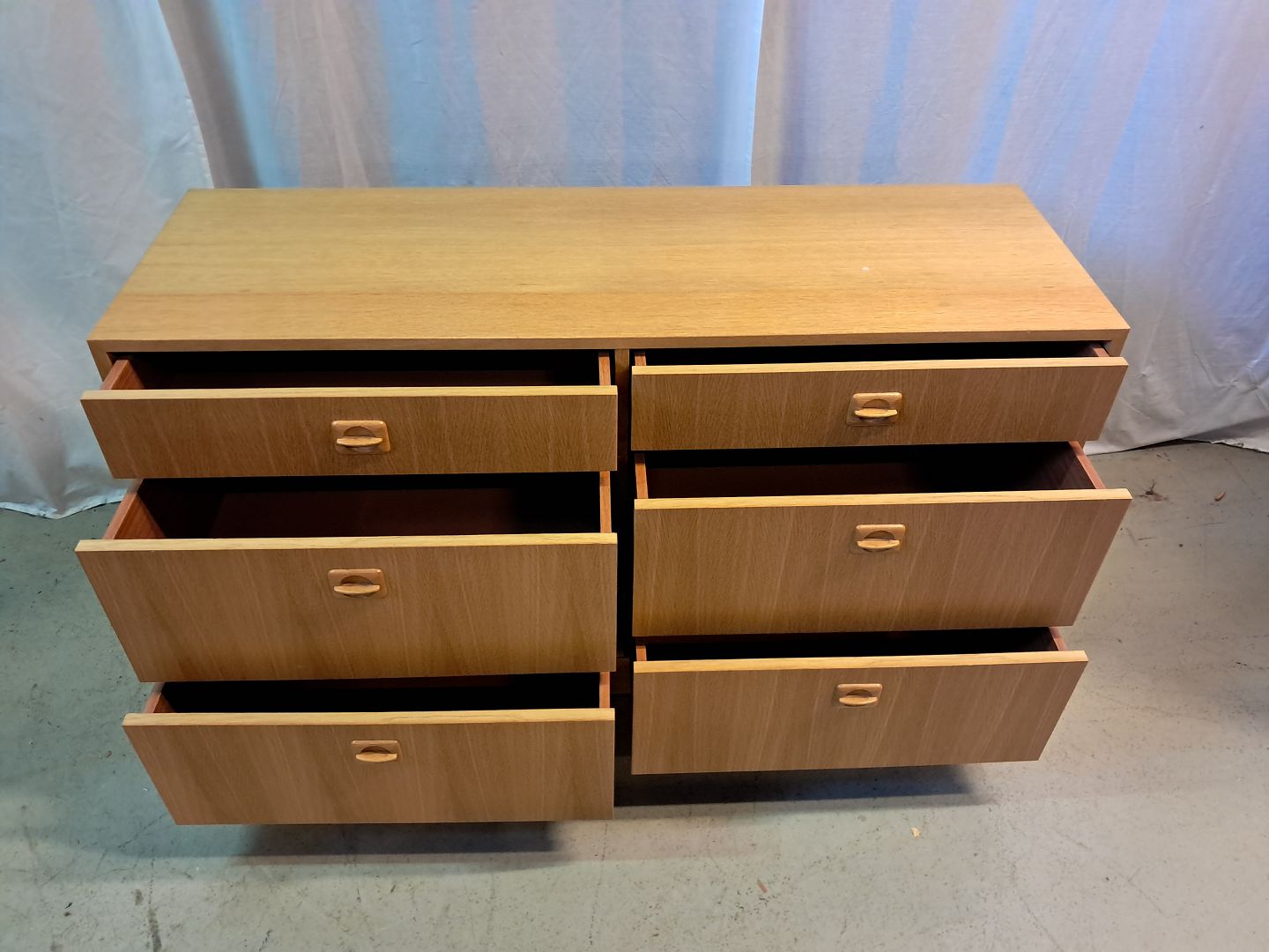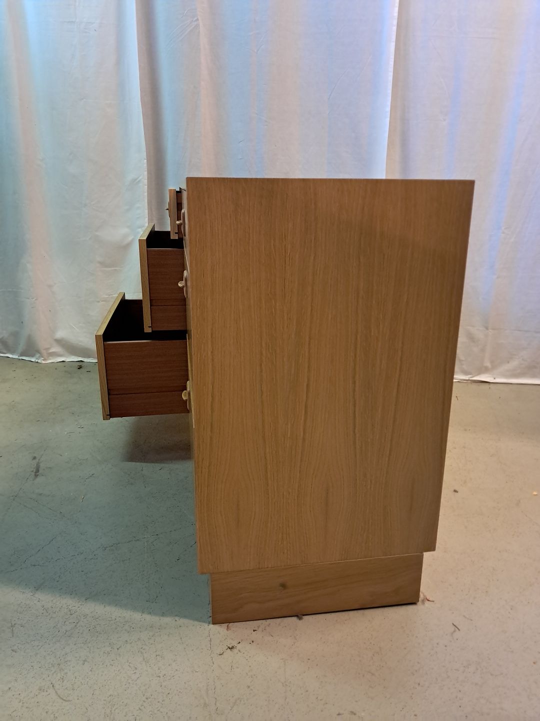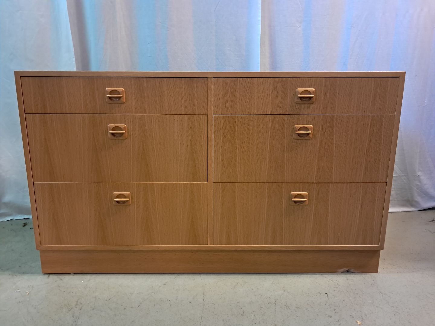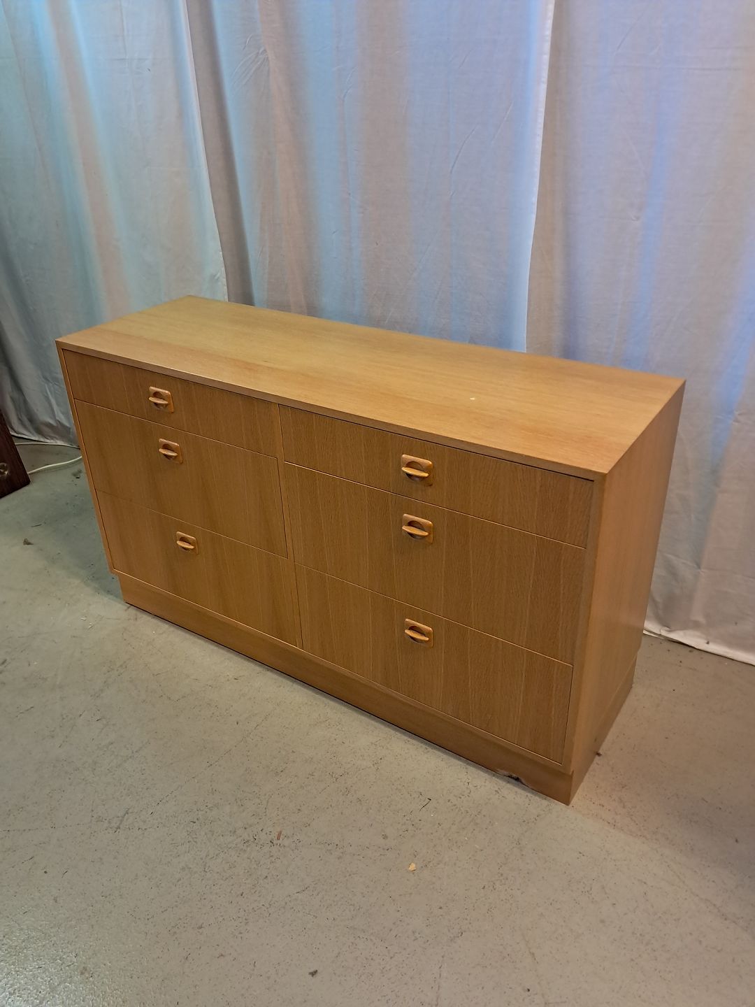 Beskrivelse: Kommode i fineret egetræ, fra 1980erne.