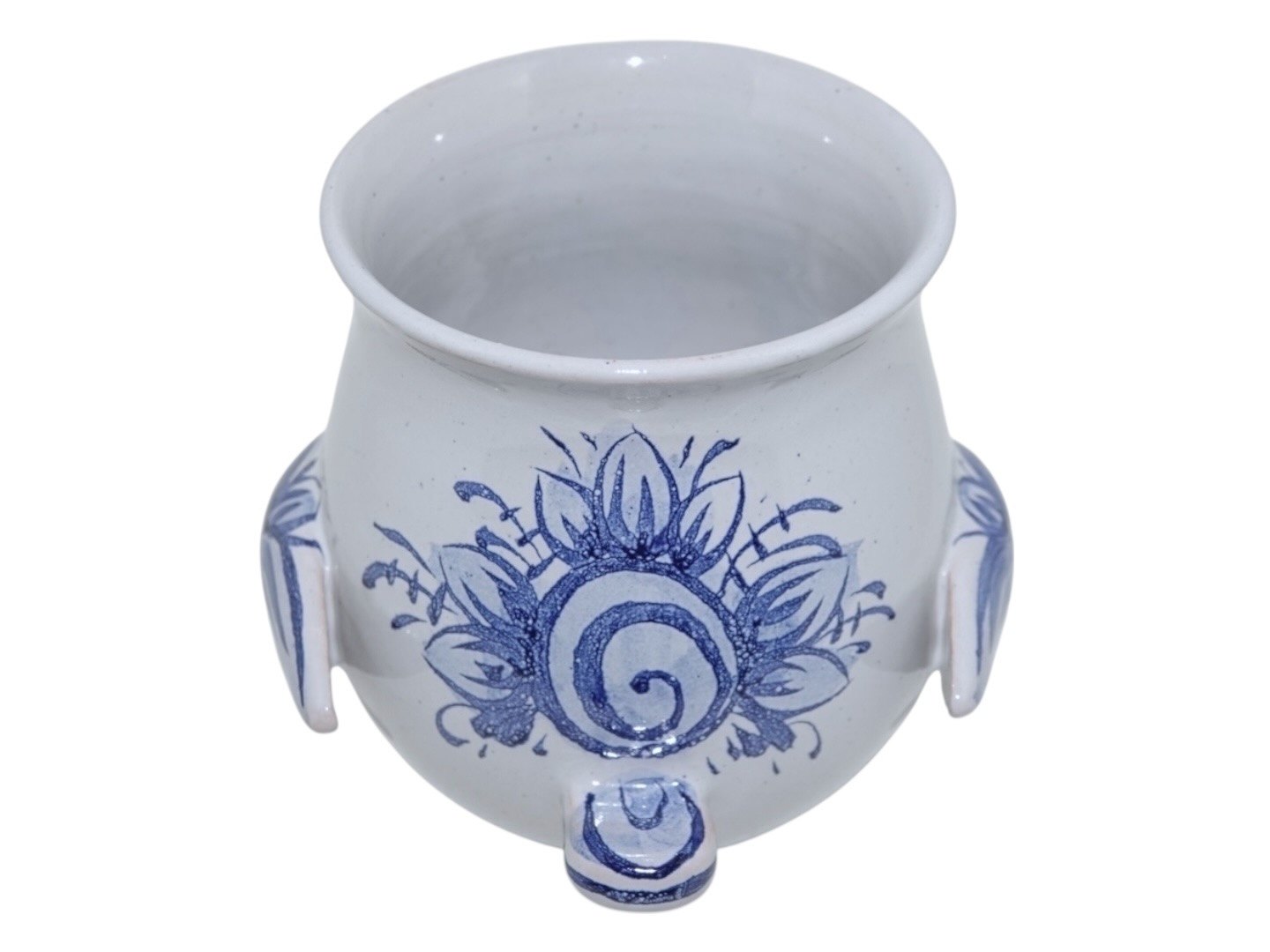Beskrivelse: Bjørn Wiinblad keramik, lille urtepotteskjuler i form af fugl med næb, vinger og hale. Denne er med blå dekoration.