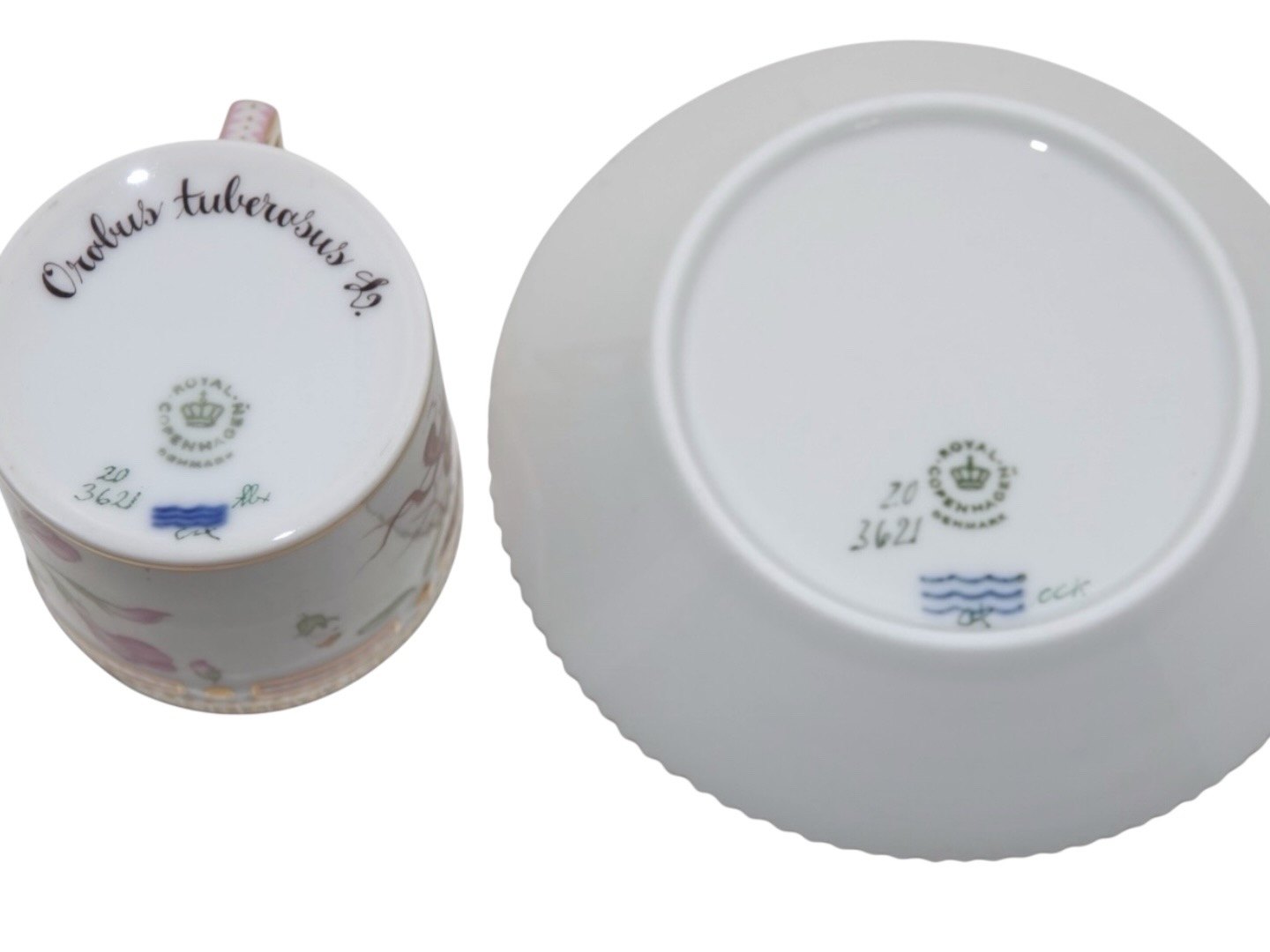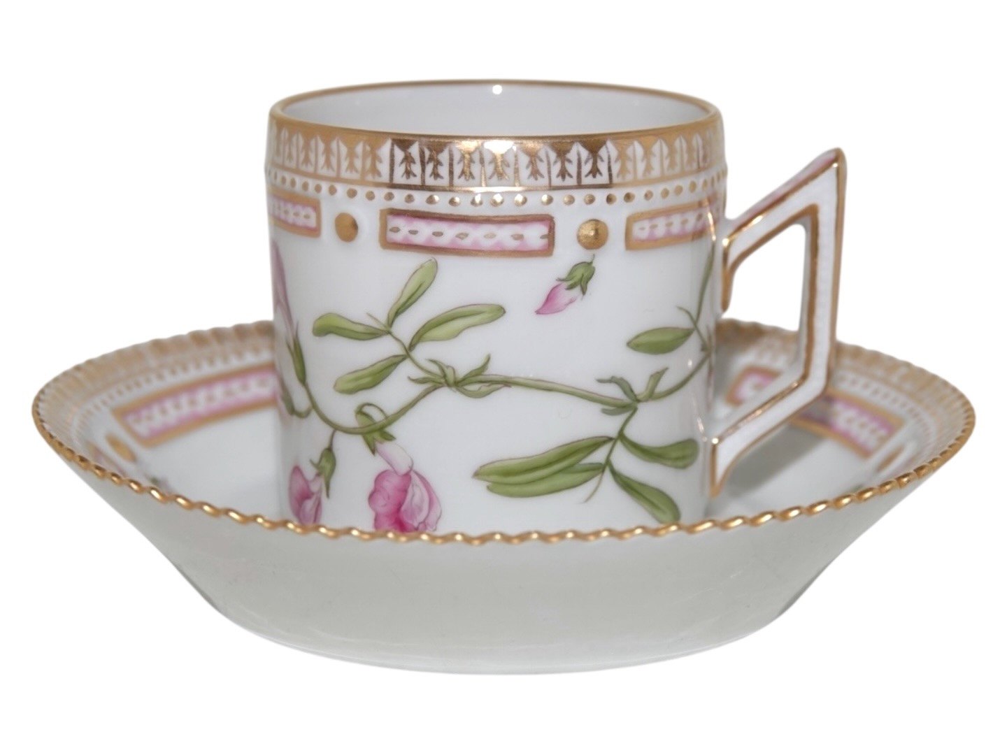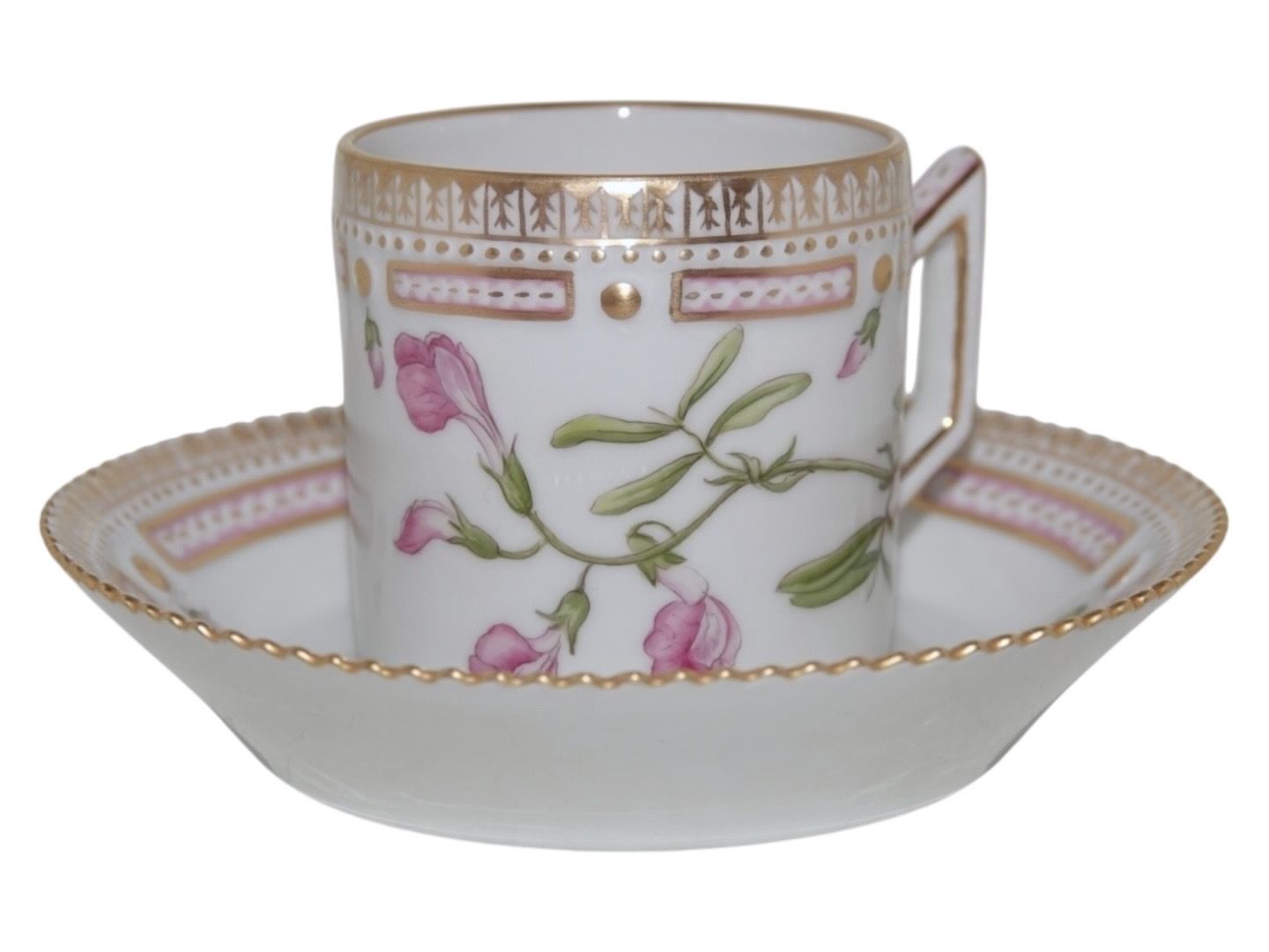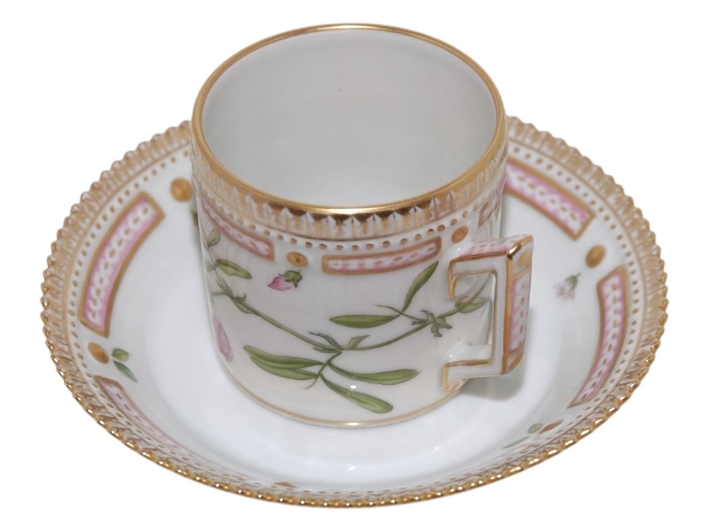 Beskrivelse: Royal Copenhagen Flora Danica, lille tøndeformet espressokop med tilhørende underkop.