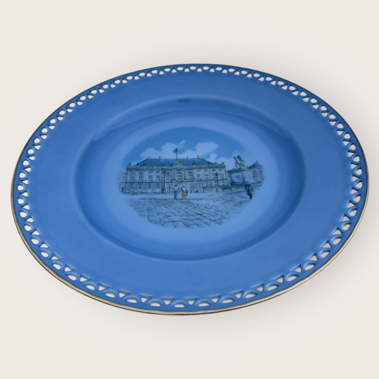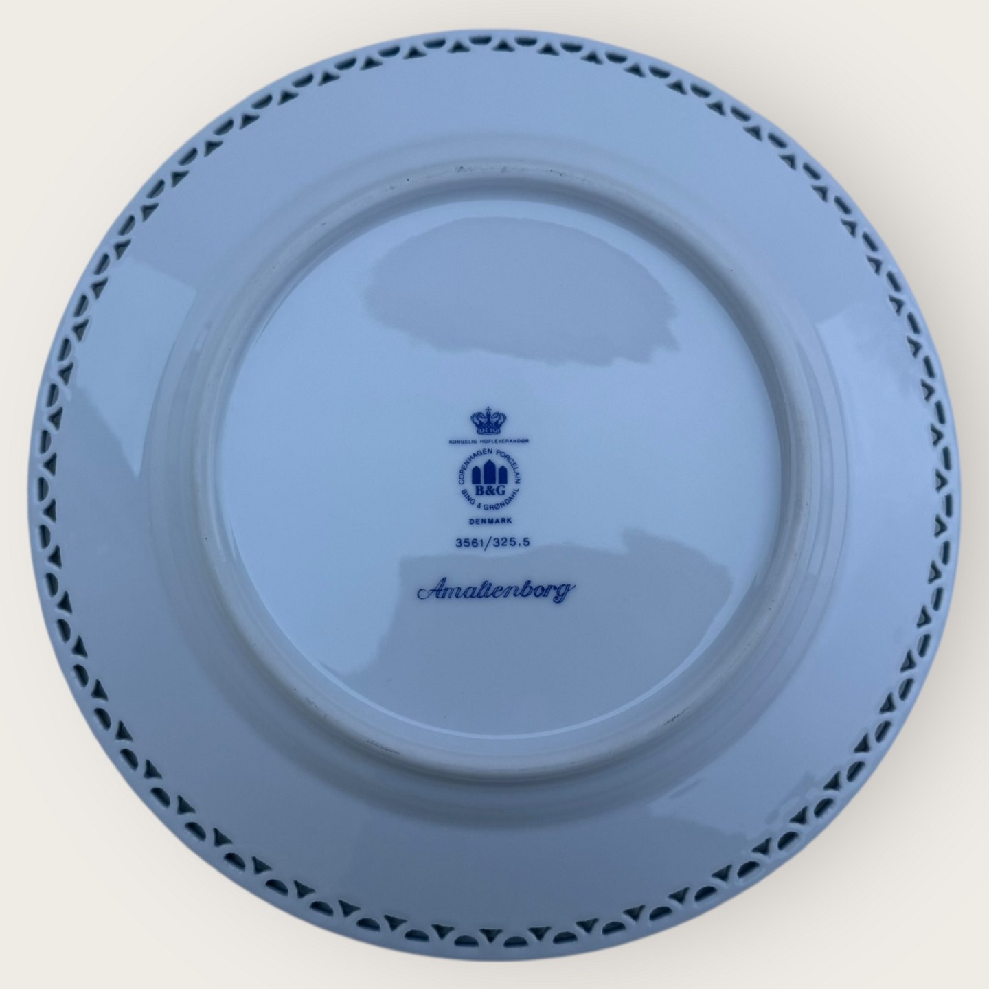 Beskrivelse: Bing & Grøndahl, Danmarksstellet, Amalienborg, Middags tallerken med gennembrudt blonde, Frederiksborg #3561/325,5, 25,5cm i diameter *pæn stand*