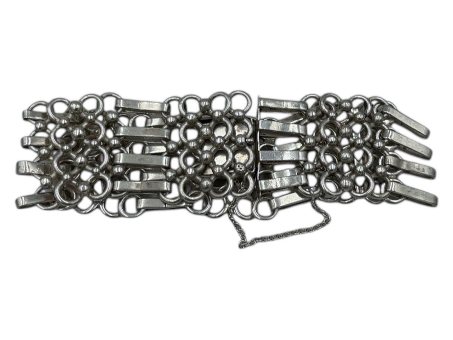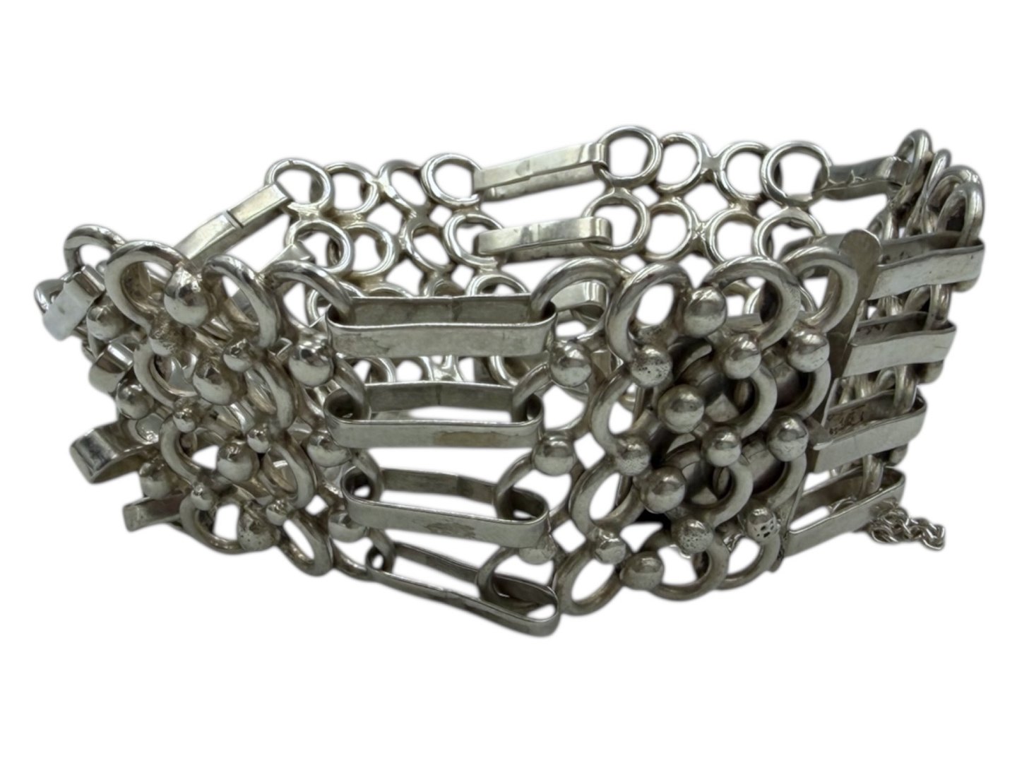 Beskrivelse: Bredt og tungt sølv armbånd fra ca. 1970.