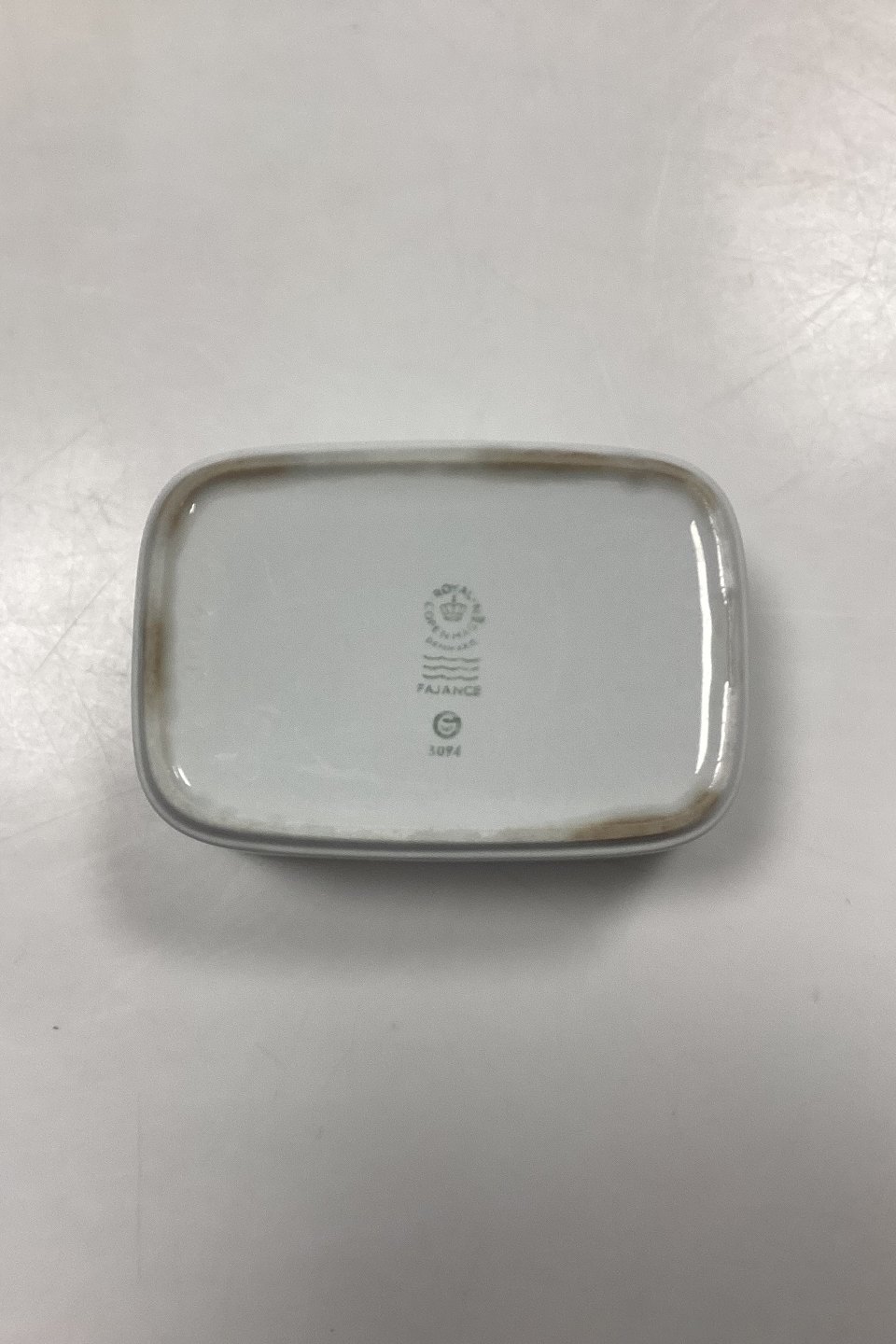 Beskrivelse: Royal Copenhagen Blåkant Smørboks uden låg No. 3094. Skjolder med farveforskel i fajancen, se fotos.