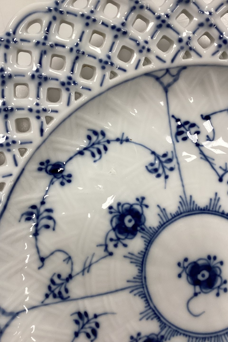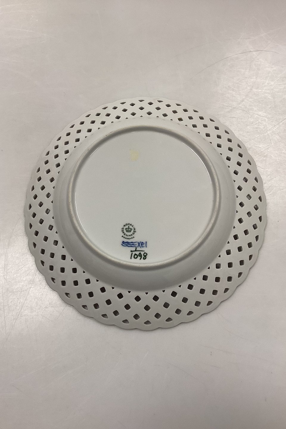 Beskrivelse: Royal Copenhagen Musselmalet Helblonde med gennembrudt kant Flad Tallerken No. 1/1098.