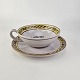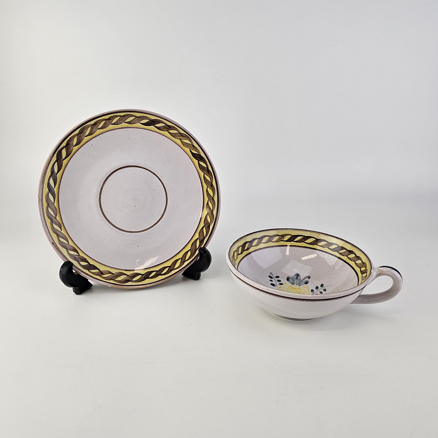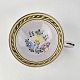 Beskrivelse: Kop og underkop i keramik med gule detaljer og blomsterdekoration