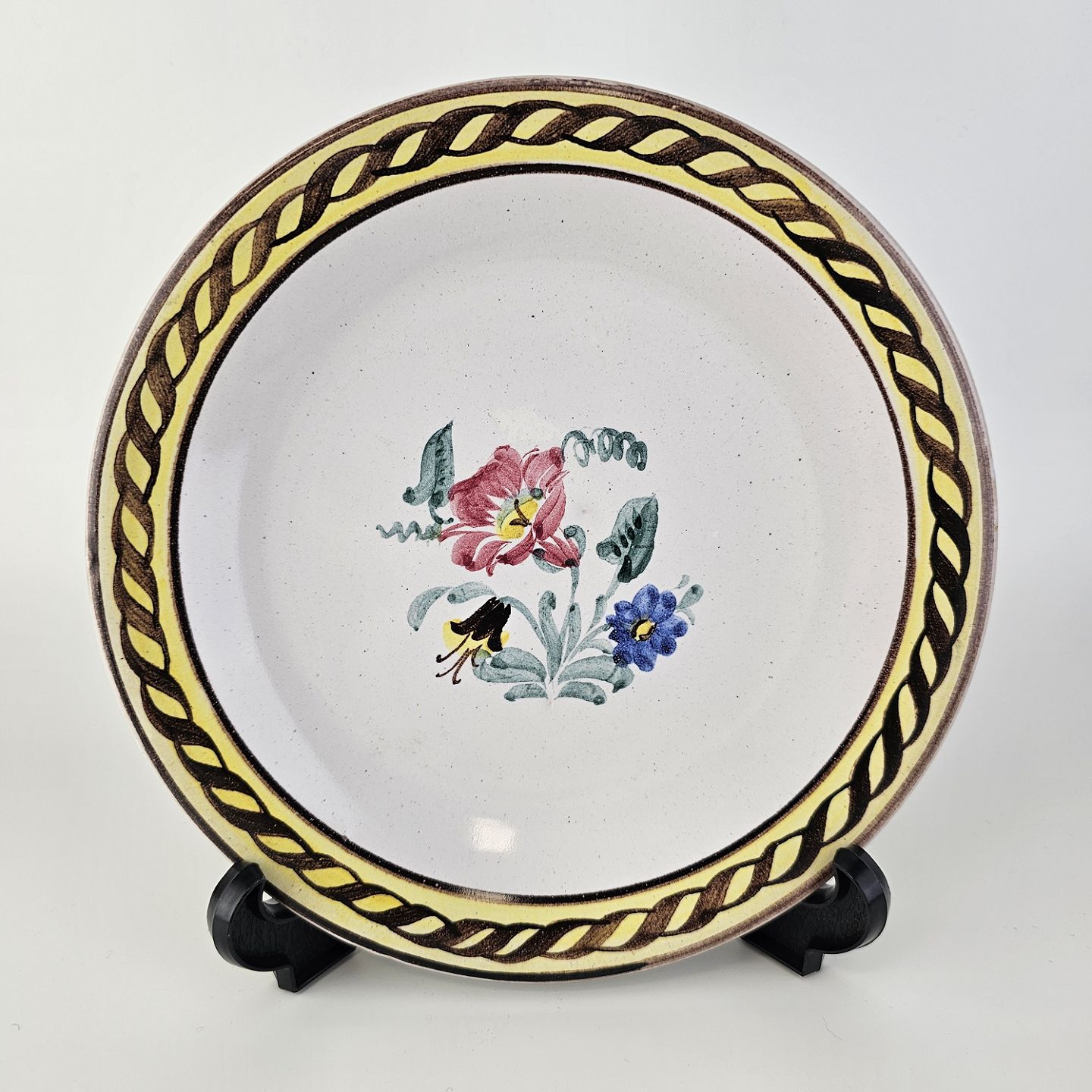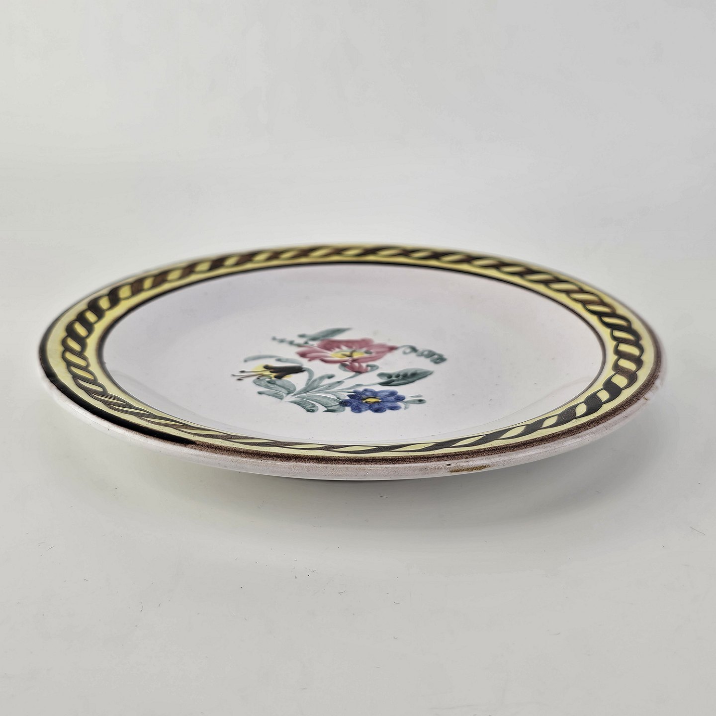 Beskrivelse: Desserttallerken i keramik med gule detaljer og blomsterdekoration