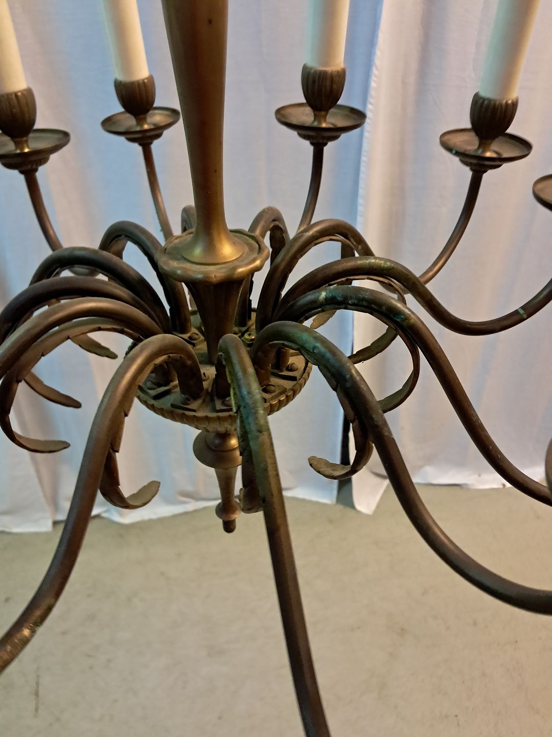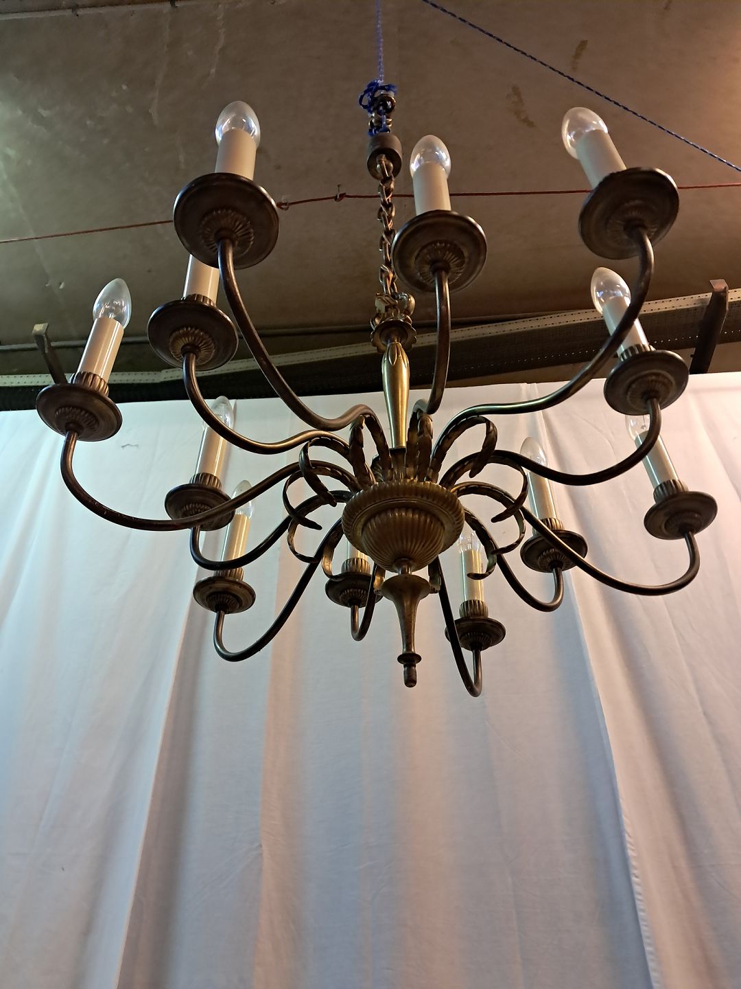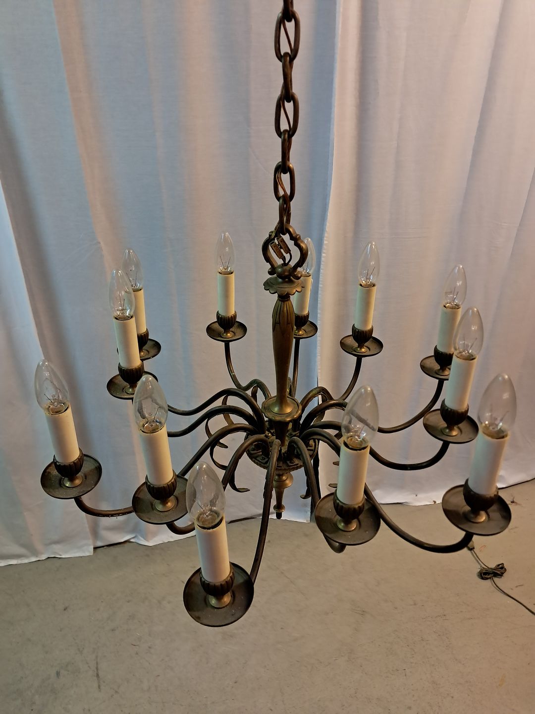 Beskrivelse: 12-armet lysekrone i messing, fra 1950erne.