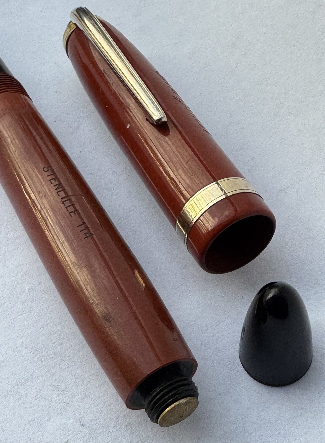 Beskrivelse: Koral rød Montblanc nr. 216 fyldepen. Push button filler. Fremstillet I Tyskland i 1950’erne. Fremstår I god stand uden skader eller reparationer. Alle dele originale Montblanc fra produktionsperioden med bl.a flot nr. 6 spids i 14 karat guld. Indgraveret STENLILLE 114 på siden af pennen. L.13,8 cm