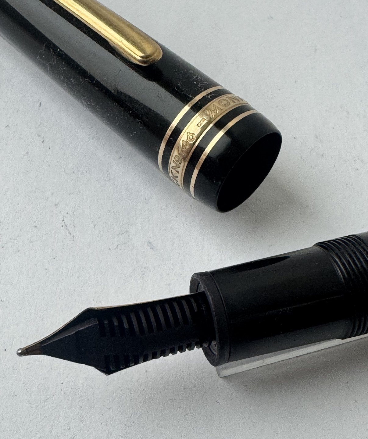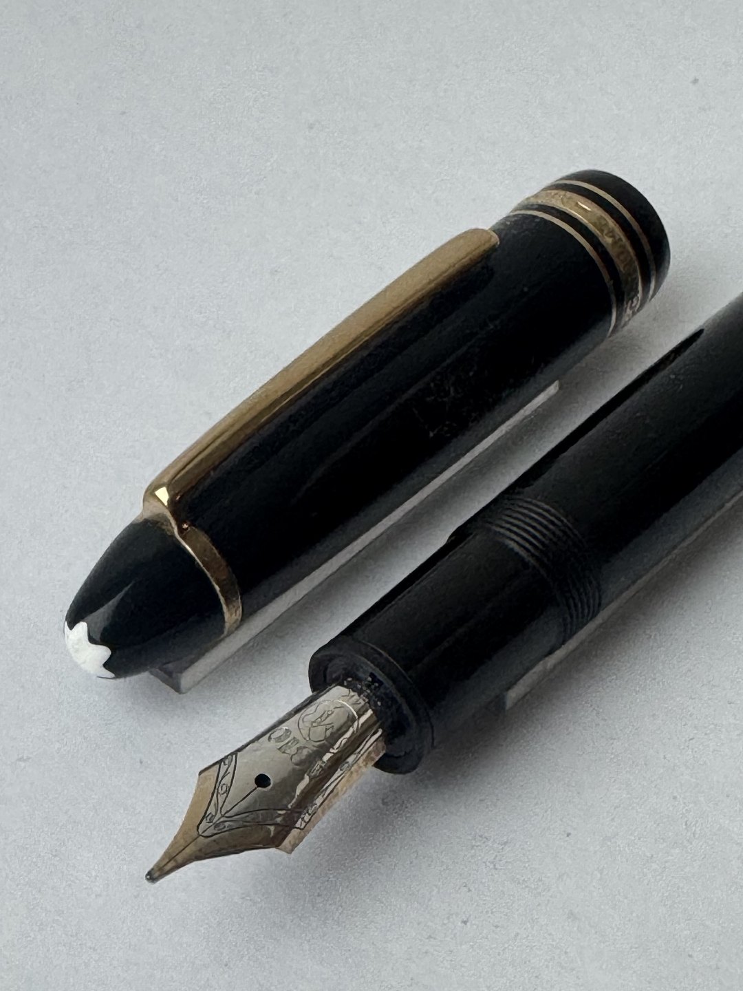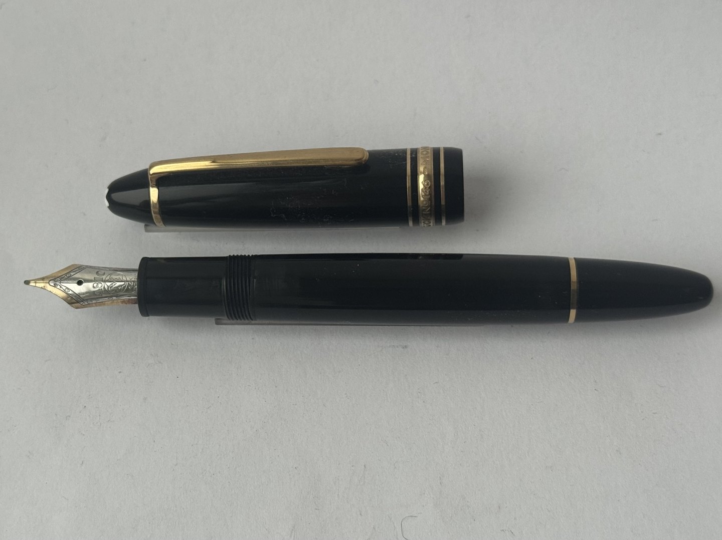 Beskrivelse: Sort Montblanc Meisterstück LeGrand fyldepen med alle originale Montblanc dele inklusiv en stor guldspids i 14 karat. Blækpåfyldning med piston filler. I god stand og klar til at blive brugt. L. 14,3 cm.