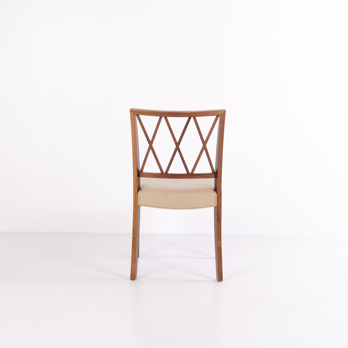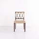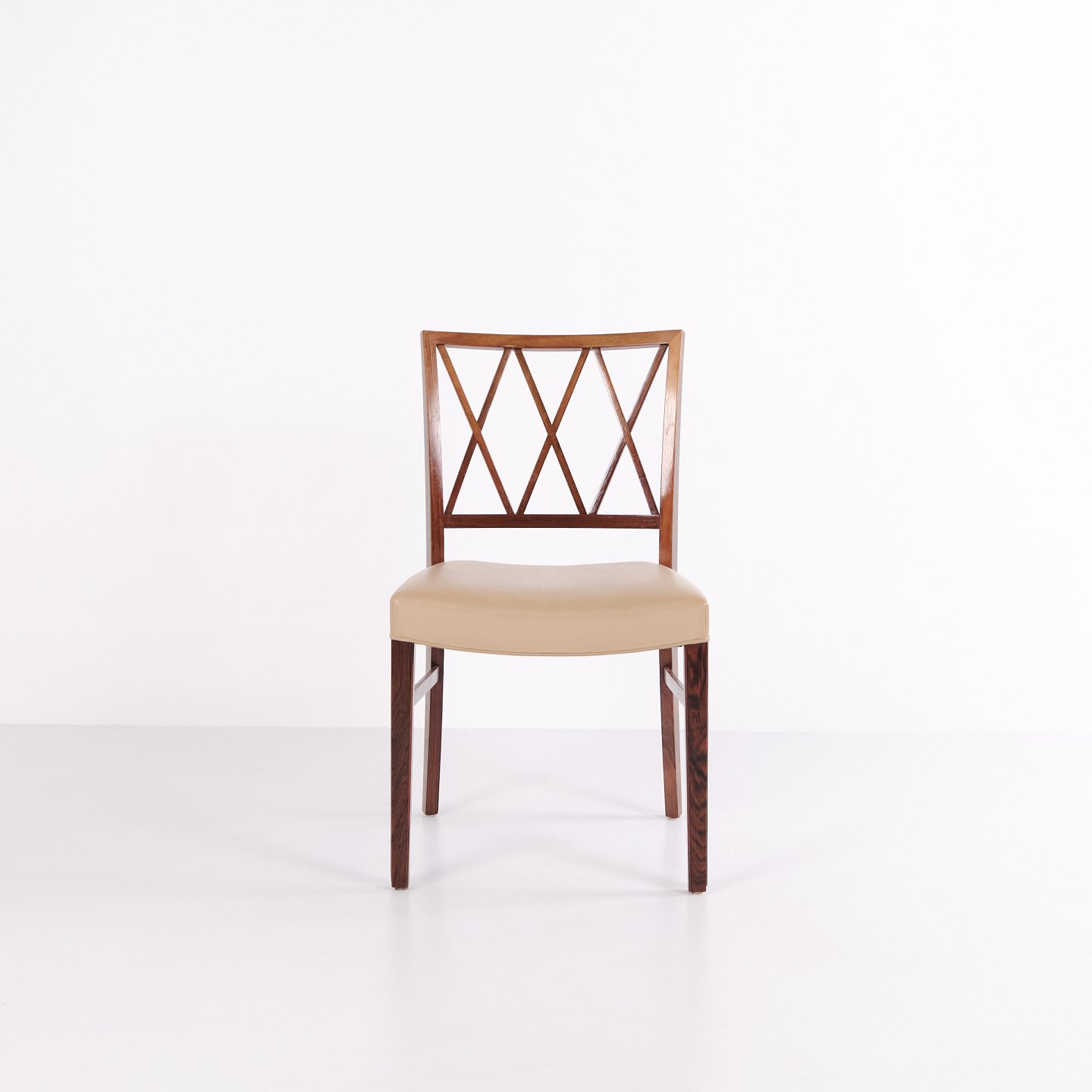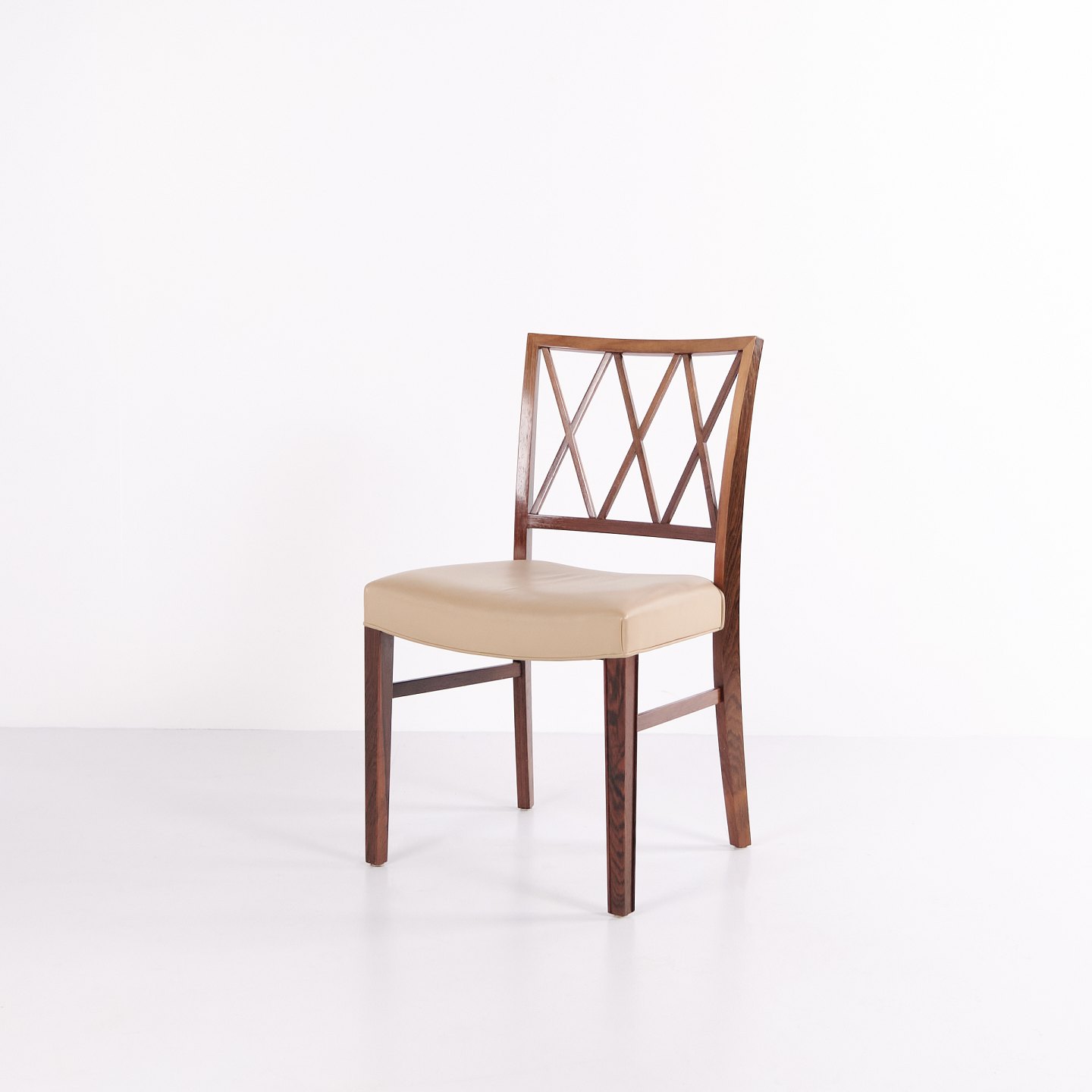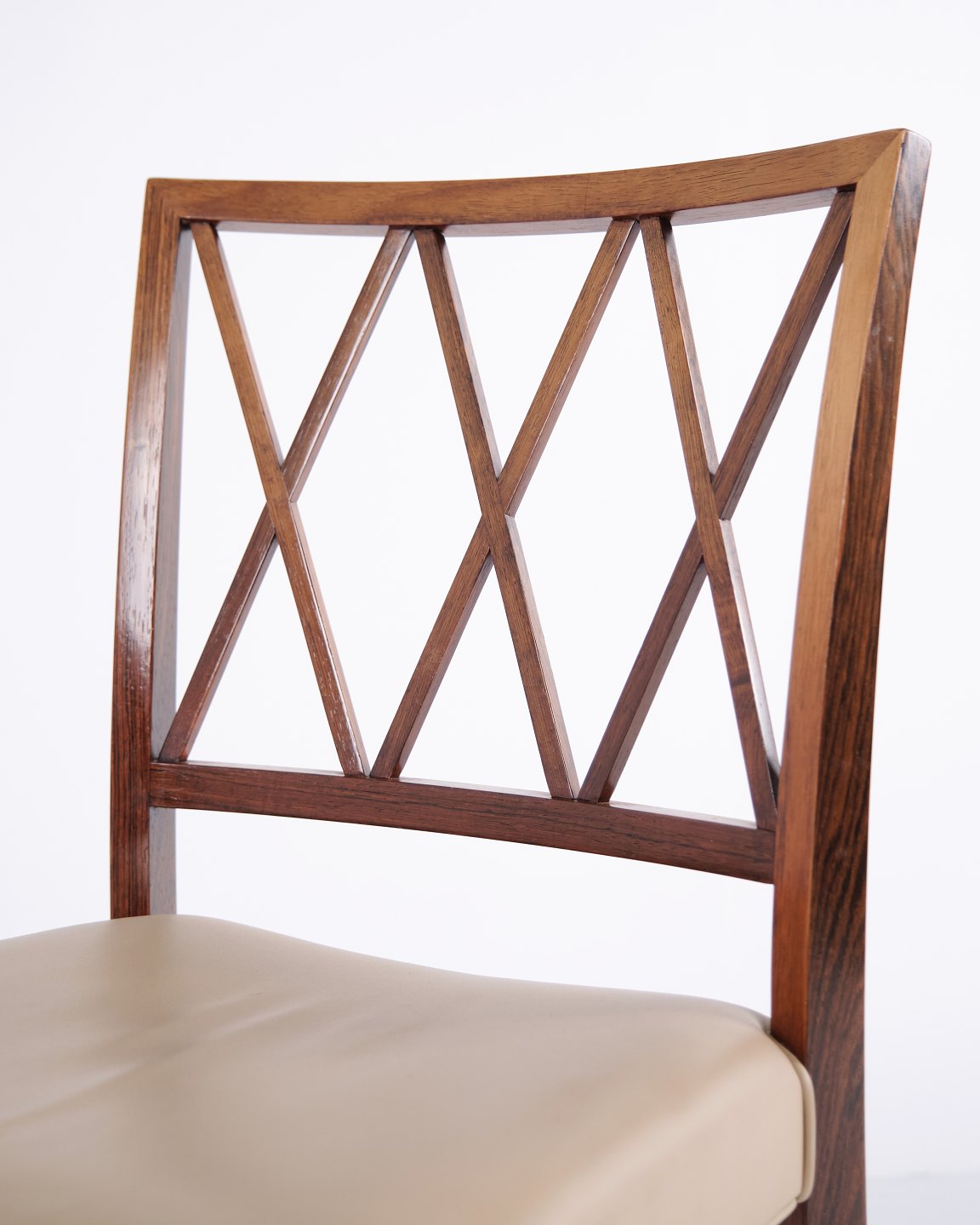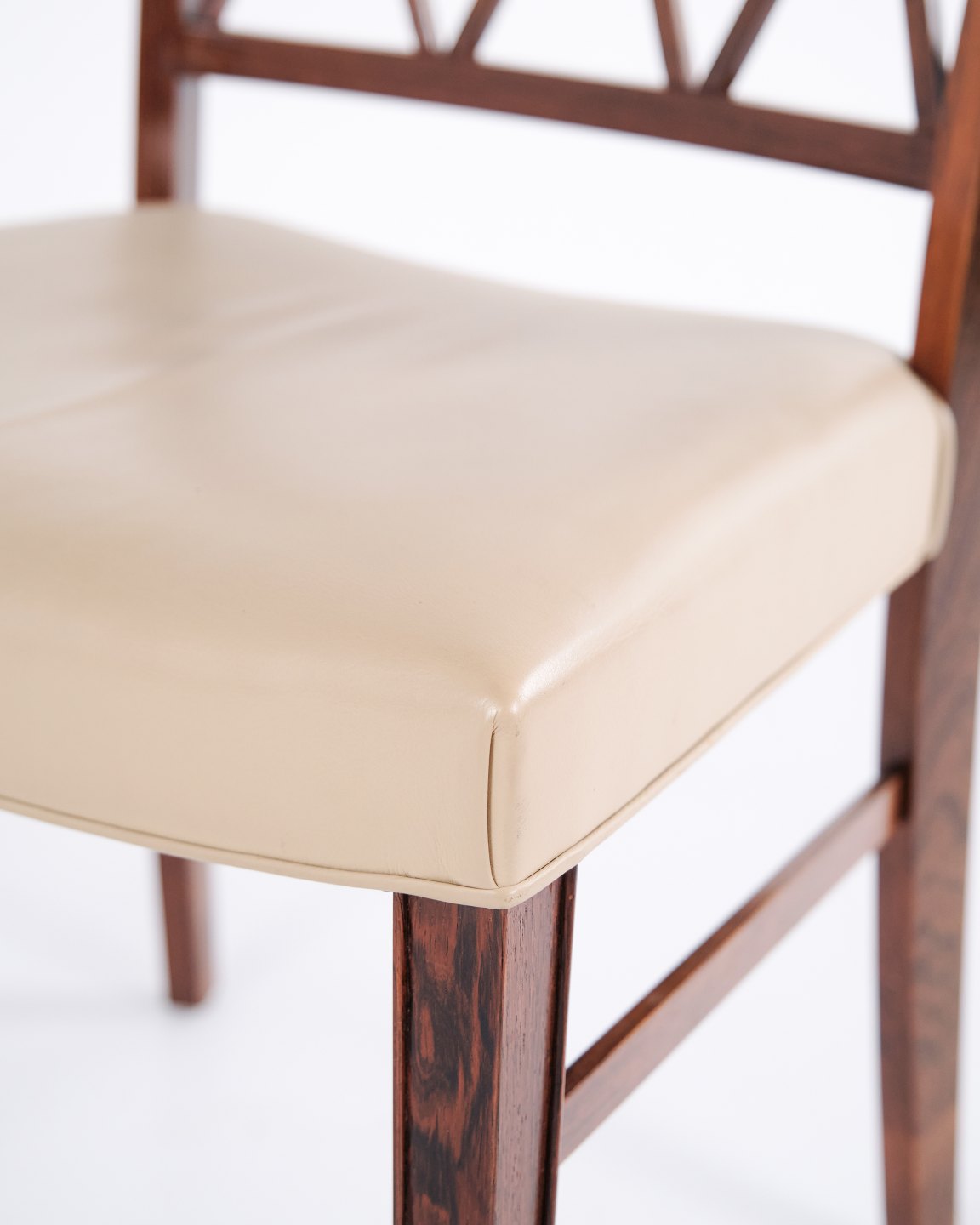 Beskrivelse: Sæt af fire spisebordsstole af Ole Wanscher for A.J. Iversen. Palisander og cremefarvet læder. Dansk design fra 1960’erne.
