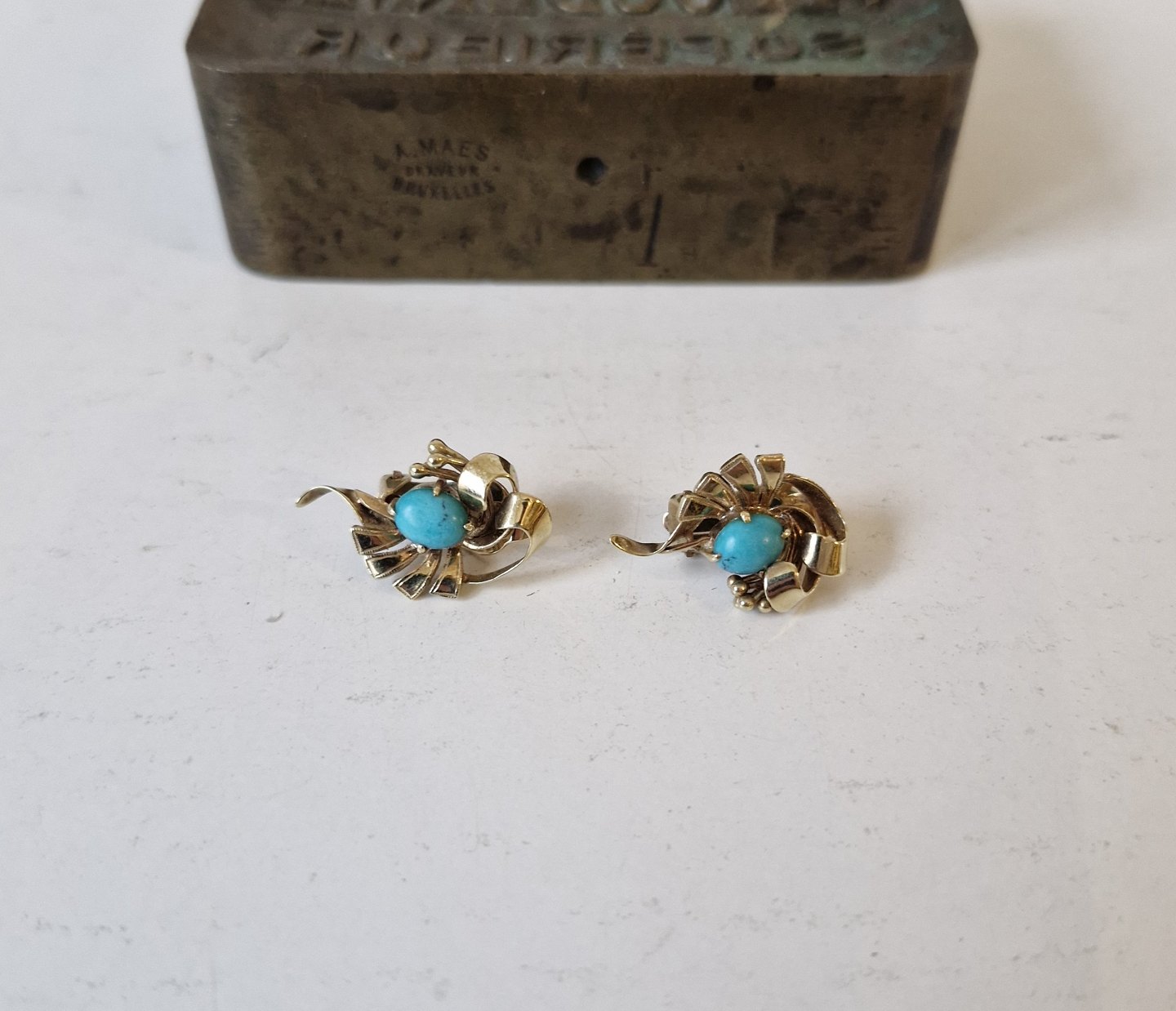 Beskrivelse: Par smukke øreklips i 14 kt guld med turkis