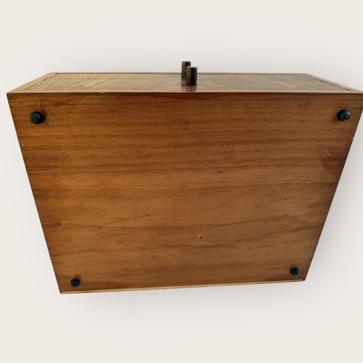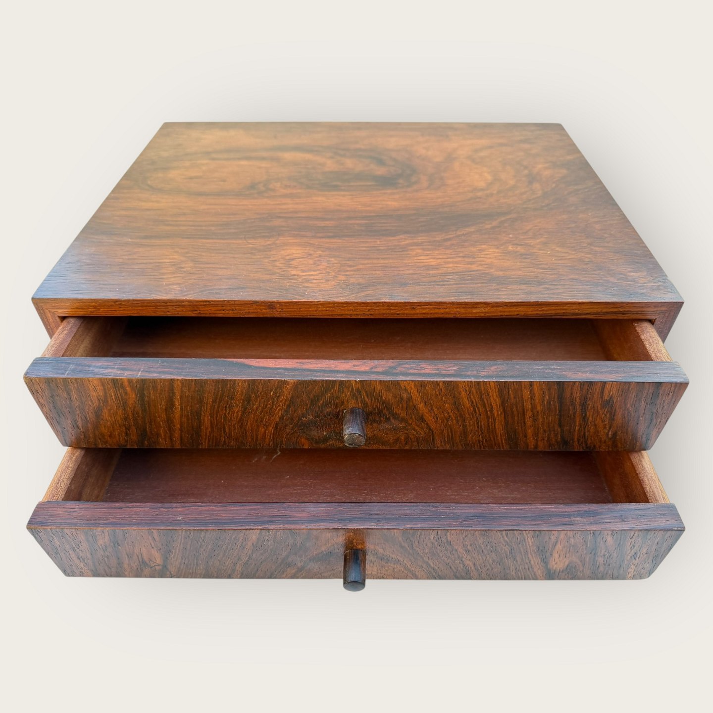 Beskrivelse: Palisander skrin med 2 skuffer, Danish modern fra 1960'erne, fremstår i rigtig pæn stand med få brugsspor, Mål: 32x25x12cm