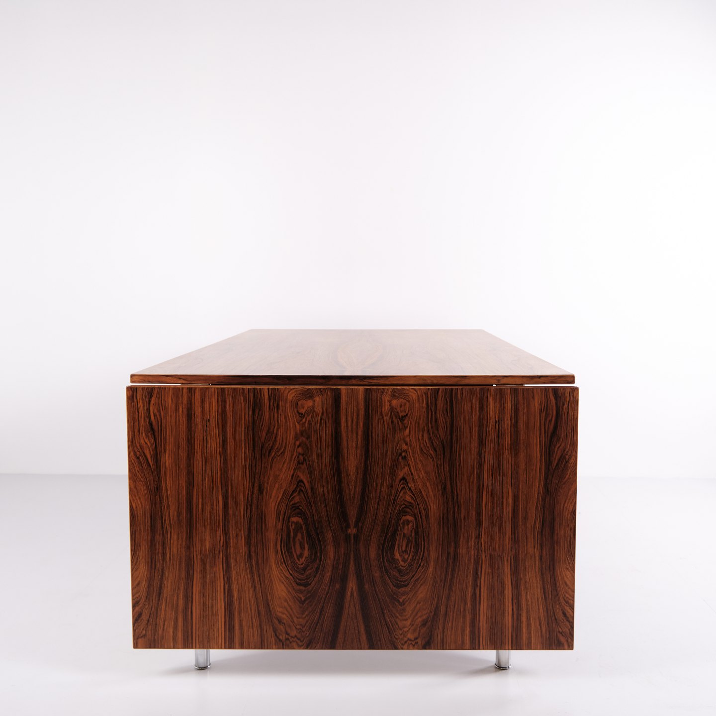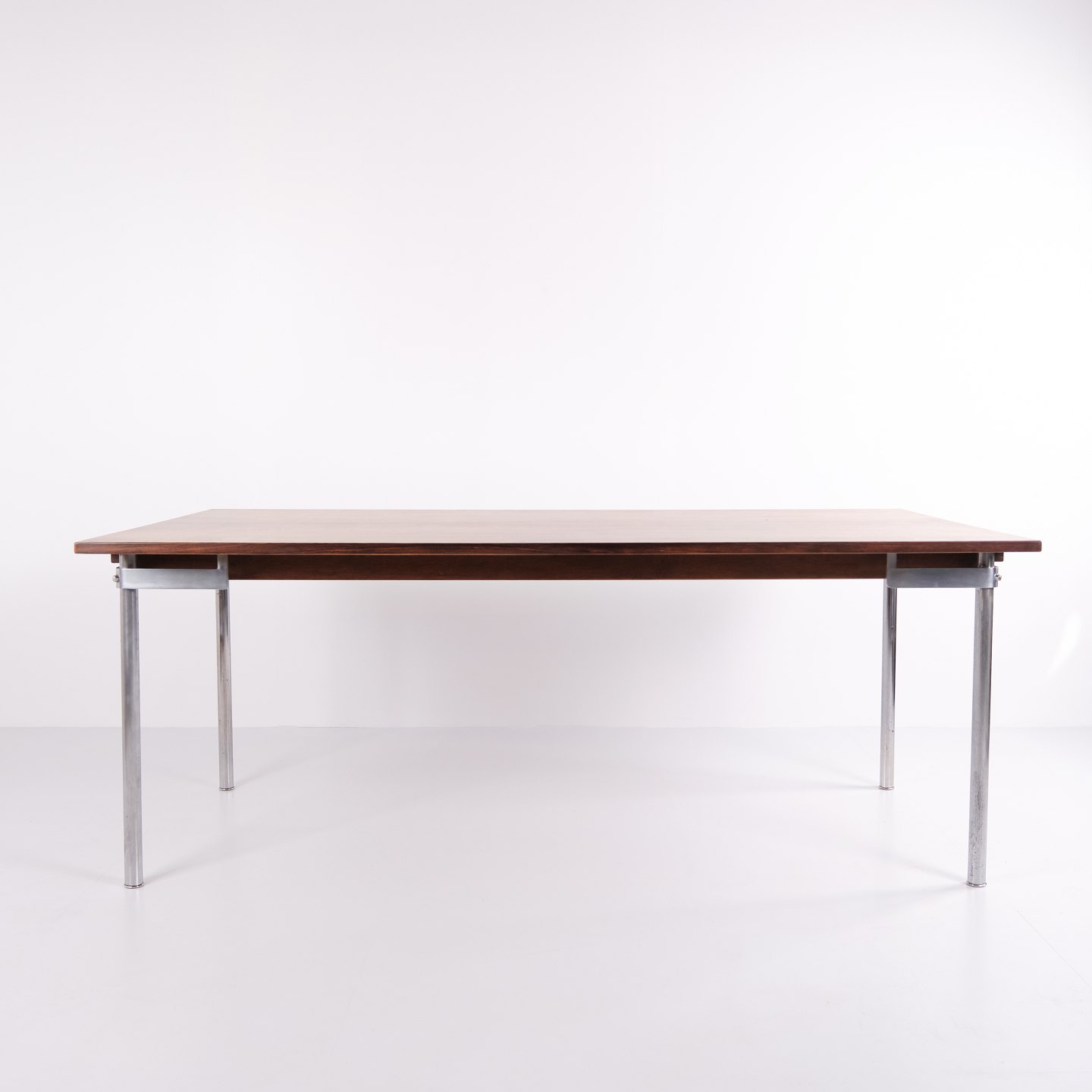 Beskrivelse: Spisebord model AT 319 af Hans J. Wegner for Andreas Tuck. Riopalisander med stålben og 2 tillægsplader. Dansk design fra 1960’erne.