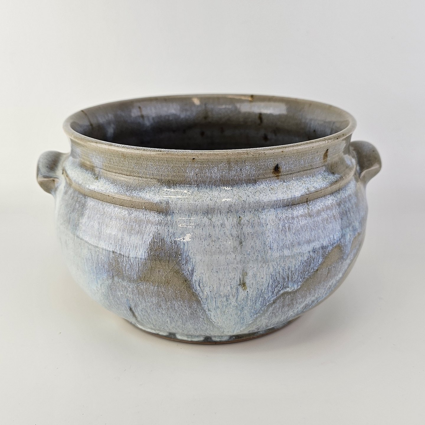 Beskrivelse: Blålig og grønlig keramik unika skål med 2 hanke med krakkeleringer i glasuren.