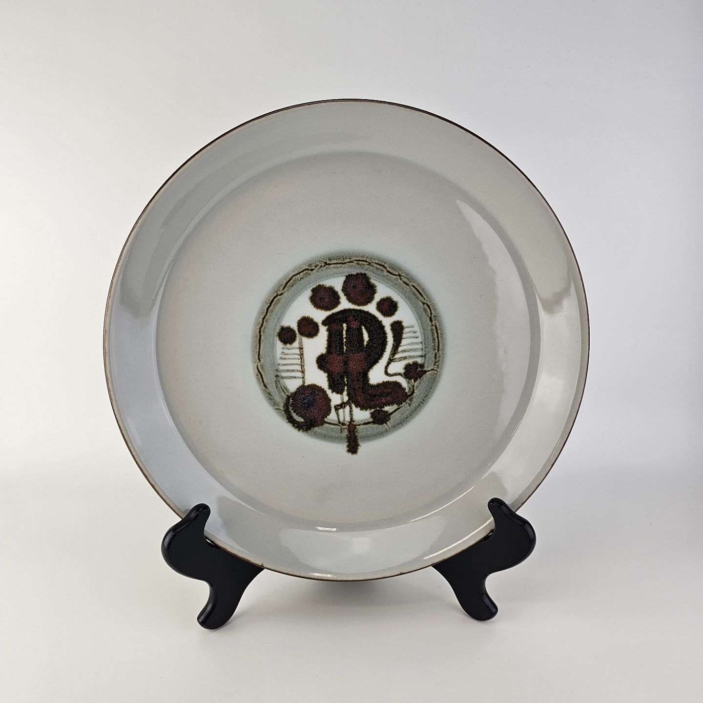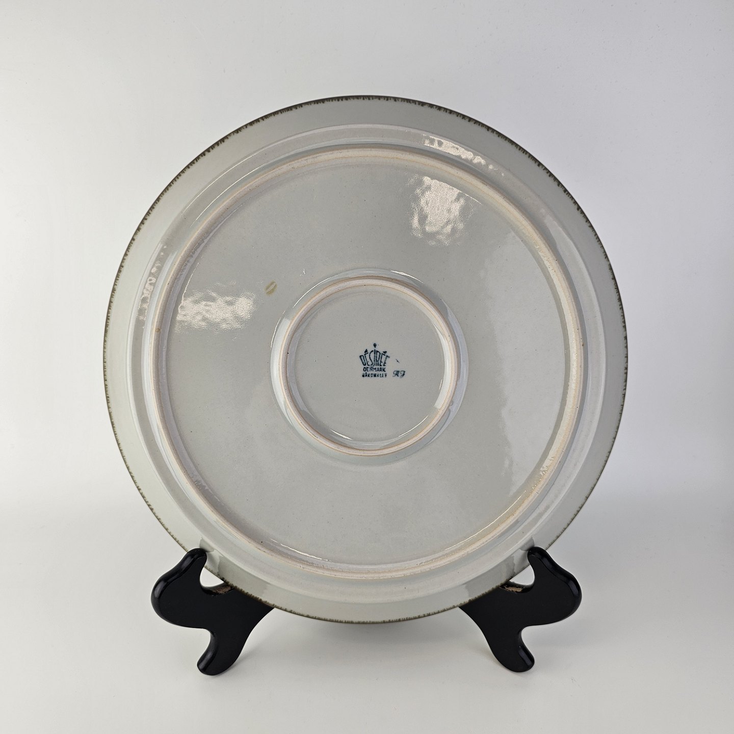 Beskrivelse: Rundt fad i stellet Thule, grålig tone med mønster midt for.