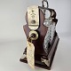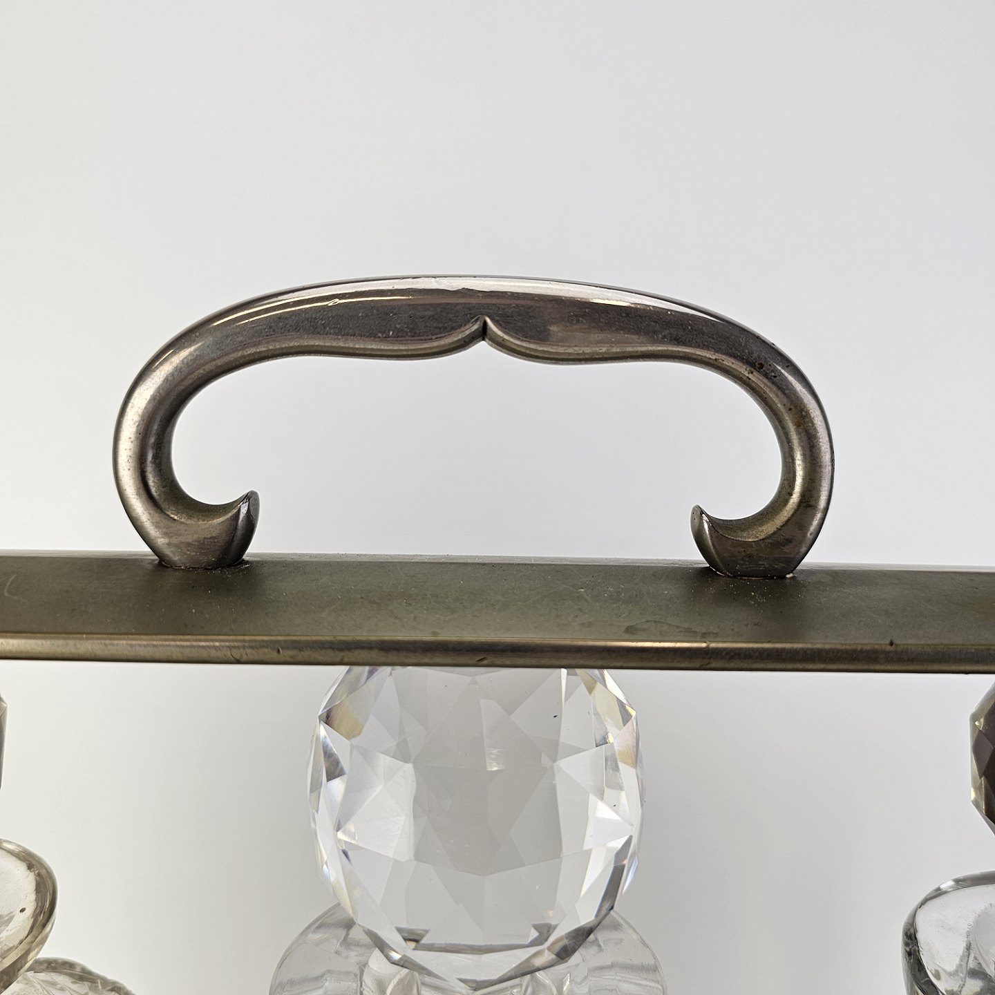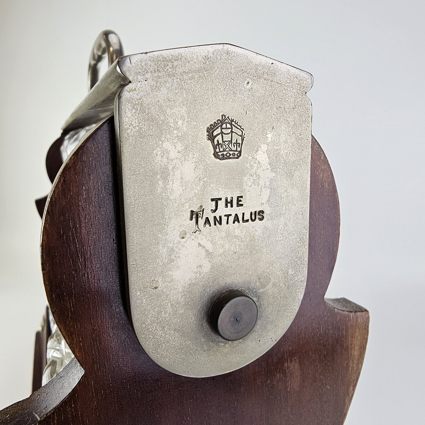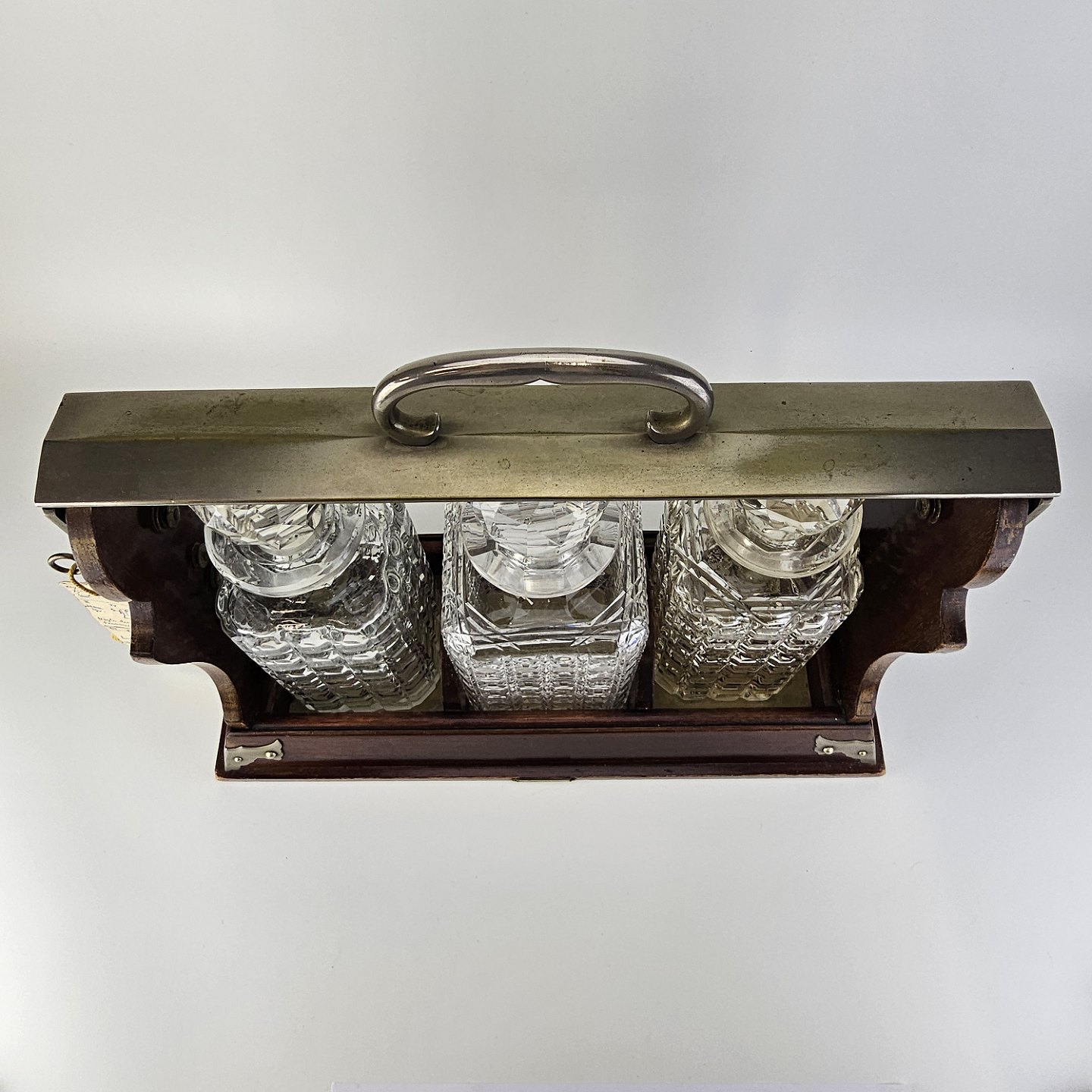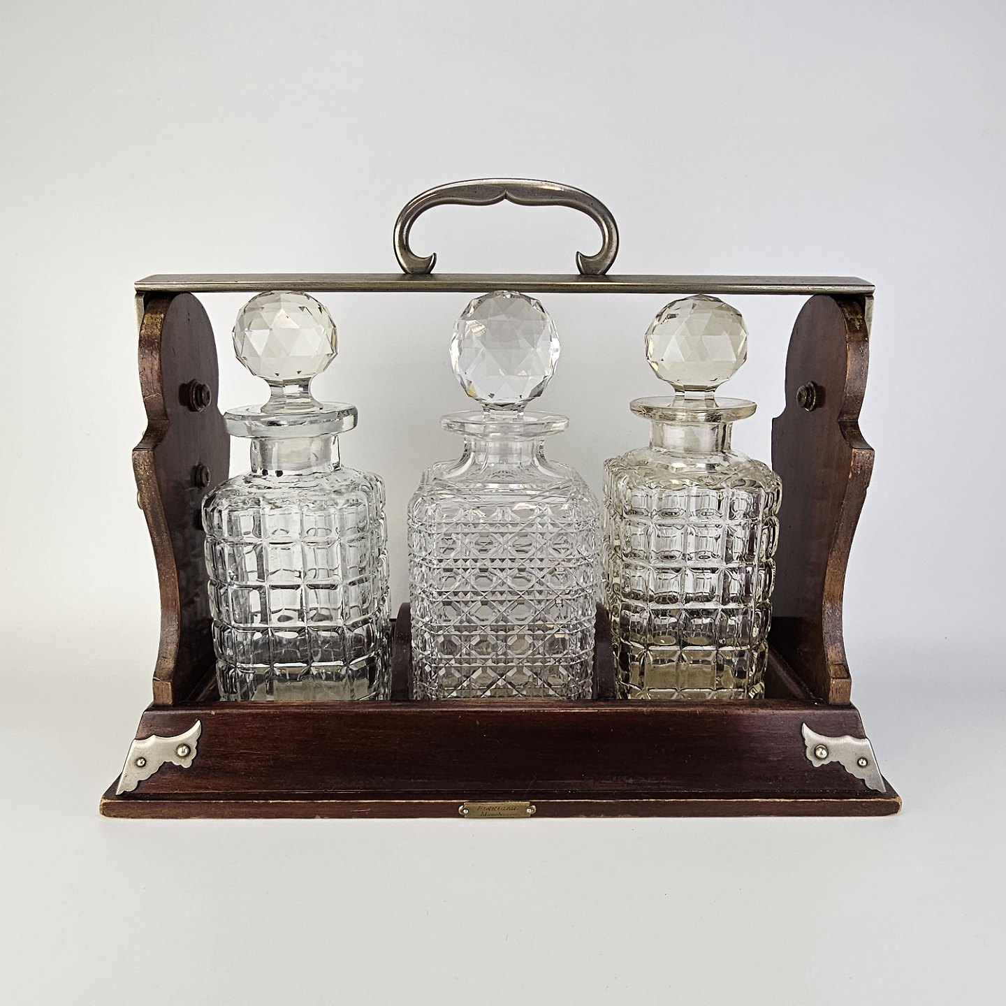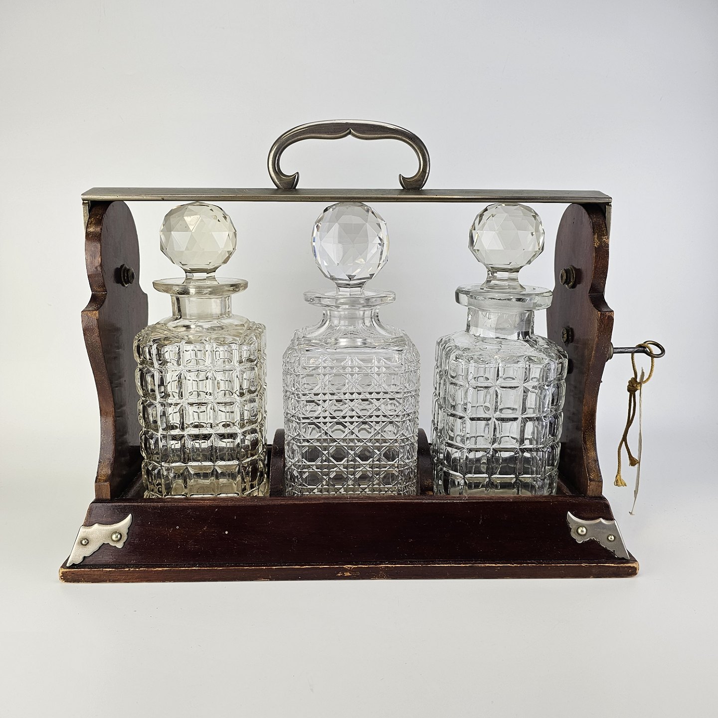 Beskrivelse: Tantelus med 3 firkantede karafler, formentlig ikke originale, da der er forskel på dem. Med rund glas kugleformet prob. Lås virker fint.